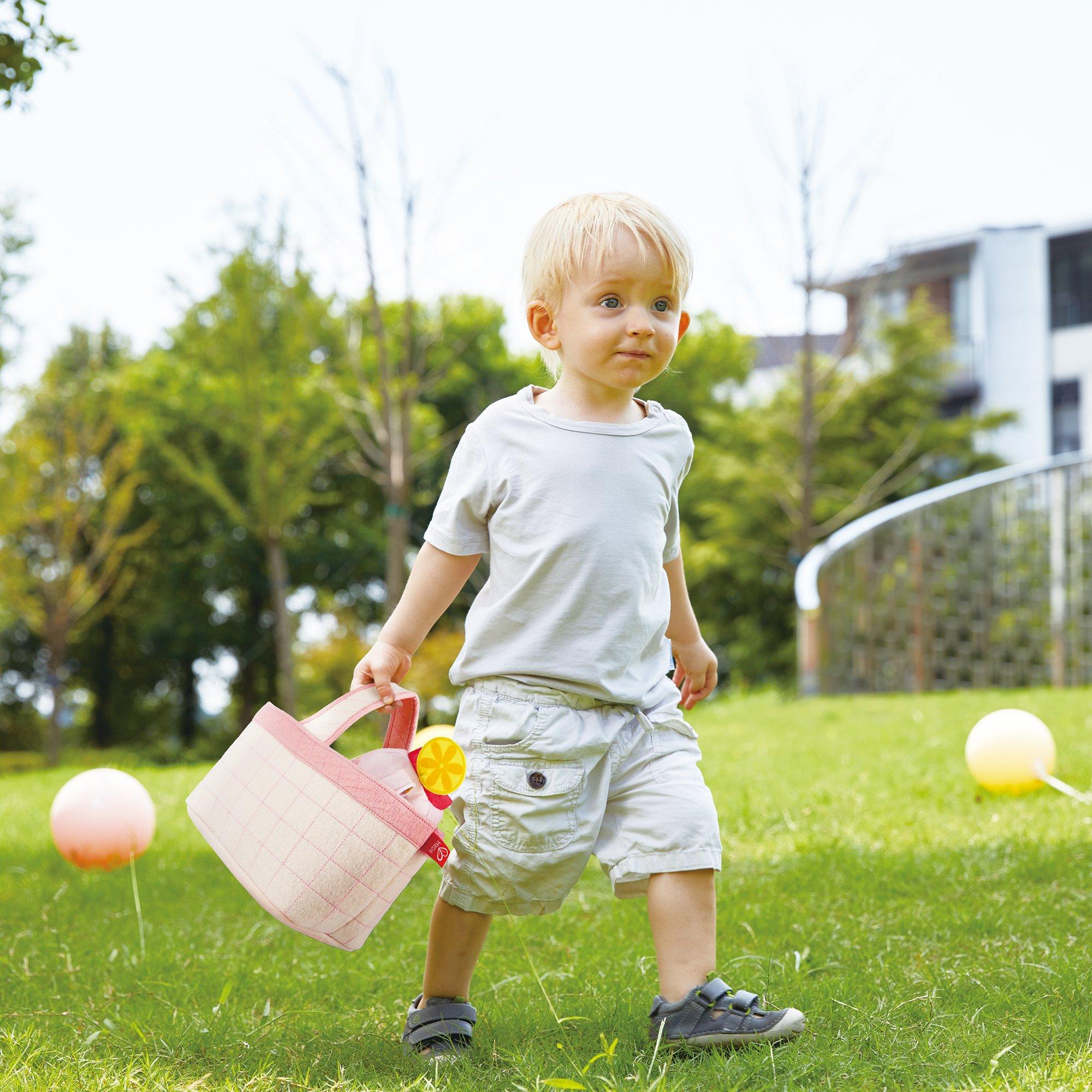 KITCHEN PLAYSET: TODDLER PICNIC SET – Find your perfect spot then unpack your basket for a delicious picnic! Includes one fabric basket, one picnic cloth, three bottles of beverages, two strawberries and two pieces of bread, one lettuce leaf, one slice of tomato, and one piece of cheese to make a sandwich with! The food items are made from soft sponges making them fun and easy for little hands to grip and hold. This fun set is perfect for developing role play, language skills, and a love of being outdoors.