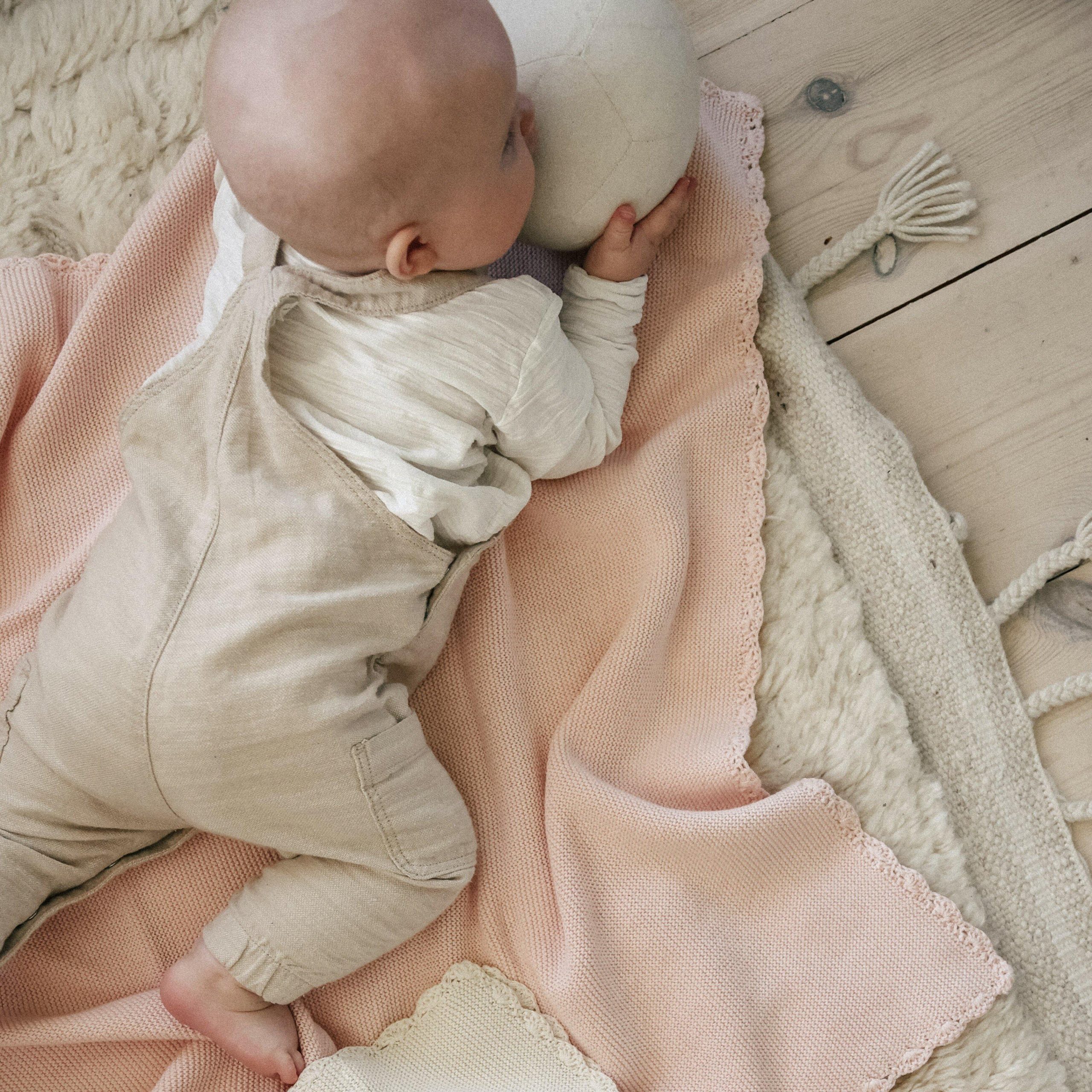 • Here is the perfect gift! An everyday staple, this perfectly sized knit blanket is made for mornings in the nursery, stroller walks, and plenty of cozy moments. Knit from 100% Cotton with a cozy handstitched scalloped pattern. We love cotton because it is sustainable, kind to the skin, regulates body temperature, is highly absorbent, luxurious and durable.