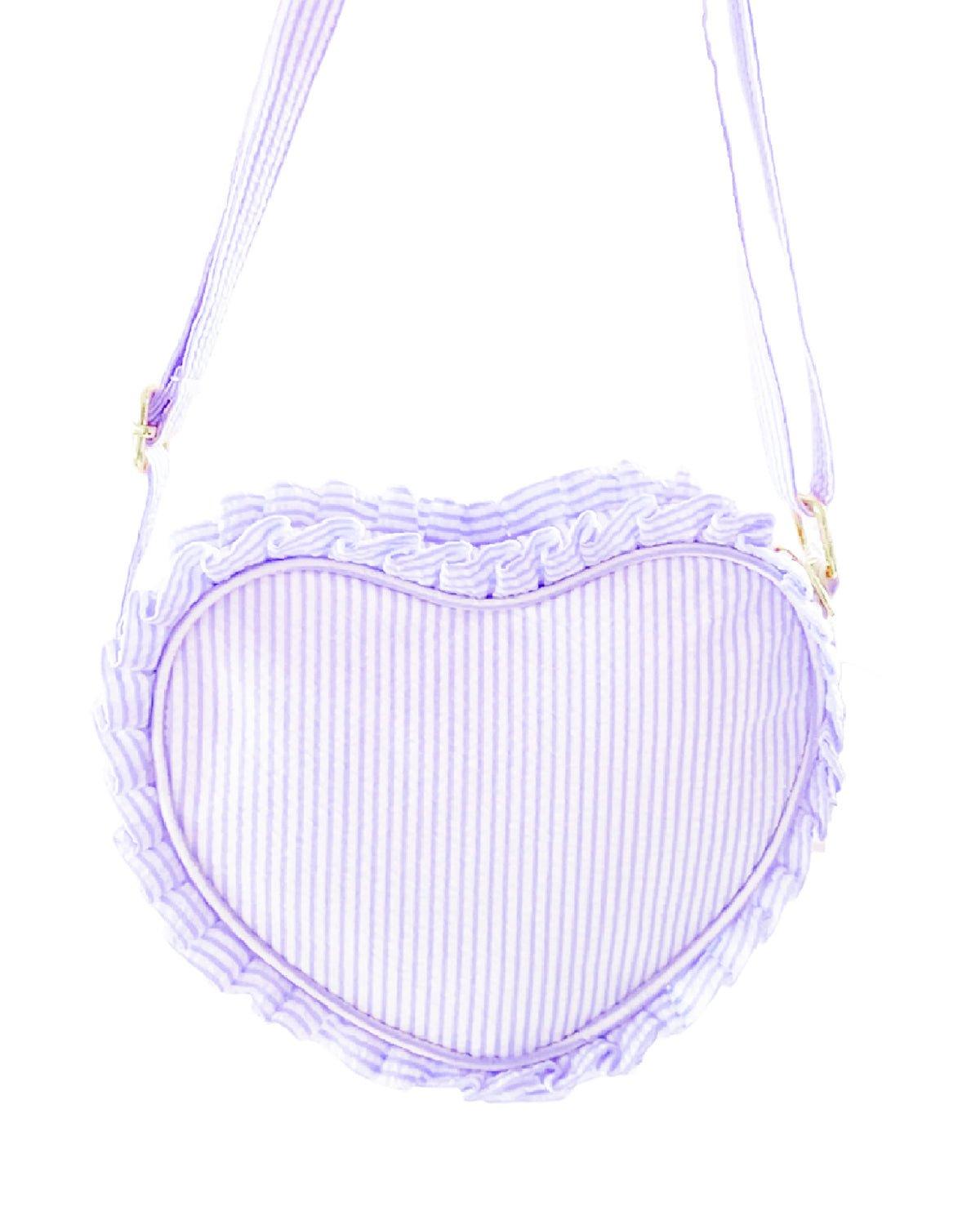 Every little girl-on-the-go needs a go-to bag as sweet and special as she is. With a soft, striped lavender seersucker heart-shaped body, polished gold heart Bits & Bows logo charm and hardware, matching ruffle trim, adjustable crossbody strap, and wipe-clean lining, it’s a functional, feminine accessory she’s sure to just love season after season.