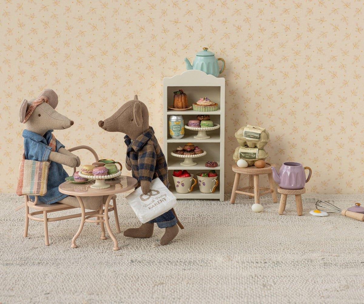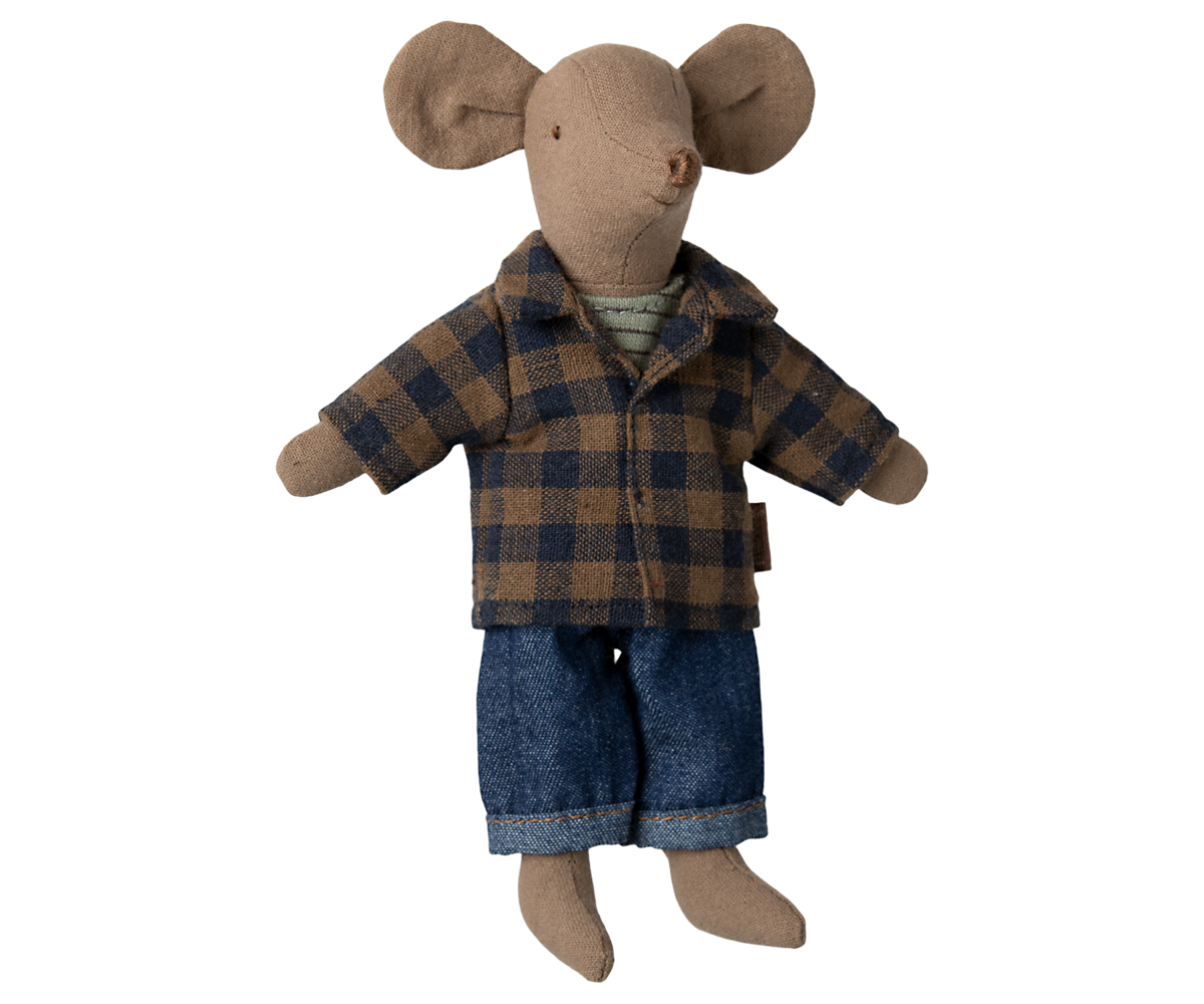 Dad mouse in light brown body fabric. He wears a checked shirt, tank top and denim pants. This mouse fits furniture and accessories in size mouse. Buy more clothes separately, clothes in size mum/dad fits this mouse.