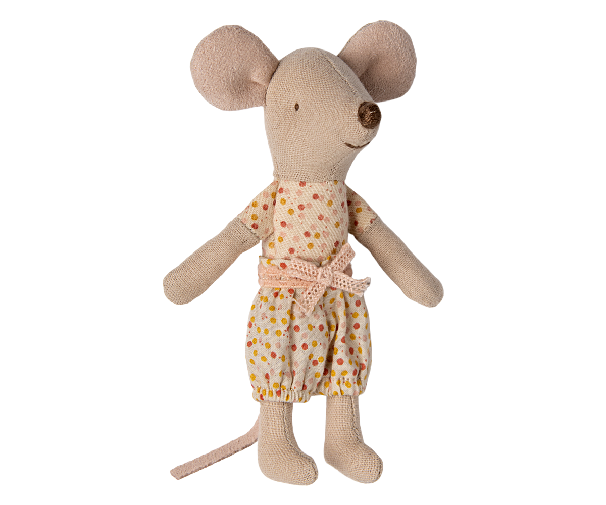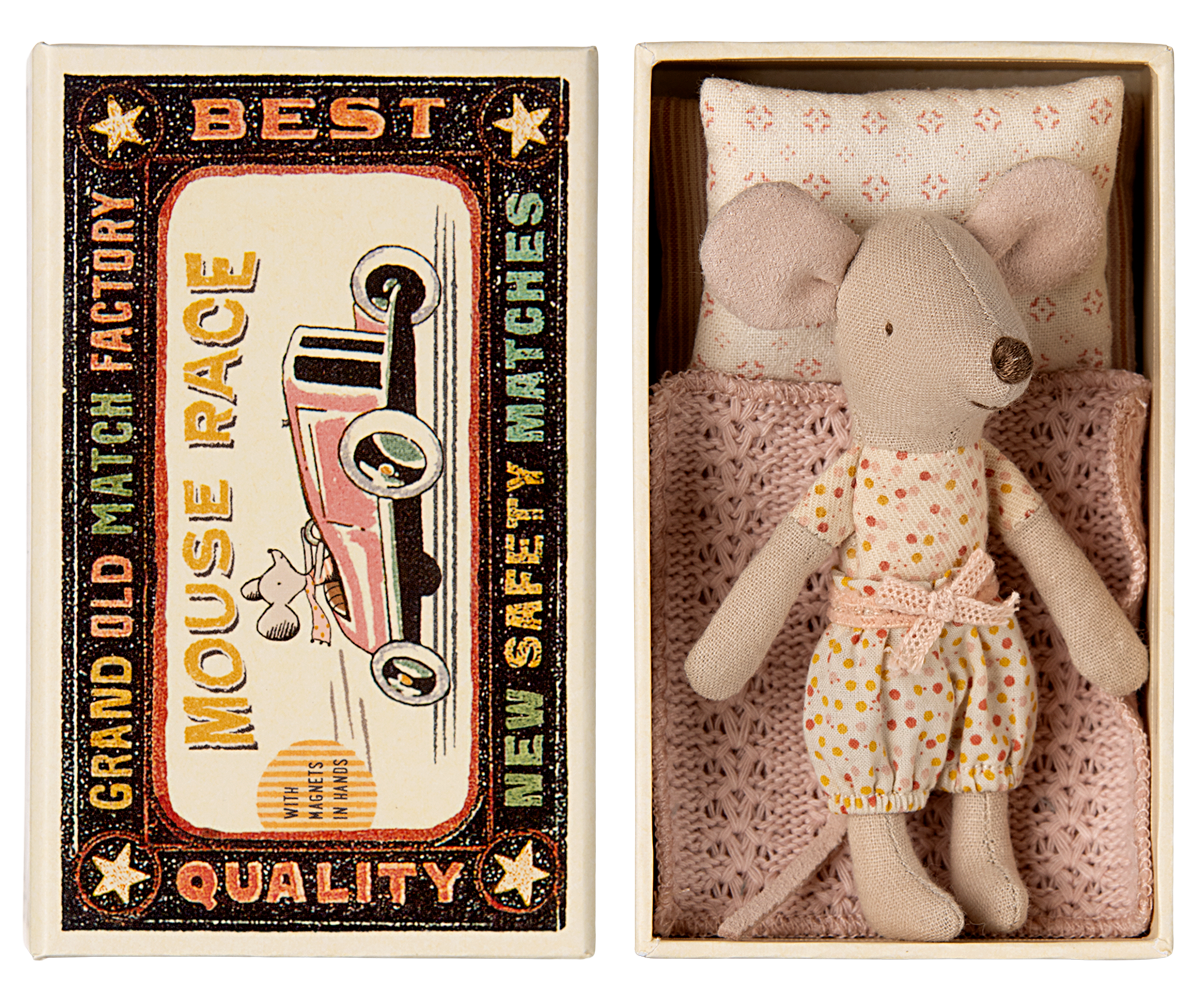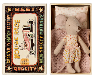 A classic Maileg item. This mouse is ready for hours of play and sleeps tight in the little matchbox. The clothes and bedlinen are made of soft fabrics with unique prints in beautiful colors. Extend the story by adding accessories to the play