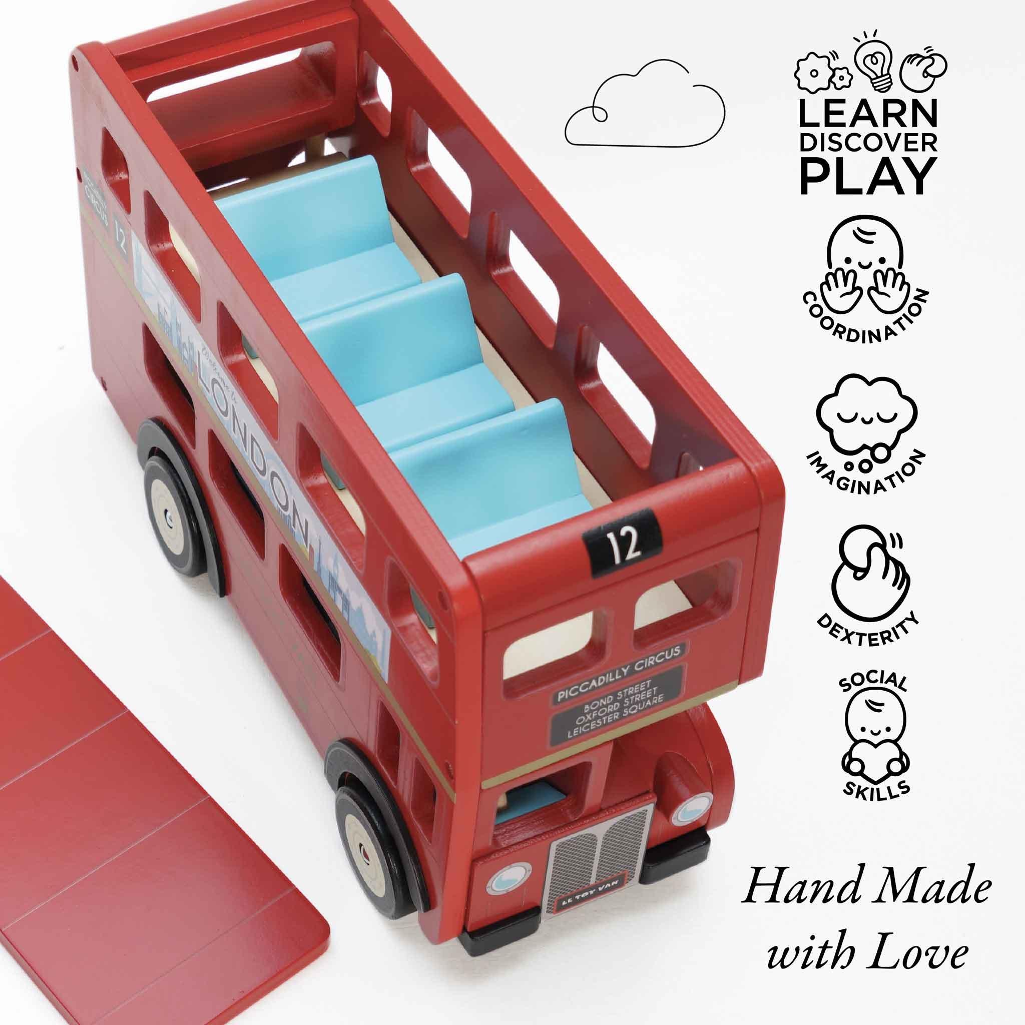 Explore the big city in style with this classic London bus toy. This iconic wooden toy is a multi award winner and long time favourite. With it’s brightly painted exterior in bold red and realistic signage detailing, little soft toy friends can hop aboard for fun sightseeing adventures.