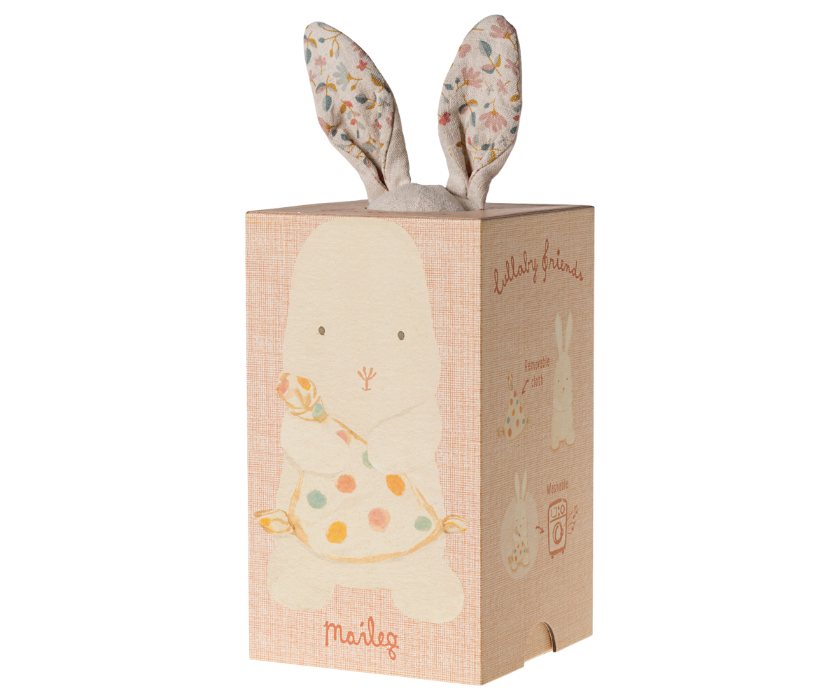 Lullaby friends is a collection of beautiful items for babies. This bunny has a soft cuddle cloth and will play a calm lullaby when you pull the tail. It is made in soft fabrics with unique prints and packed in a beautiful gift box.