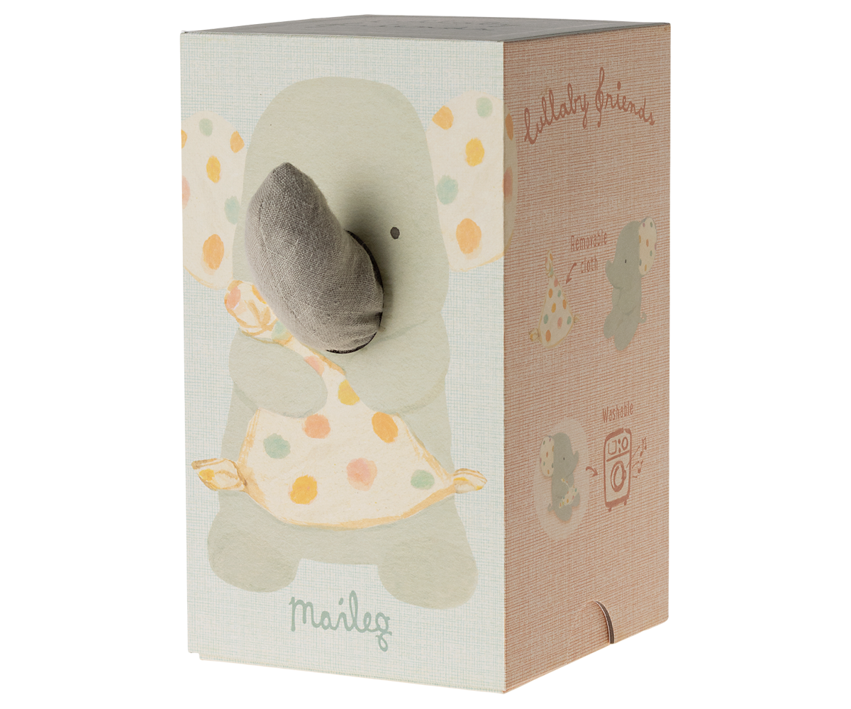 Lullaby friends is a collection of beautiful items for babies. This elephant has a soft cuddle cloth and will play a calm lullaby when you pull the tail. It is made in soft fabrics with unique prints and packed in a beautiful gift box.