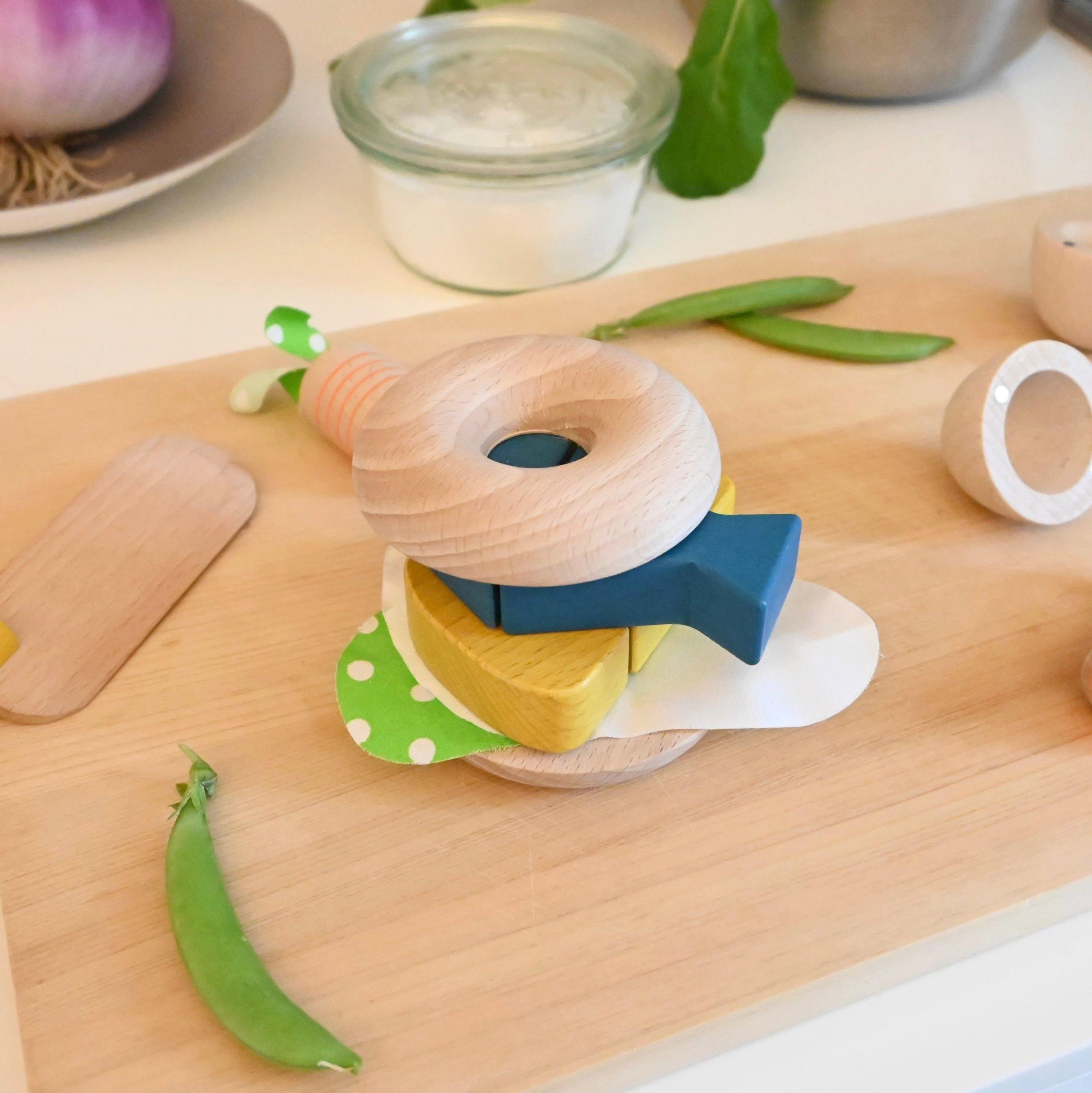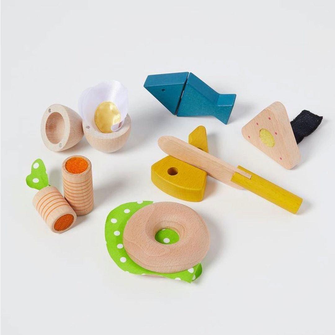 • Includes a wooden bagel, fish, rice ball with seaweed, egg, cheese, lettuce, and knife