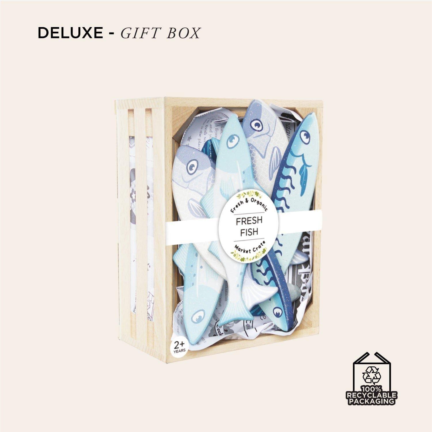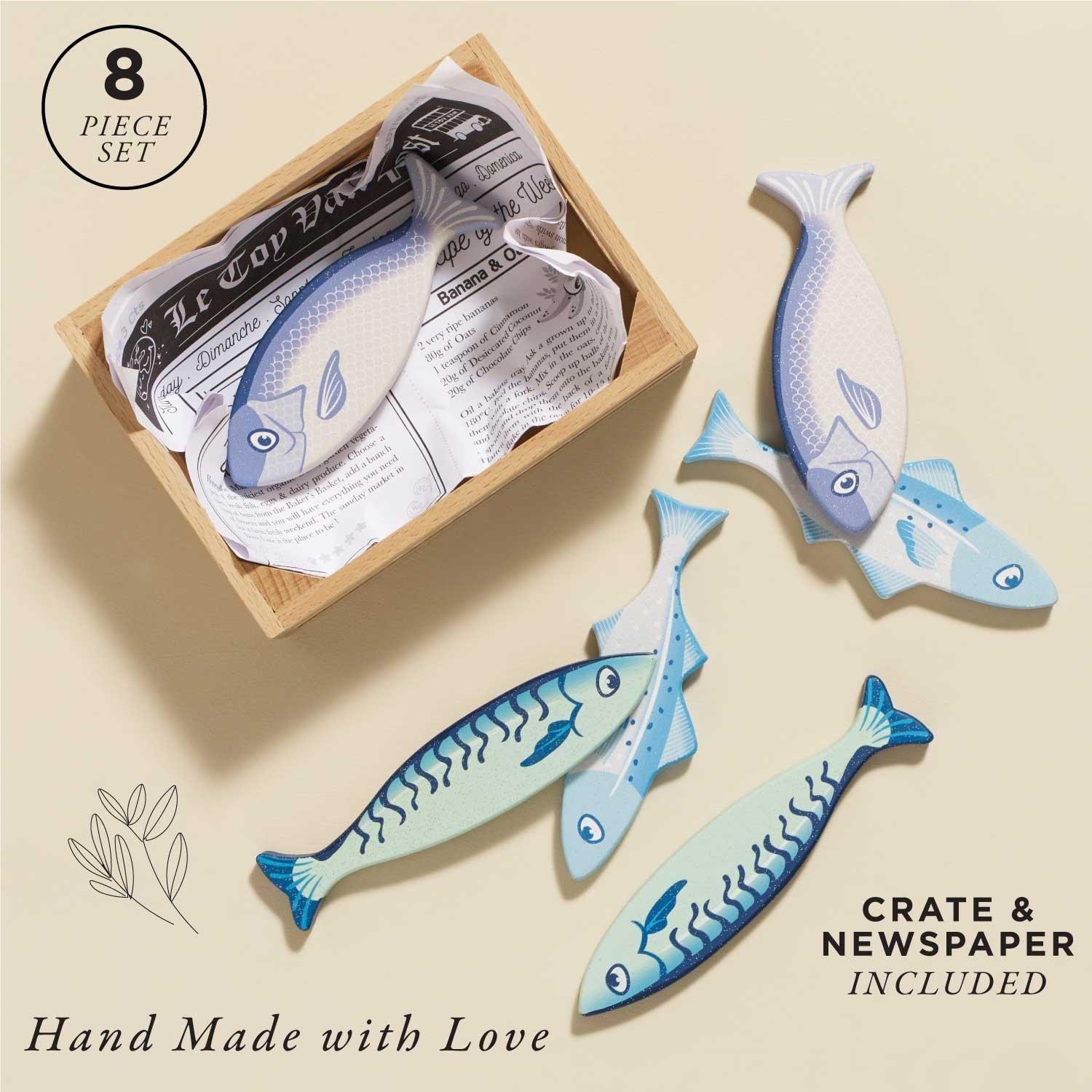 Market day fun awaits with this wonderful roleplay toy made from FSC®- certified wood for little imaginations. This wooden crate is lined with a newspaper themed insert and includes 6 tasty fish shaped play pieces, painted with non-toxic paints and finished off with a flourish of glitter for added fun.