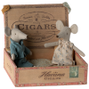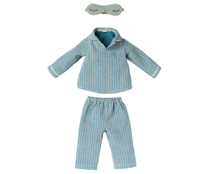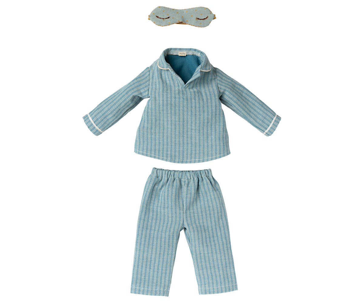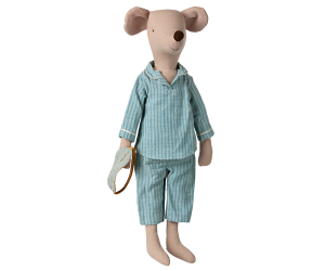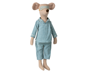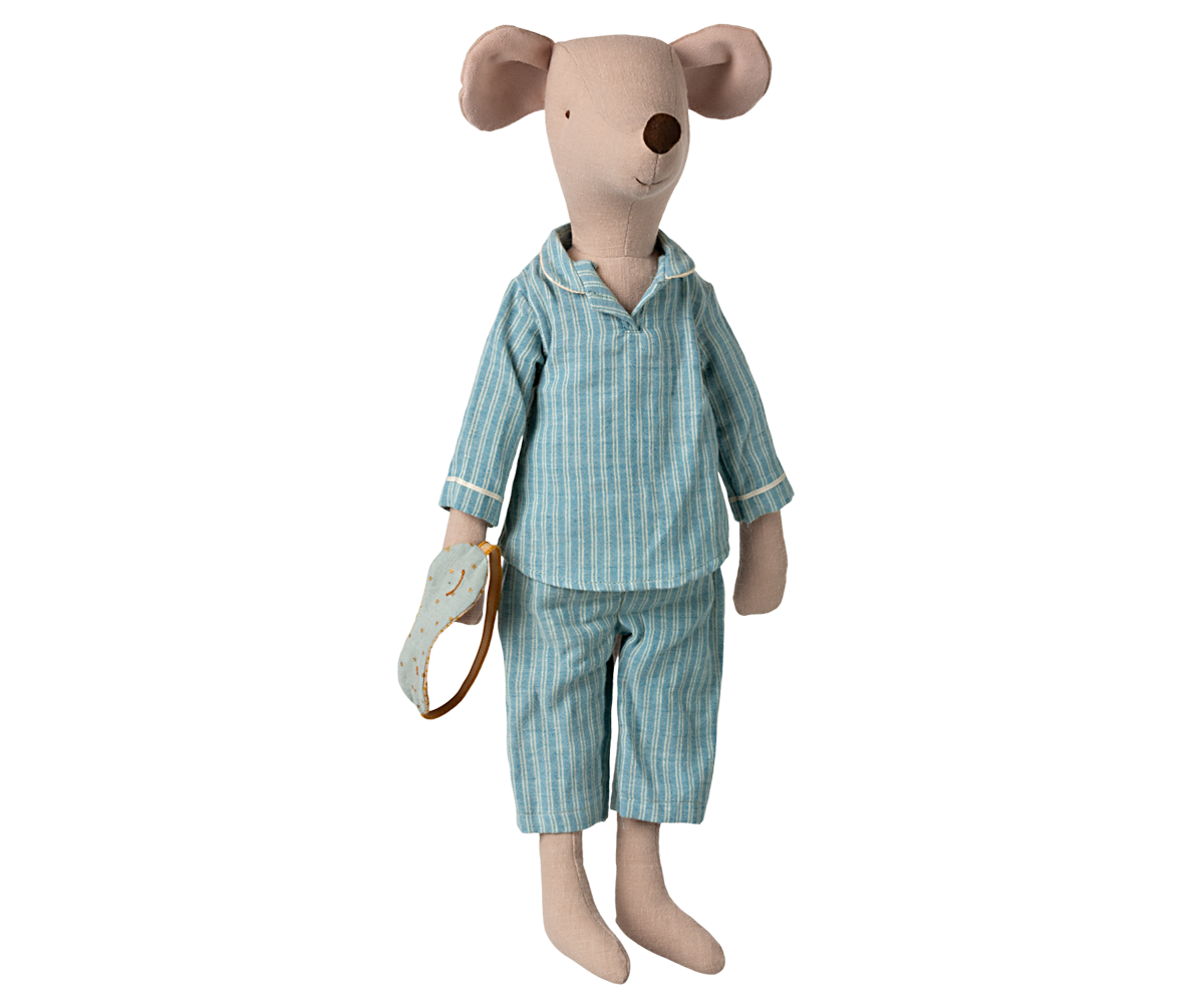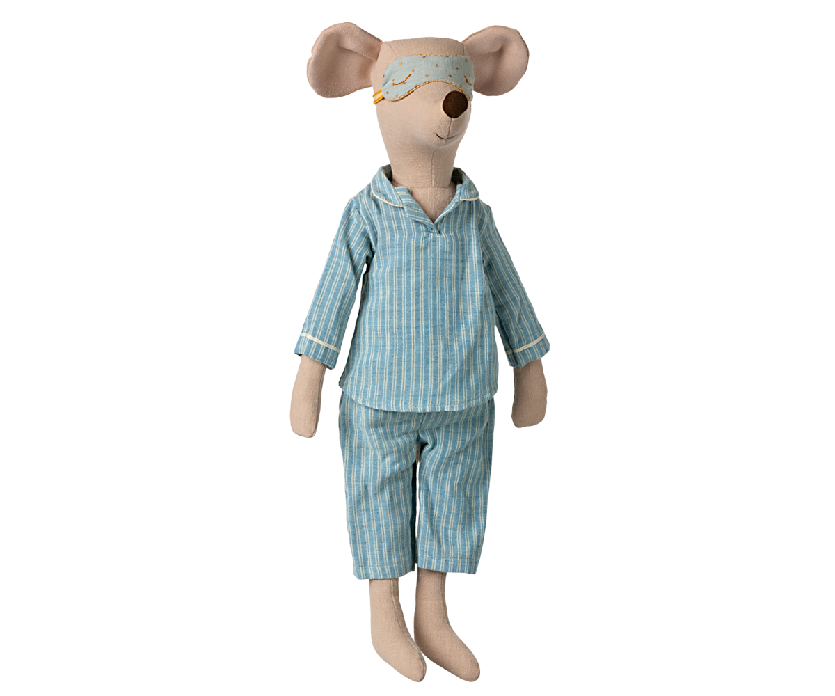 Maxi Mouse in Pyjamas wears a sleepy blue two-piece pajama set with off-white stripes. He loves that he has matching jammies with our Medium Mouse in Pajamas! He likes to sleep in his mint mask with sleepy eyes stitched on, for extra relaxing rest. Maxi mouse makes a comforting rest-time companion, and loves to cuddle.