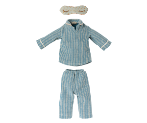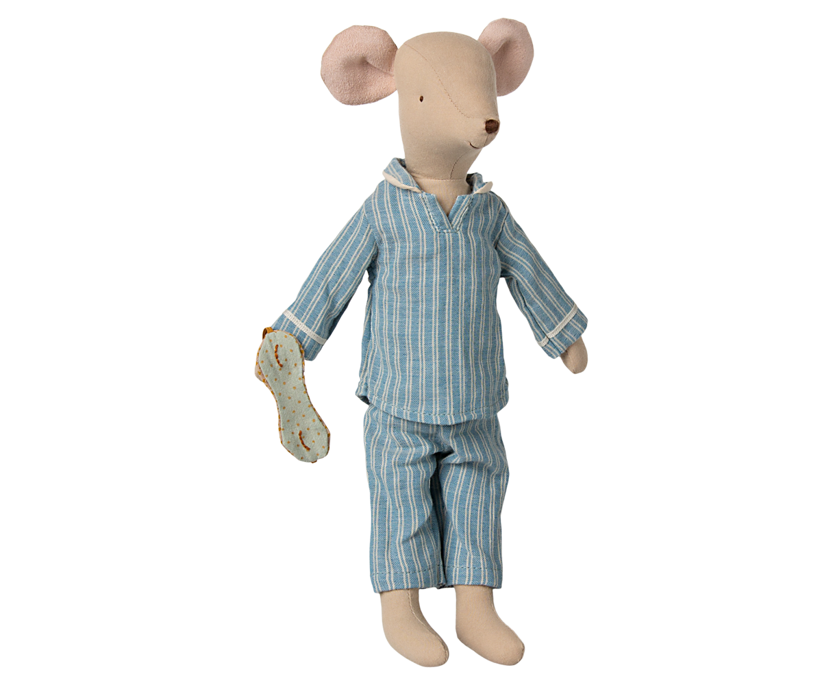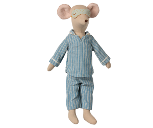 Medium Mouse in Pyjamas wears a sleepy blue two-piece pajama set with off-white stripes. He likes to sleep in his mint mask with sleepy eyes stitched on, for extra relaxing rest. Medium mouse makes a comforting rest-time companion, and loves to cuddle.