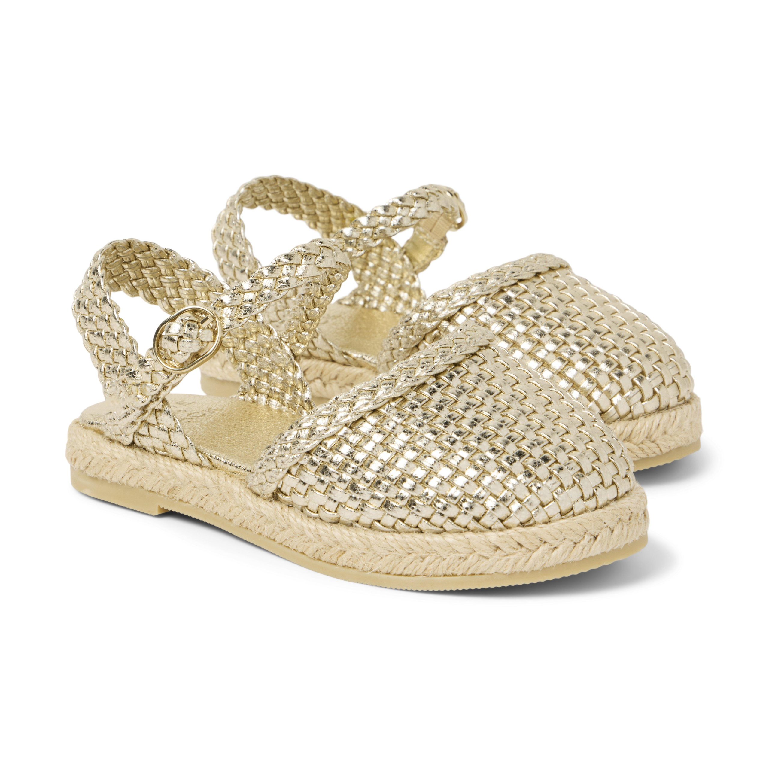 • Every step shines with our metallic sandal. Featuring a woven espadrille sole and an adjustable buckle strap.
