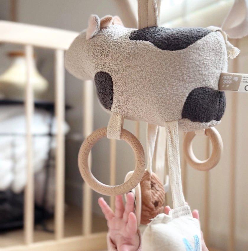 • Have your little one accompanied with our MOO MOO cow mobile that rattles in different sounds. Attract the eye of the young baby with the cookie mirror too! The snap strap allows easy attachment to strollers, baby gyms and handles in the back seat of the car. Wooden rings allow an easy grasp by baby too.