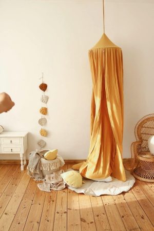 Comfortable, casual, laid-back. Exhausting expeditions and missions cannot last forever. Quieter play and relaxation requires a small cosy nook. Storytelling, too, needs focus and peace. Use it as an interior decoration, a canopy roof, portable or permanent – the canopy works in many situations, also for hanging garlands or toys, or even as a mosquito net on your terrace! PART OF THE BOHO STYLE COLLECTION Boho is an artistic bohemian style guided by comfort, summer and freedom. You’ll find some ethnic references here and there, a number of flowers where possible, and naturalness – a nod to Mother Nature. Match the canopy with cushions, mats and garlands! Simple and natural in its form, this canopy is robust, made of cream-coloured cotton fabric with gold dots. With its convenient straps, it is easy to take off and wash. There are also cotton straps inside the canopy for you to hang an extra ornament or light. Cotton fabric, rim Fabric: 1% OEKO-TEX® cotton. Washing temperature: up to 86°F. Rim diameter: 19.7 in. Canopy length: 94.5 in plus straps. This canopy is made of ochre-colored cotton fabric. With its convenient straps, it is a breeze to remove and wash. Extra straps inside the canopy also allow for you to hang an ornament or light inside.<span Comfortable, casual, laid-back. Exhausting expeditions and missions cannot last forever. Quieter play and relaxation requires a small cosy nook. Storytelling, too, needs focus and peace. Use it as an interior decoration, a canopy roof, portable or permanent – the canopy works in many situations, also for hanging garlands or toys, or even as a mosquito net on your terrace! PART OF THE BOHO STYLE COLLECTION Boho is an artistic bohemian style guided by comfort, summer and freedom. You’ll find some ethnic references here and there, a number of flowers where possible, and naturalness – a nod to Mother Nature. Match the canopy with cushions, mats and garlands! Simple and natural in its form, this canopy is robust, made of cream-coloured cotton fabric with gold dots. With its convenient straps, it is easy to take off and wash. There are also cotton straps inside the canopy for you to hang an extra ornament or light. Cotton fabric, rim Fabric: 1% OEKO-TEX® cotton. Washing temperature: up to 86°F. Rim diameter: 19.7 in. Canopy length: 94.5 in plus straps. Combine this canopy with our cushions, mats and garlands to create your dream hideout!
