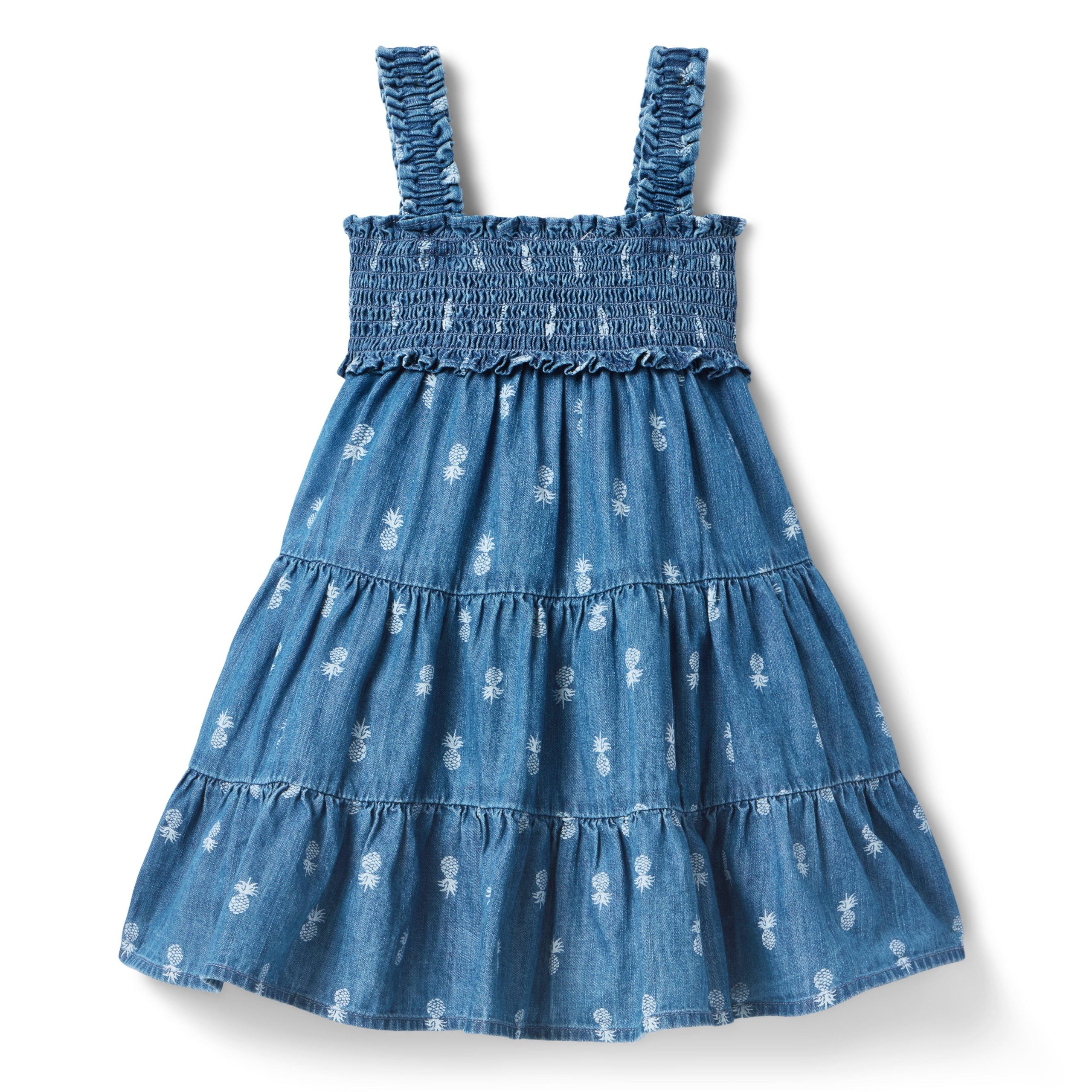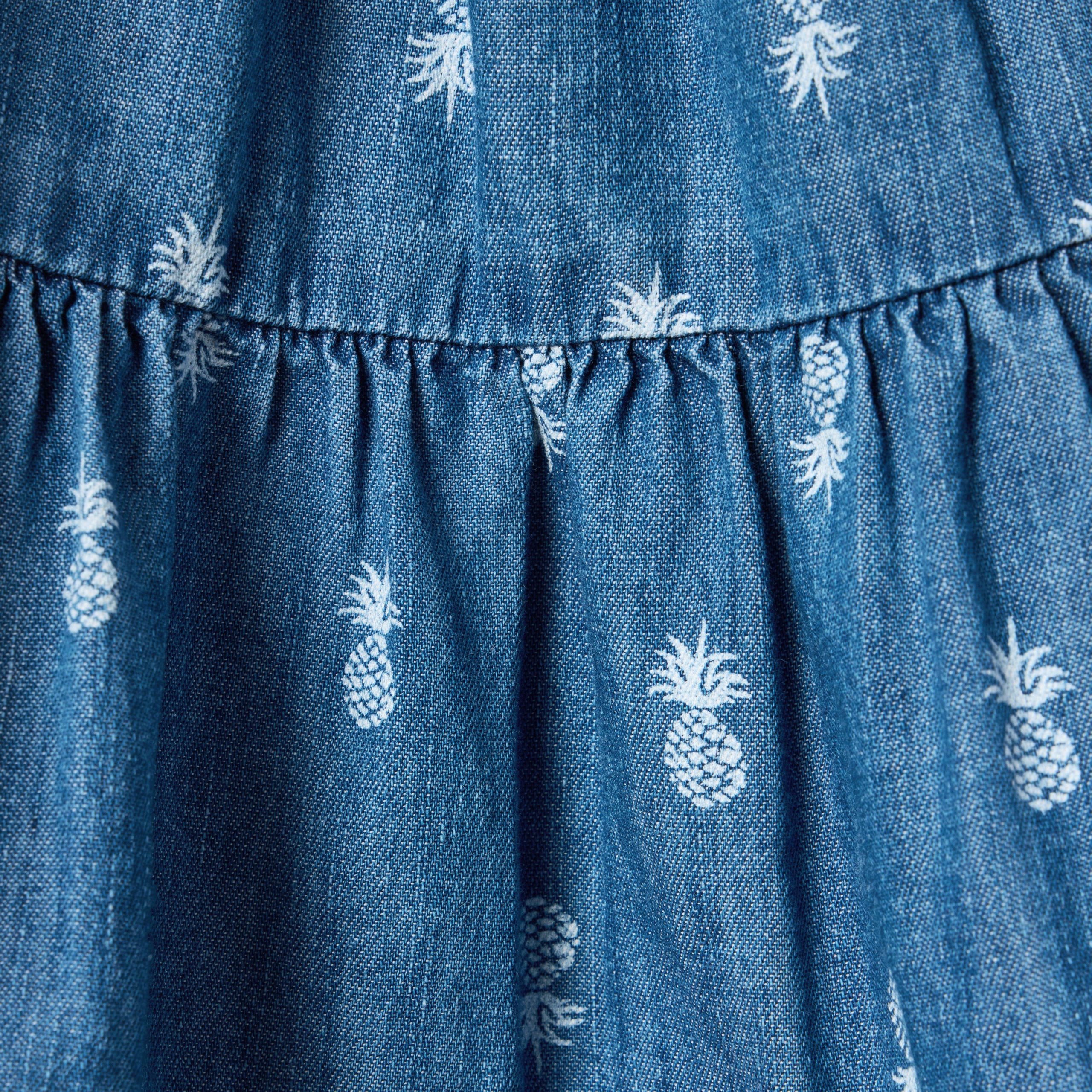 • Sweet style for sunny days. Designed in a trending empire waist silhouette, our dress in soft cotton chambray features allover pineapples, ruffle details and smocking too.