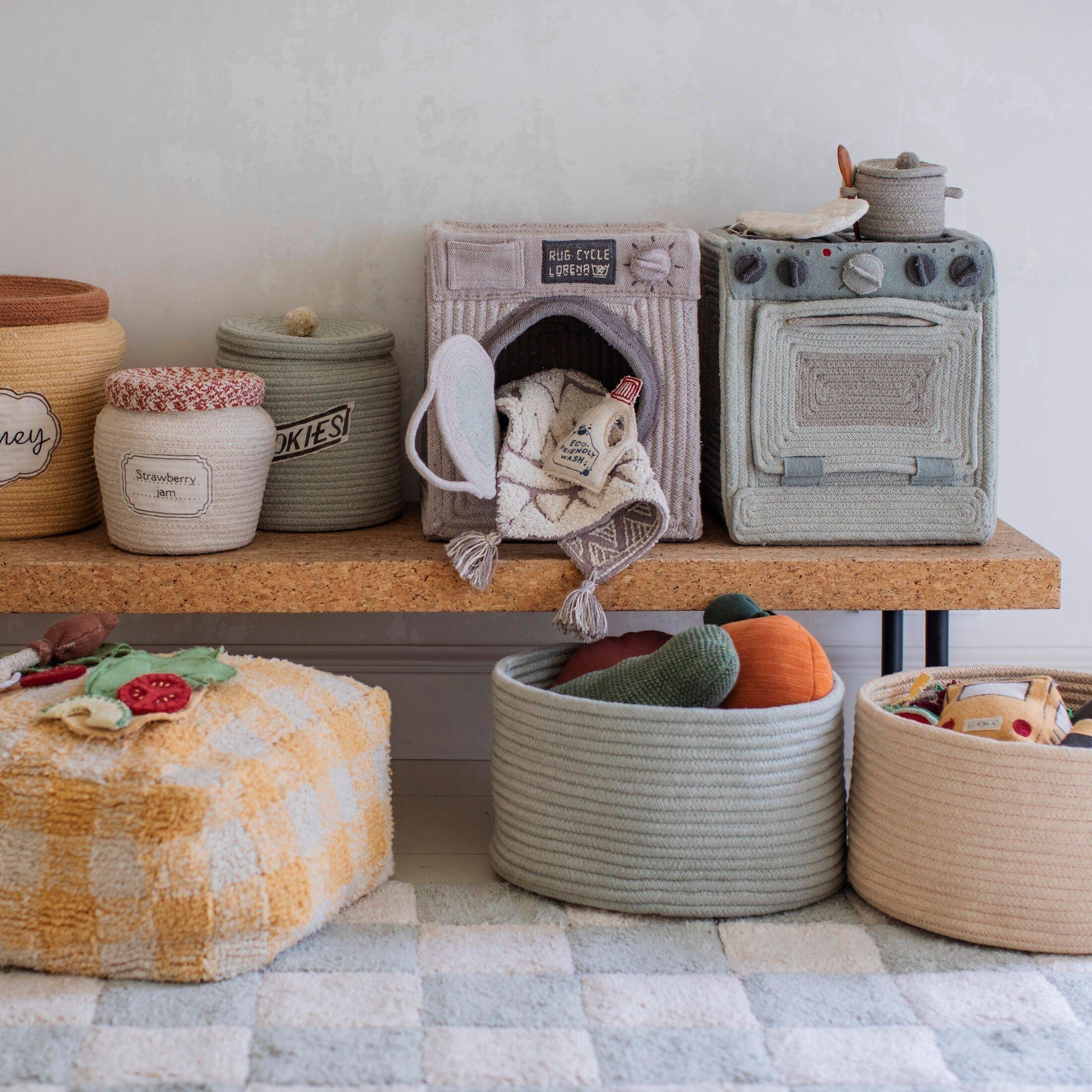 • A 100% handcrafted textile washing machine! Handcrafted using a braided cord made of fibers from recycled PET-bottles mixed with cotton, the rectangular Washing machine basket is made carefully by our skilled artisans to make it a favorite playtime accessory. Comes with a mini-rug of Lorena Canals’ RugCycled collection, and a mini-cushion shaped as a bottle of detergent. The front panel has a small a pocket and a turning switch in canvas as well as a round-shaped door. The basket comes in Pearl grey color with details in natural and light blue. Packed individually in a carton box.