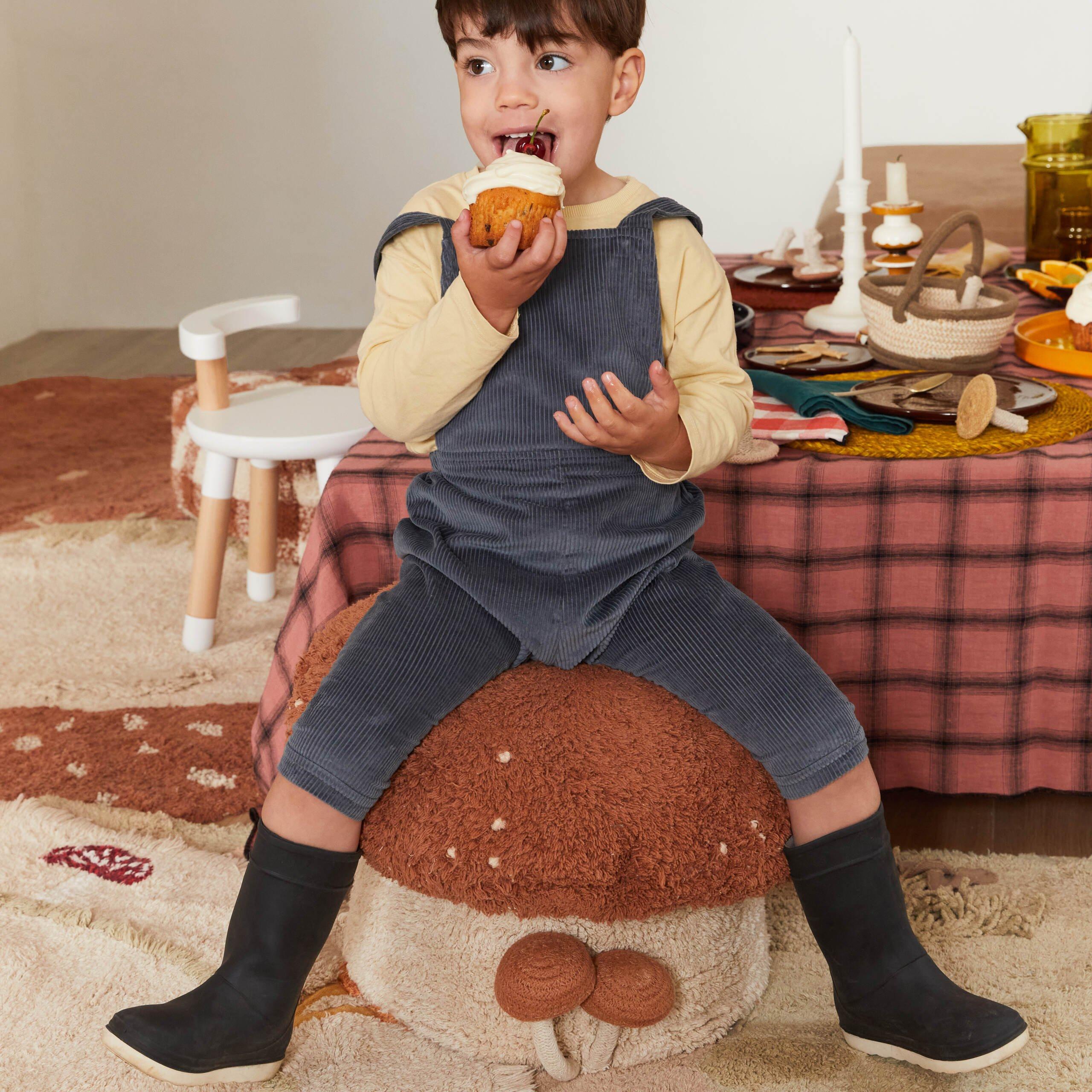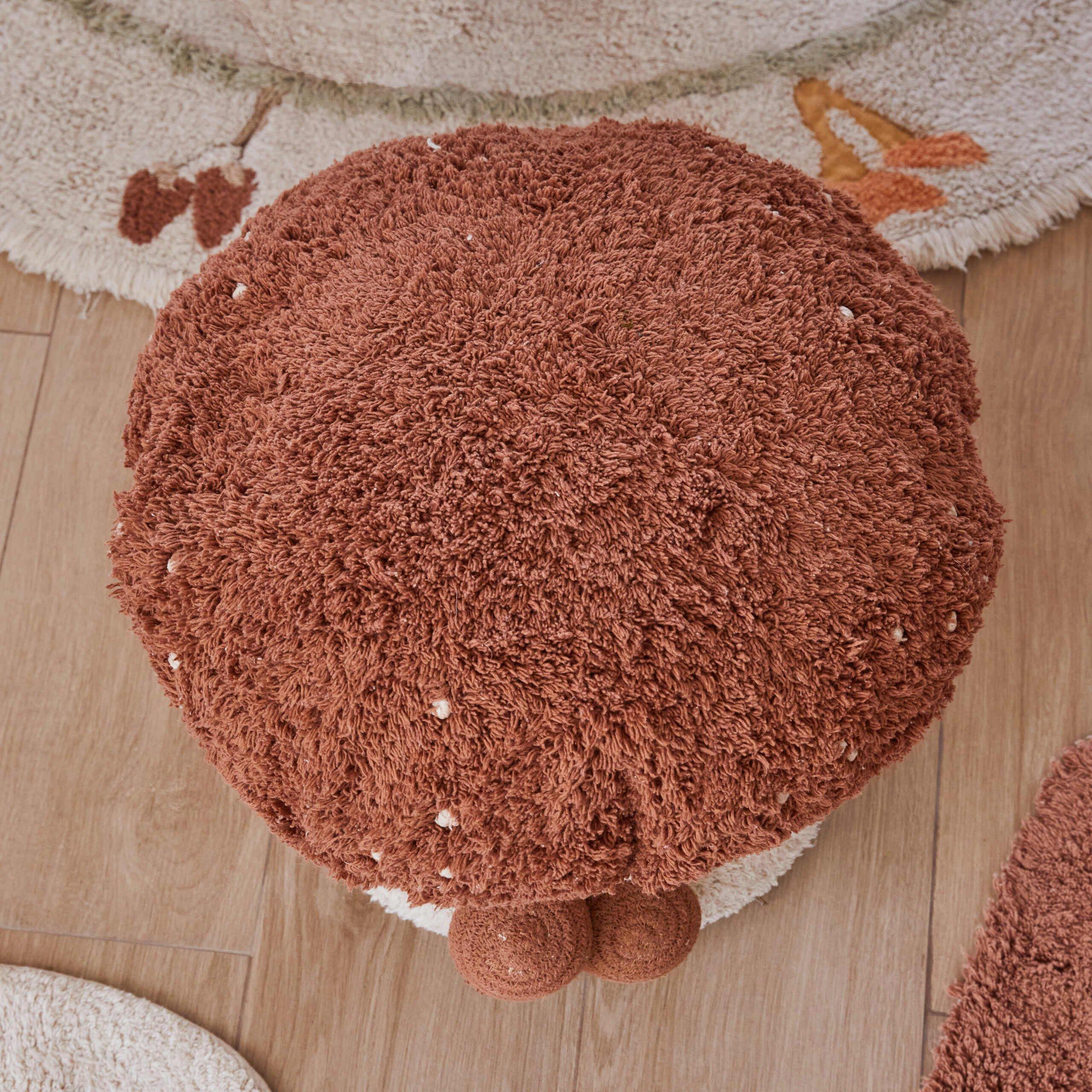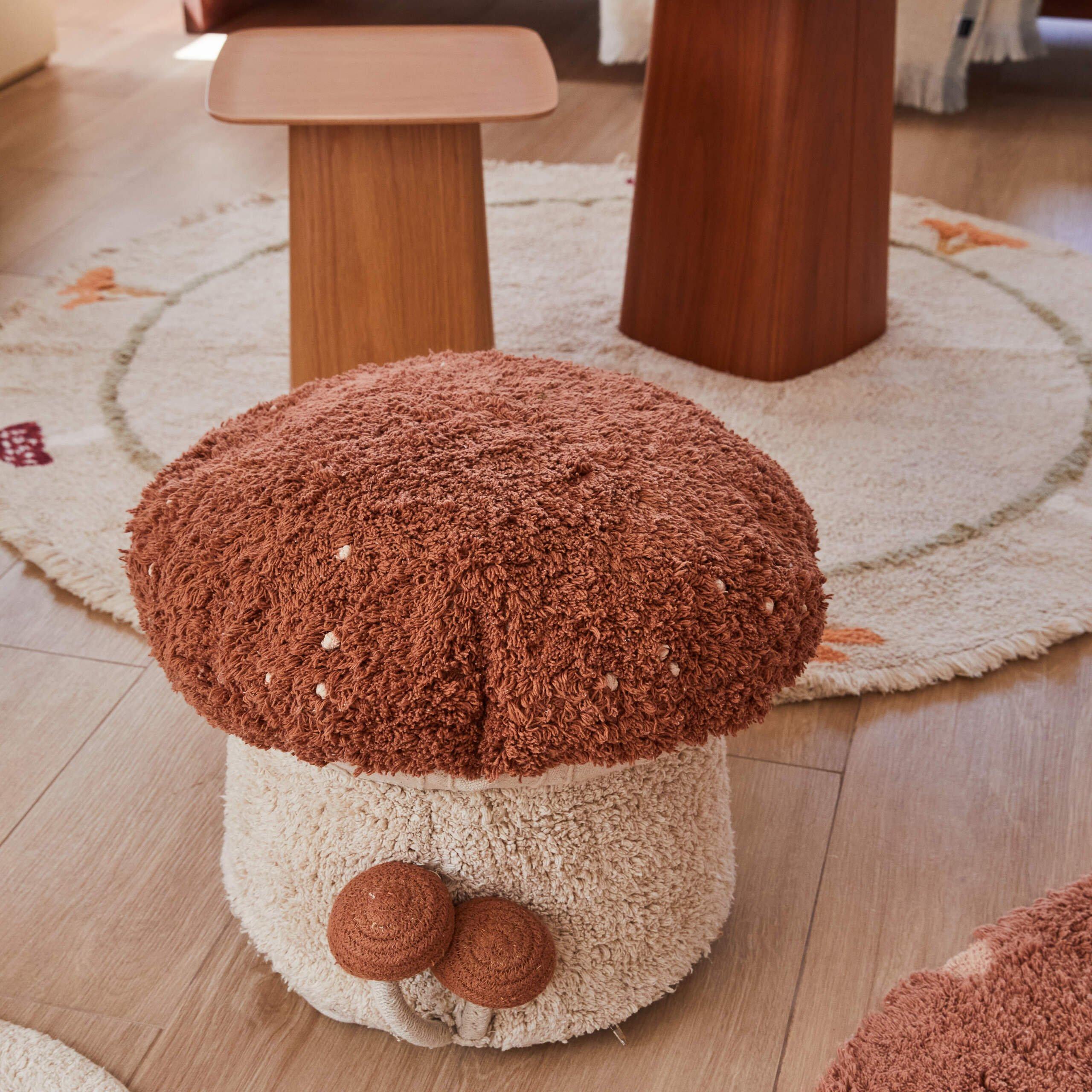 The Boletus pouf combines a bottom part in soft tufted natural colored cotton pile, with a Toffee colored top part, with small knotted natural color dots. Decorated on the side with two small mushrooms handcrafted from braided cotton cords. The cover is removable with a zipper and can easily be washed. The inner filler is filled by lightweight polystyrene pearls.