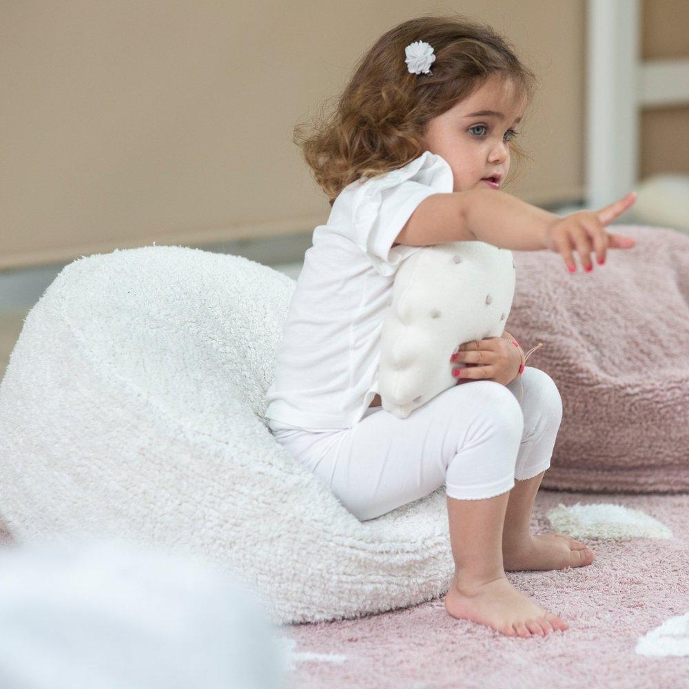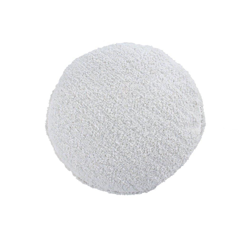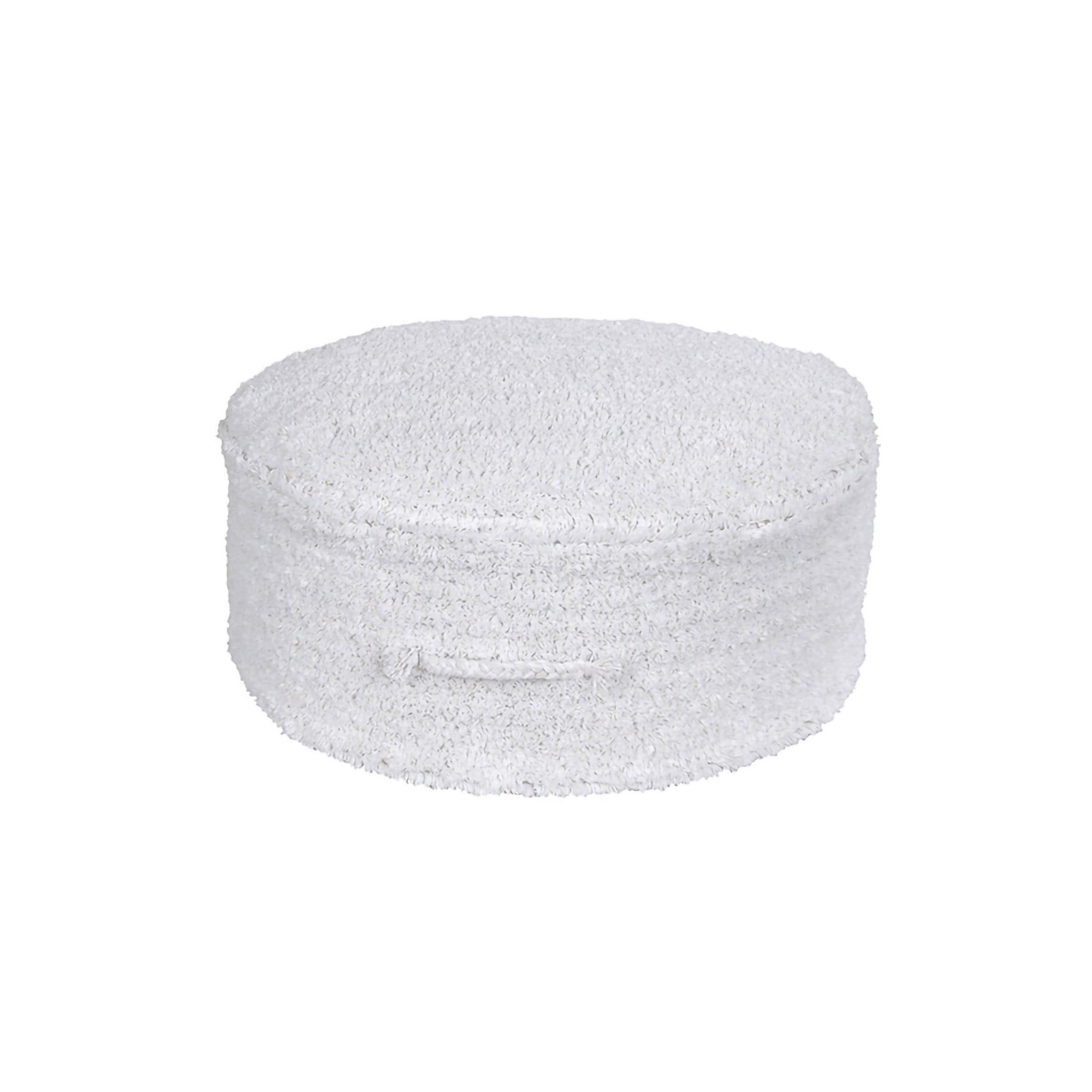 Round pouffe, in Ivory mixed with White base and a handmade braid in matching color as a handle. Top and sides covered with soft rug pile, bottom part in cotton canvas, and finished with a zipper. Inside removable filler with polystyrene pearls.