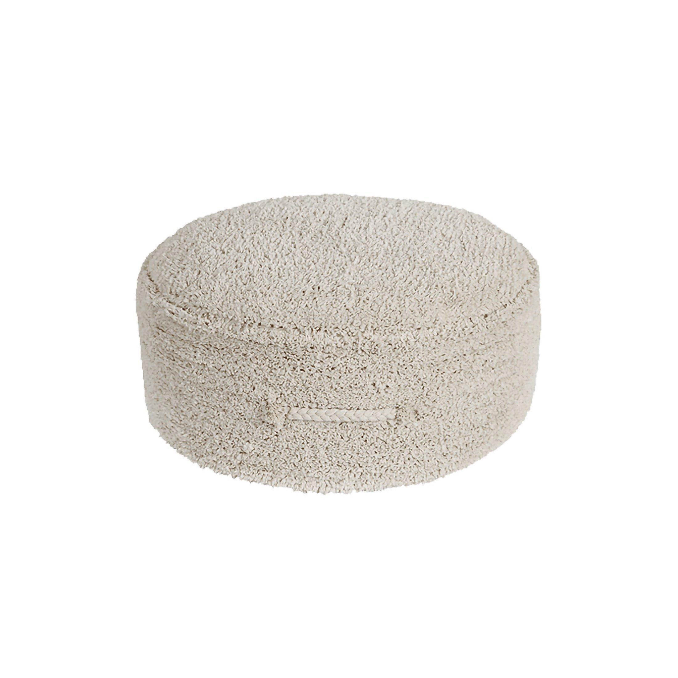 Round pouf in Natural color with a handmade braid in matching color as a handle. Top and sides covered with soft rug pile, bottom part in cotton canvas, and finished with a zipper. Inside removable filler with polystyrene pearls.