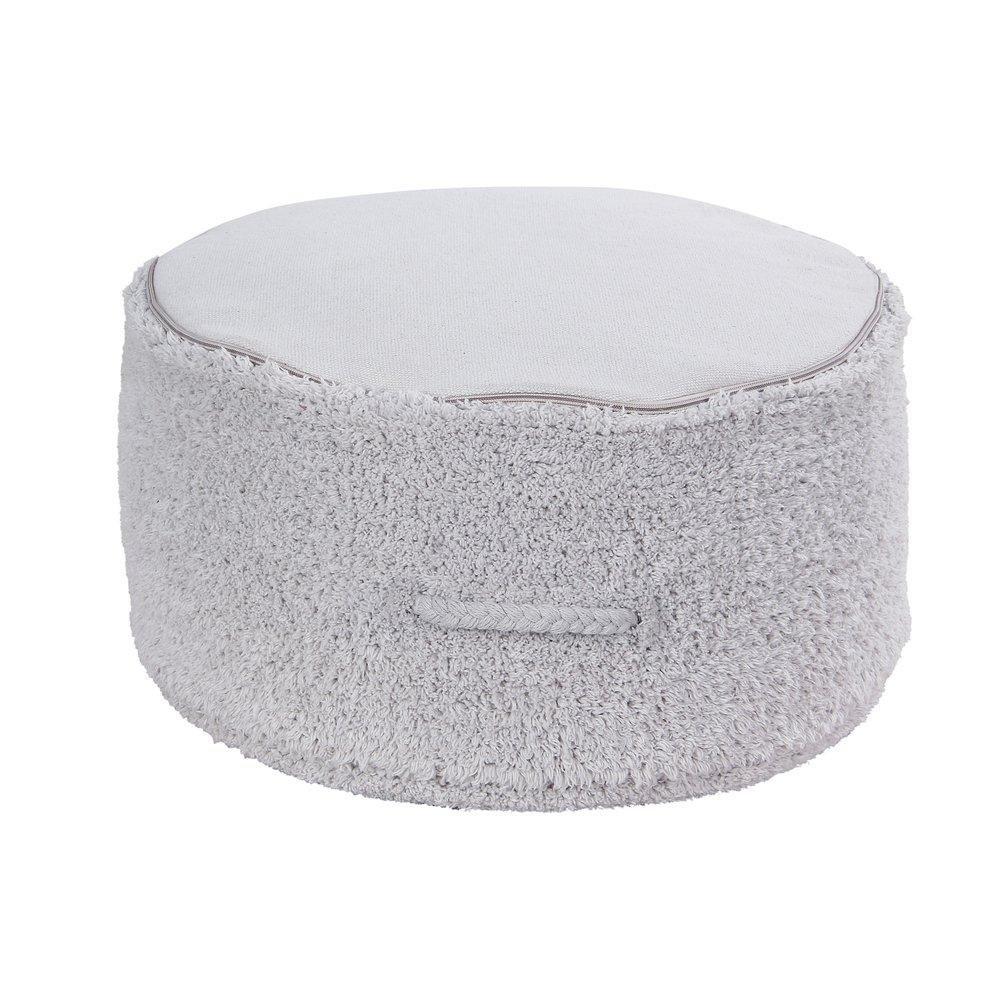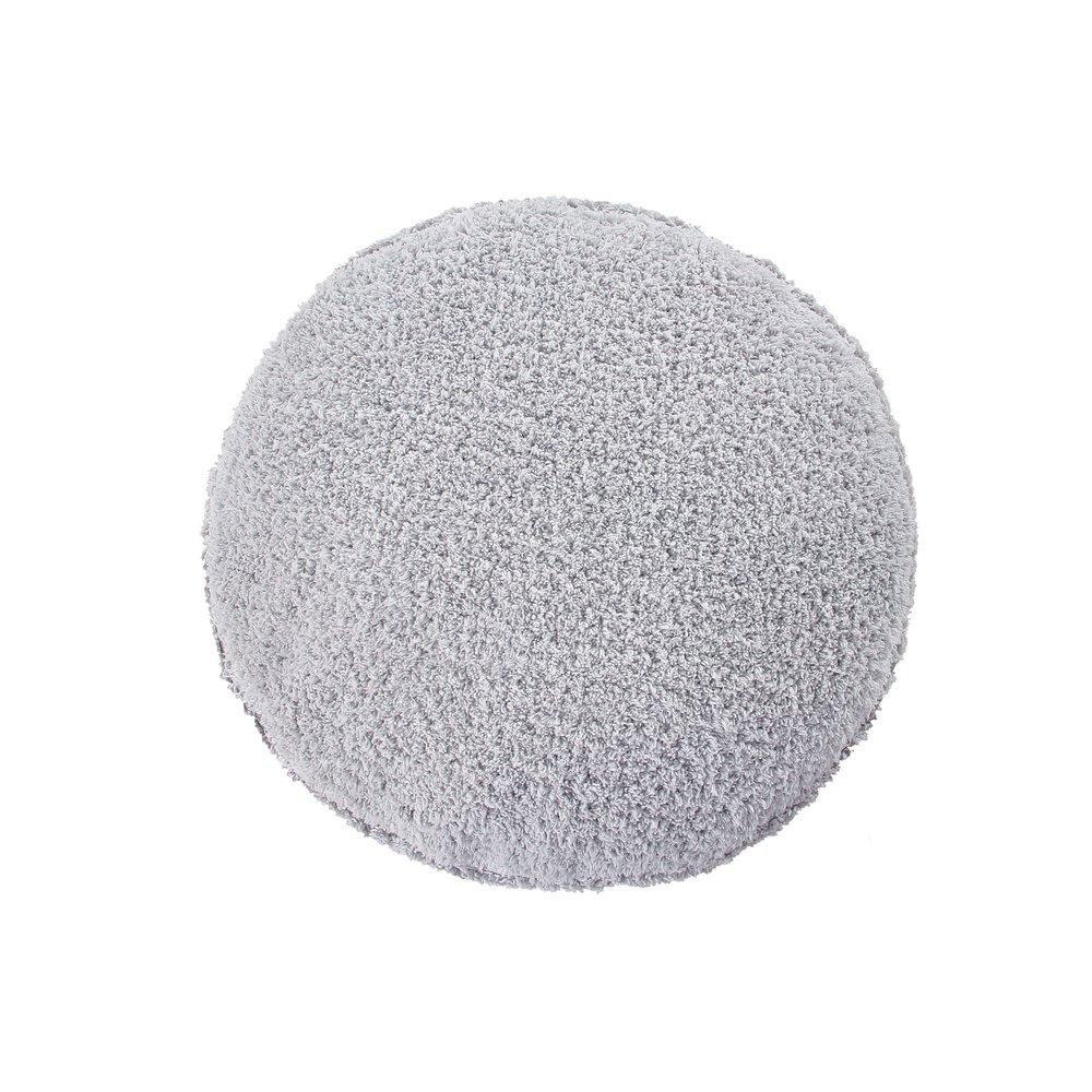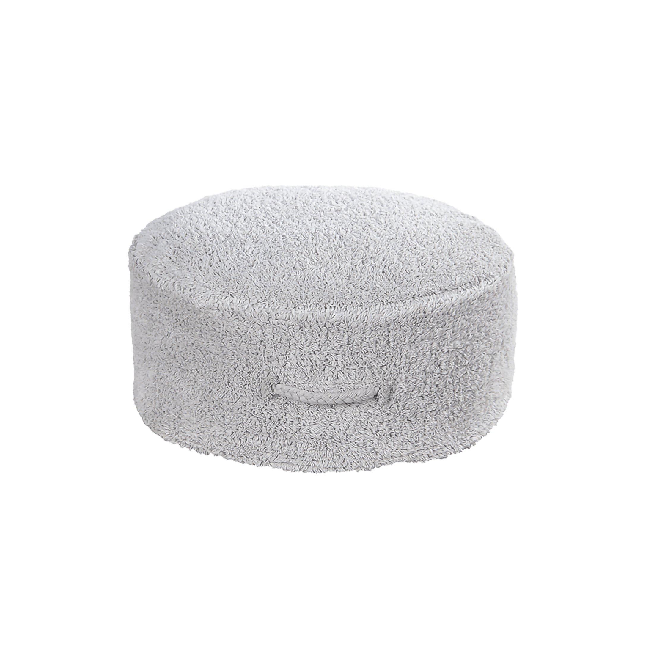 • Round pouffe, in Pearl Grey base and a handmade braid in matching color as a handle. Top and sides covered with soft rug pile, bottom part in cotton canvas, and finished with a zipper. Inside removable filler with polystyrene pearls.