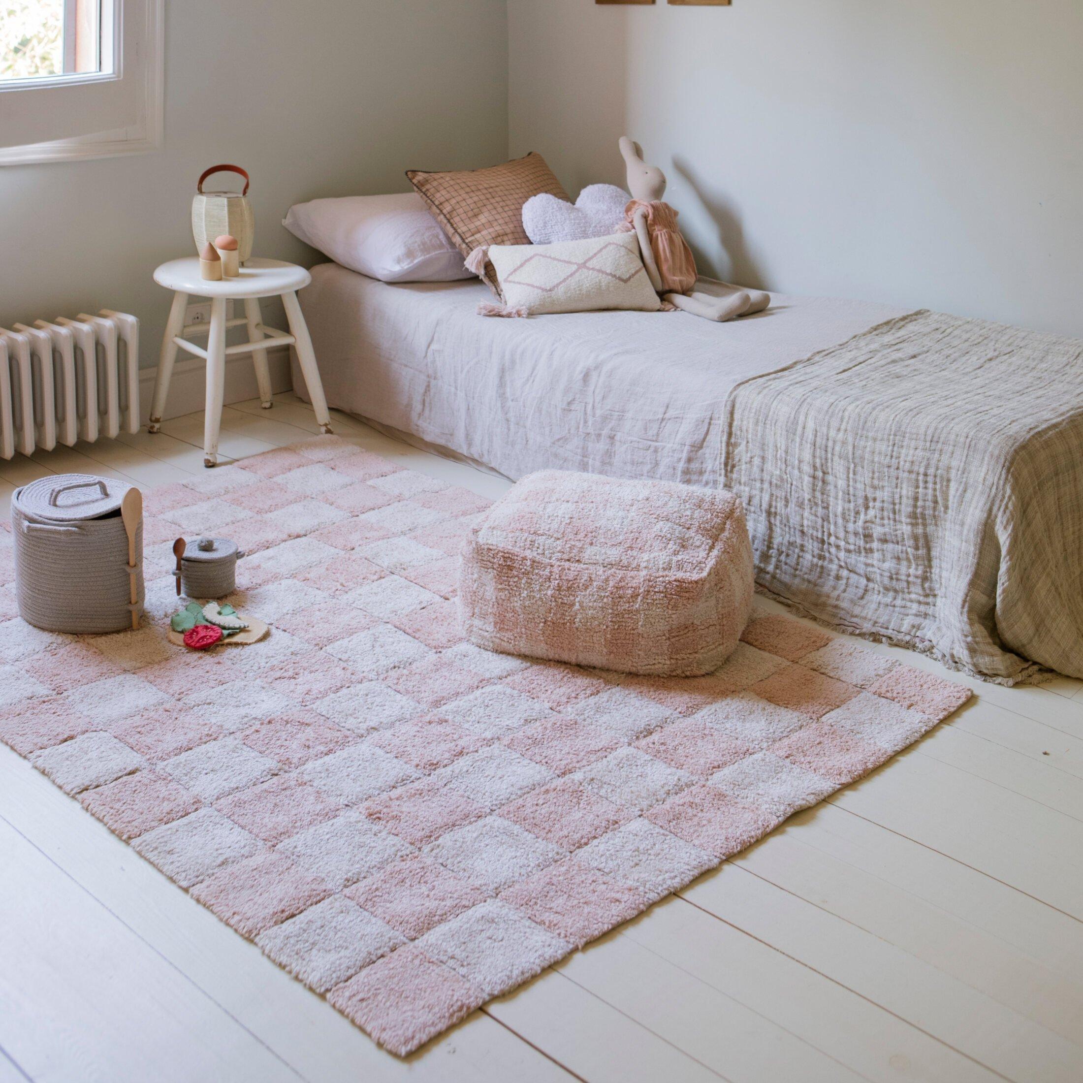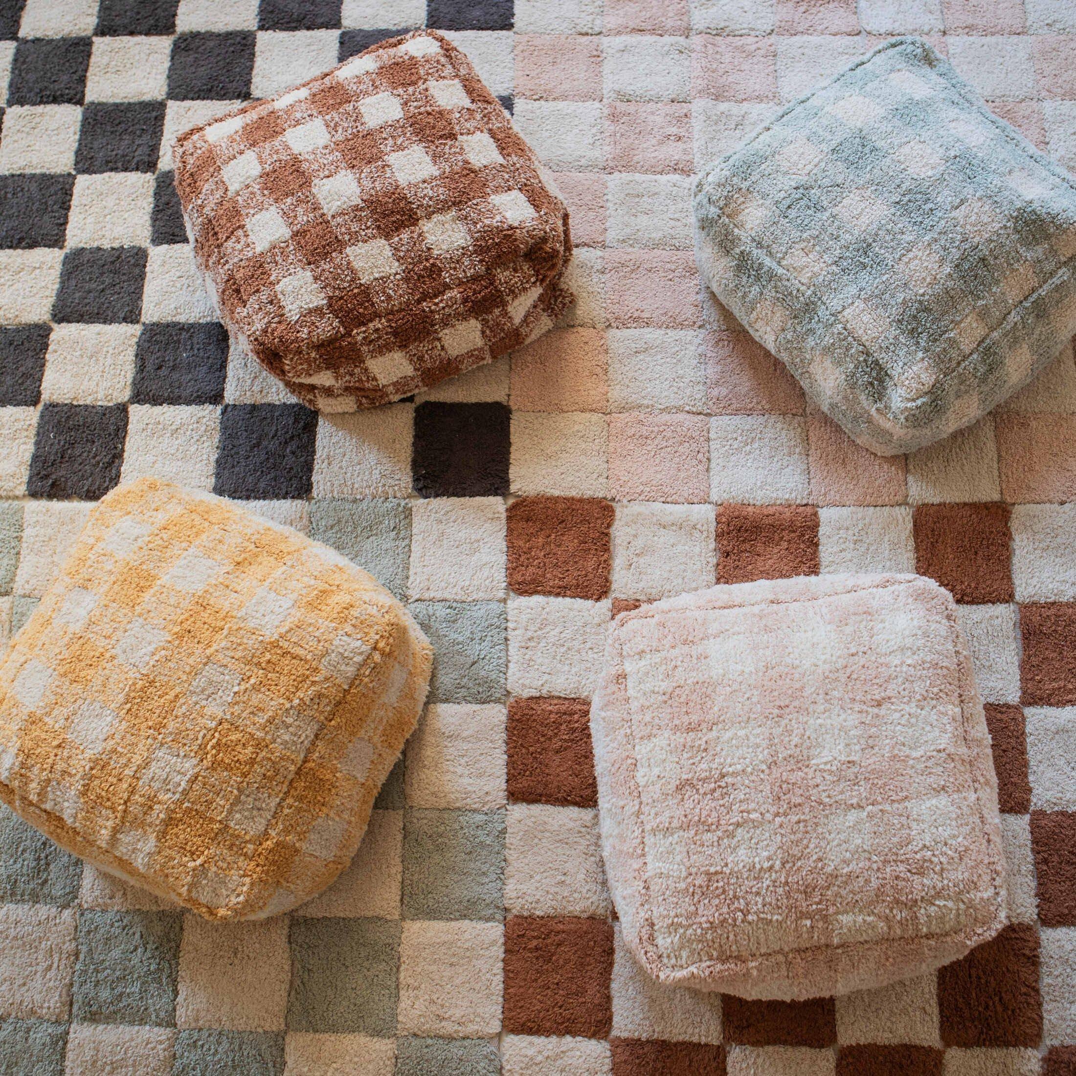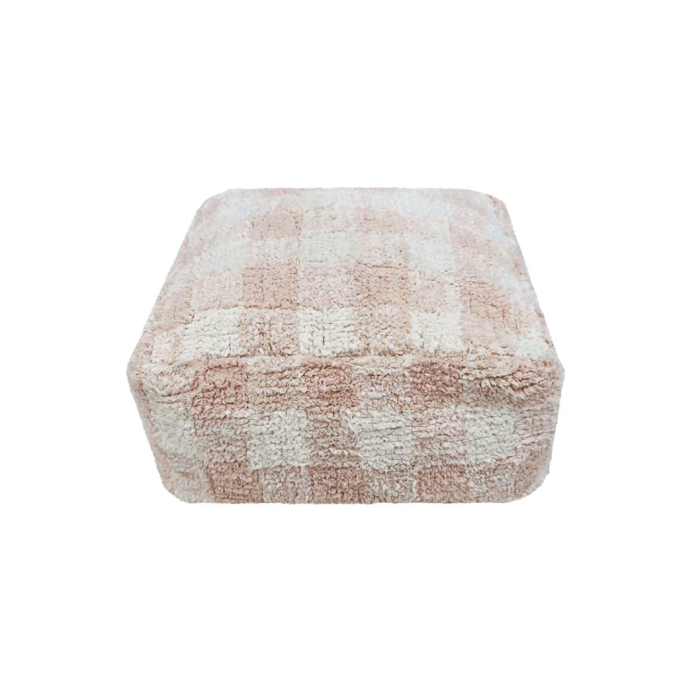 • A practical, square-shaped pouf, inspired by the pattern of woven vichy kitchen linen, featuring a bicolor checks’ pattern in Rose and Natural. The pouf cover is made in recycled cotton canvas covered by a soft cotton pile, and has a zipper at the bottom to remove the inside filler before washing. Inside filler of polystyrene pearls.