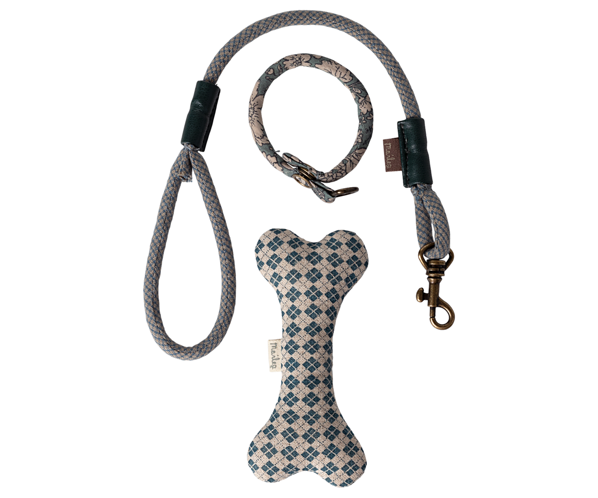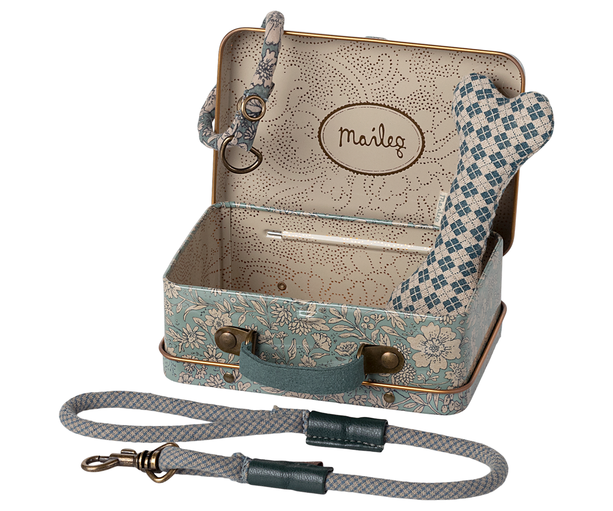 This set is all you need for your soft plush dog. The set includes a bone, collar and leash packed nicely in a metal suitcase with a beautiful Maileg print.