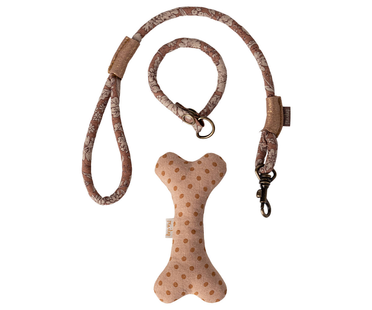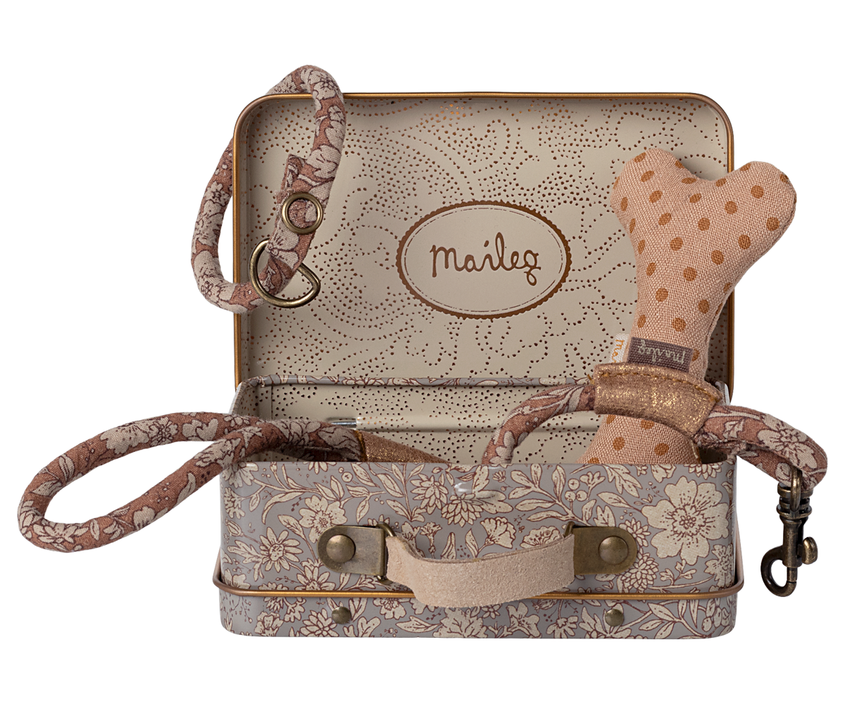• This set is all you need for your soft plush dog. The set includes a bone, collar and leash packed nicely in a metal suitcase with a beautiful Maileg print.