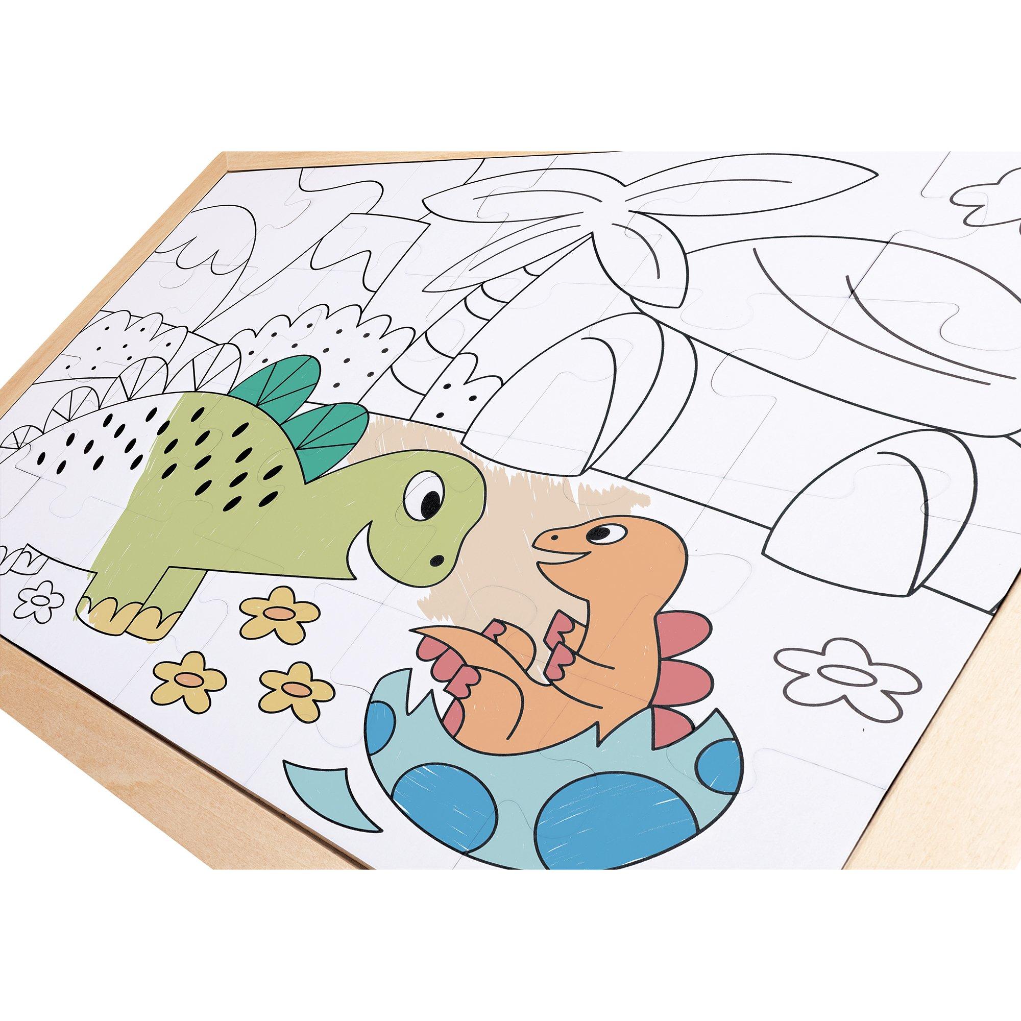 PUZZLE: DINO – Stop excitement from going extinct with this prehistoric puzzle. With 24 pieces, you’ll put together an engaging puzzle that has an array of trees, mountains and of course, dinosaurs! There is also a blank outline on the reverse side so you can color your own puzzle. Made from paper cardboard and plywood, this puzzle is perfect for encouraging creativity and imagination as well as helping core development skills such as hand-eye coordination, fine motor skills, and problem-solving. Jigsaws are a great toy to encourage social skills through teamwork as children can develop language and cognitive skills. Pour out the 24 puzzle pieces and see if you can assemble the dinosaur scene that’s shown on the poster. Once you’ve finished, you can carefully turn the puzzle over to find a blank scene that you can color in yourself!
