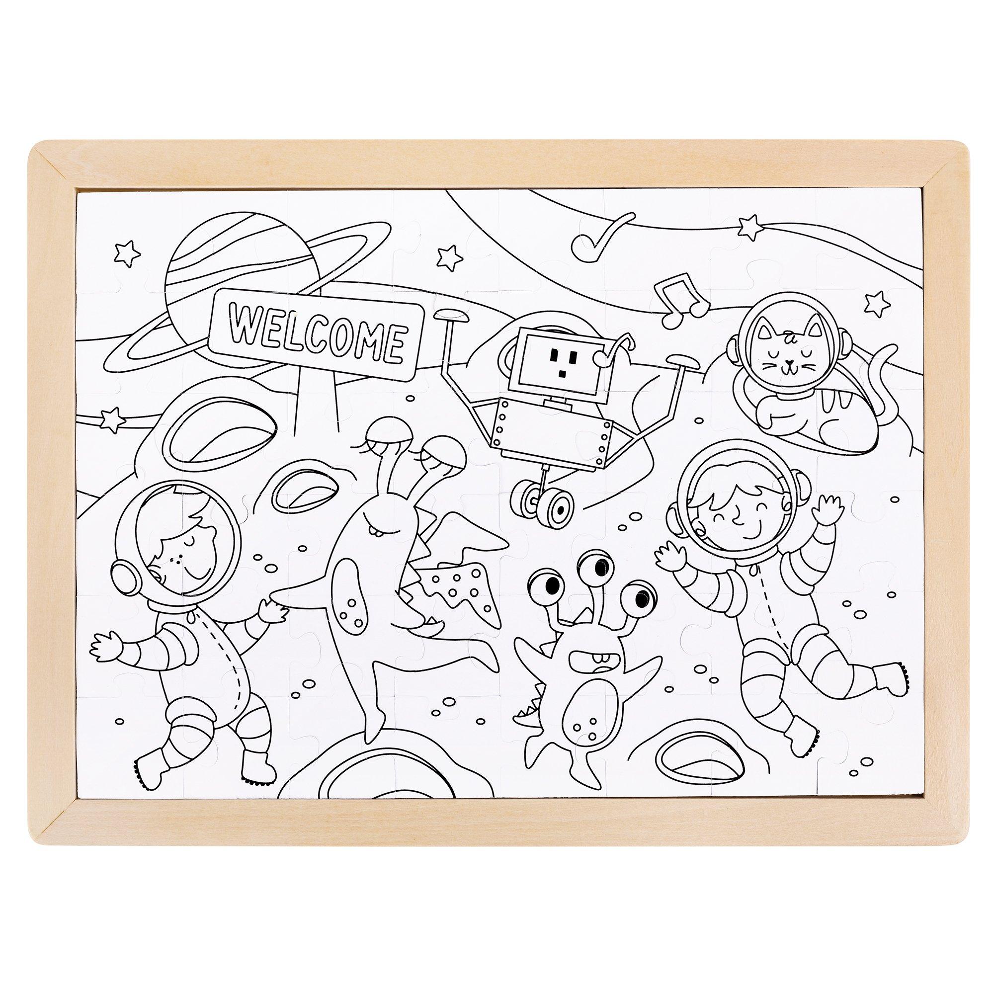 PUZZLE: SPACE FRIENDS – Explore galaxies far and wide with this cosmic 48-piece puzzle. Featuring a crew of astronauts aboard their spaceship along with some friendly aliens and plenty of twinkling stars. There is also a blank outline on the reverse side so you can color your own puzzle. Made from paper cardboard and plywood, this puzzle is perfect for encouraging creativity and imagination as well as helping core development skills such as hand-eye coordination, fine motor skills, and problem-solving. Jigsaws are a great toy to encourage social skills through teamwork as children can develop language and cognitive skills. Pour out the 48 puzzle pieces and see if you can assemble the intergalactic scene that’s shown on the poster. Once you’ve finished, you can carefully turn the puzzle over to find a blank scene that you can color in yourself!