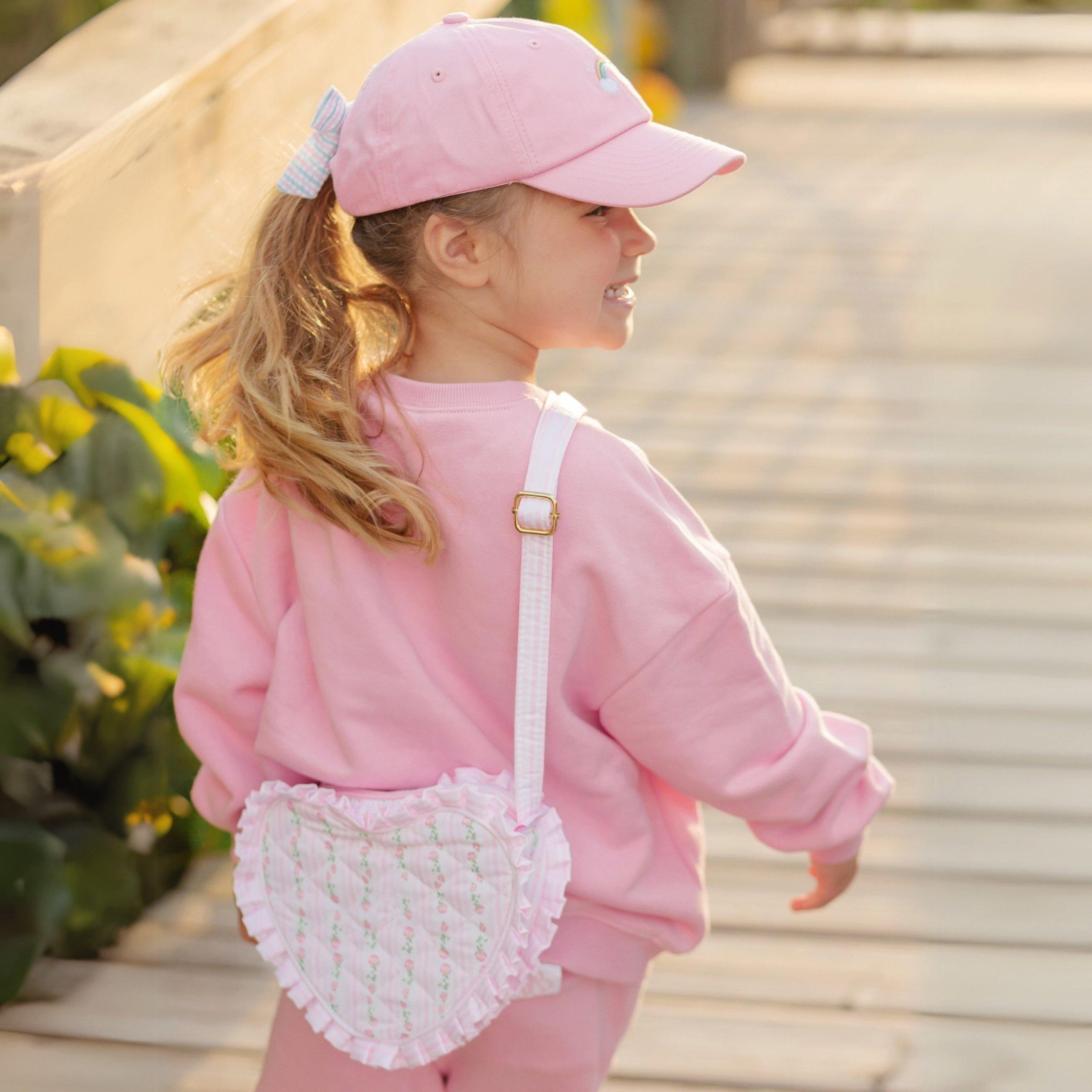 Every little girl-on-the-go needs a go-to bag as sweet and special as she is. With a soft, quilted floral print heart-shaped body, polished gold heart Bits & Bows logo charm and hardware, matching ruffle trim, adjustable crossbody strap, and wipe-clean lining, it’s a functional, feminine accessory she’s sure to just love season after season.