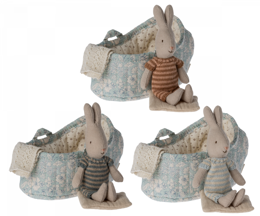 This playset is the perfect start to any story. A soft carry cot made in a beautiful fabric where the small bunny in colorful suit can easily be tucked for a nap, covered in the knitted blanket to keep warm.
