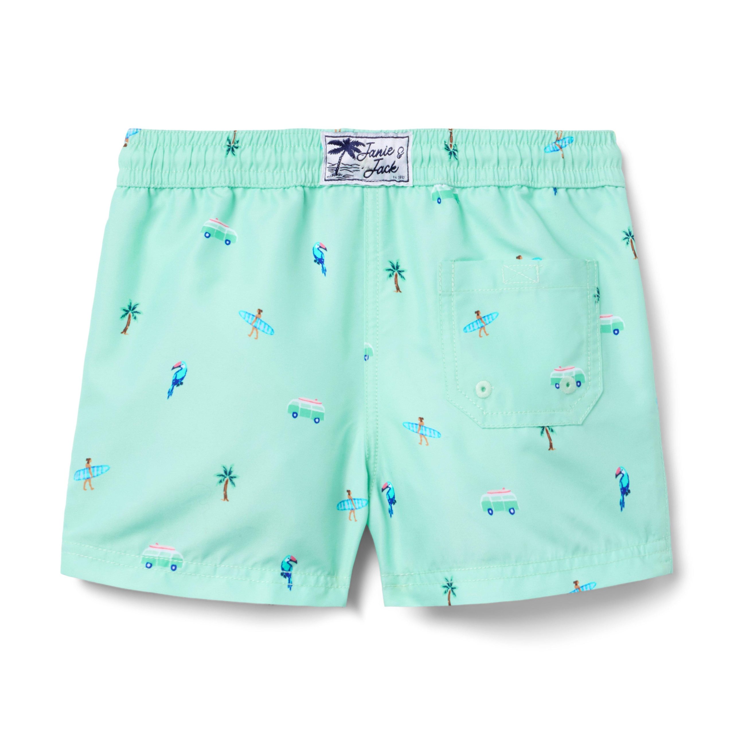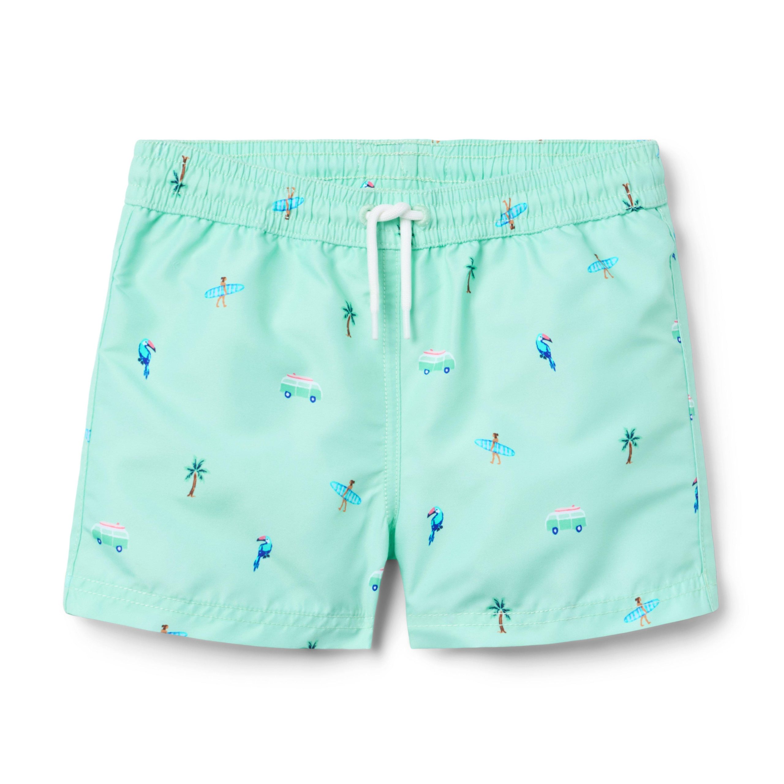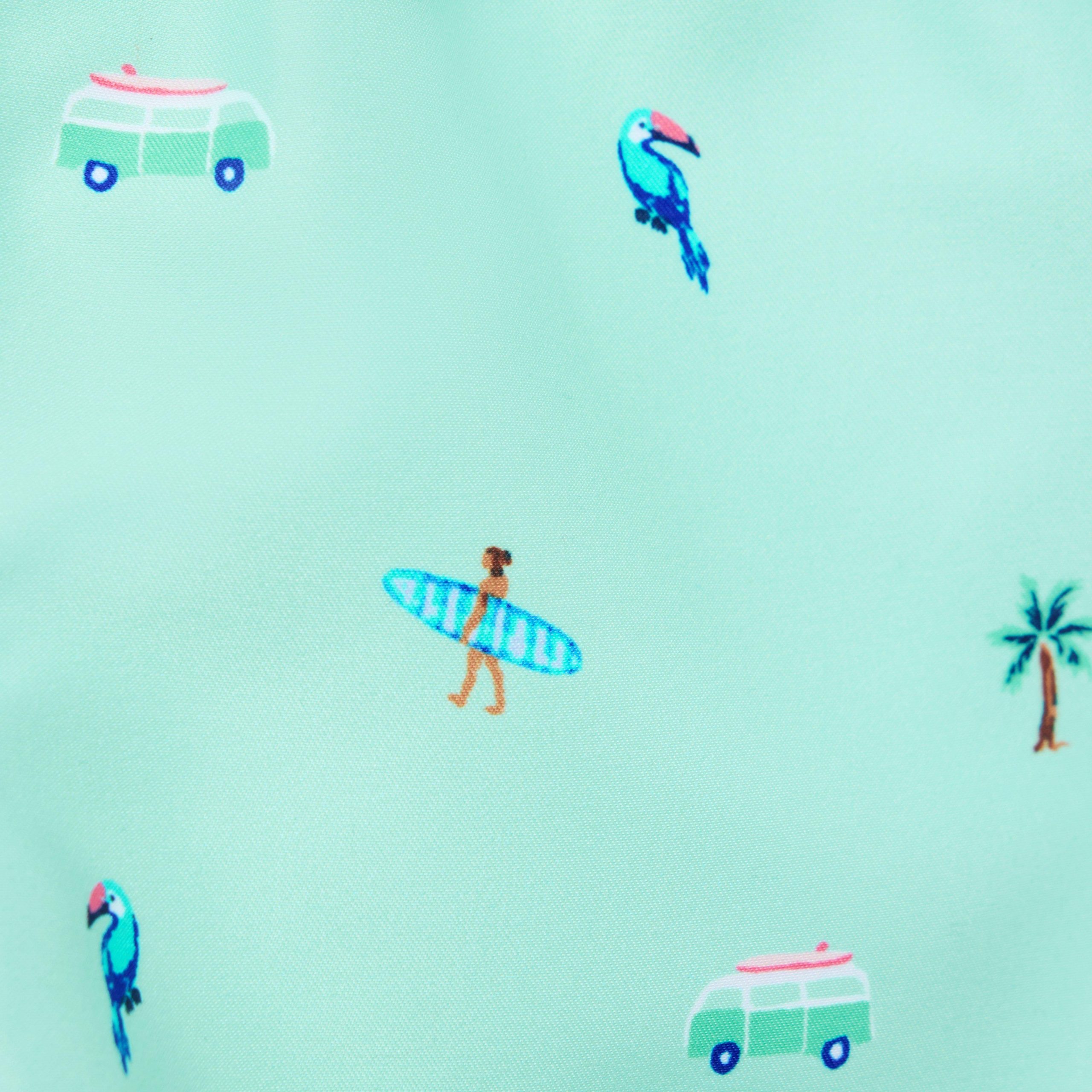 • Catch a wave of style in our swim trunk featuring an allover surfer print. With UPF 50+ sun protection, a touch-close back pocket and embroidered eyelets to let water drain out. Responsibly made with recycled fabric.