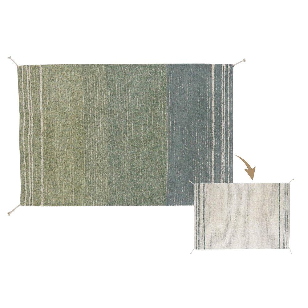 Playing with softly changing color palettes throughout the rug, the Twin rug shows one side in shades of Vintage Blue and Olive and the opposite side in more neutral, natural shades. On both sides the design finish off with horizontal stripes in a contrasted color, and are decorated with natural color handmade braids in each corner.