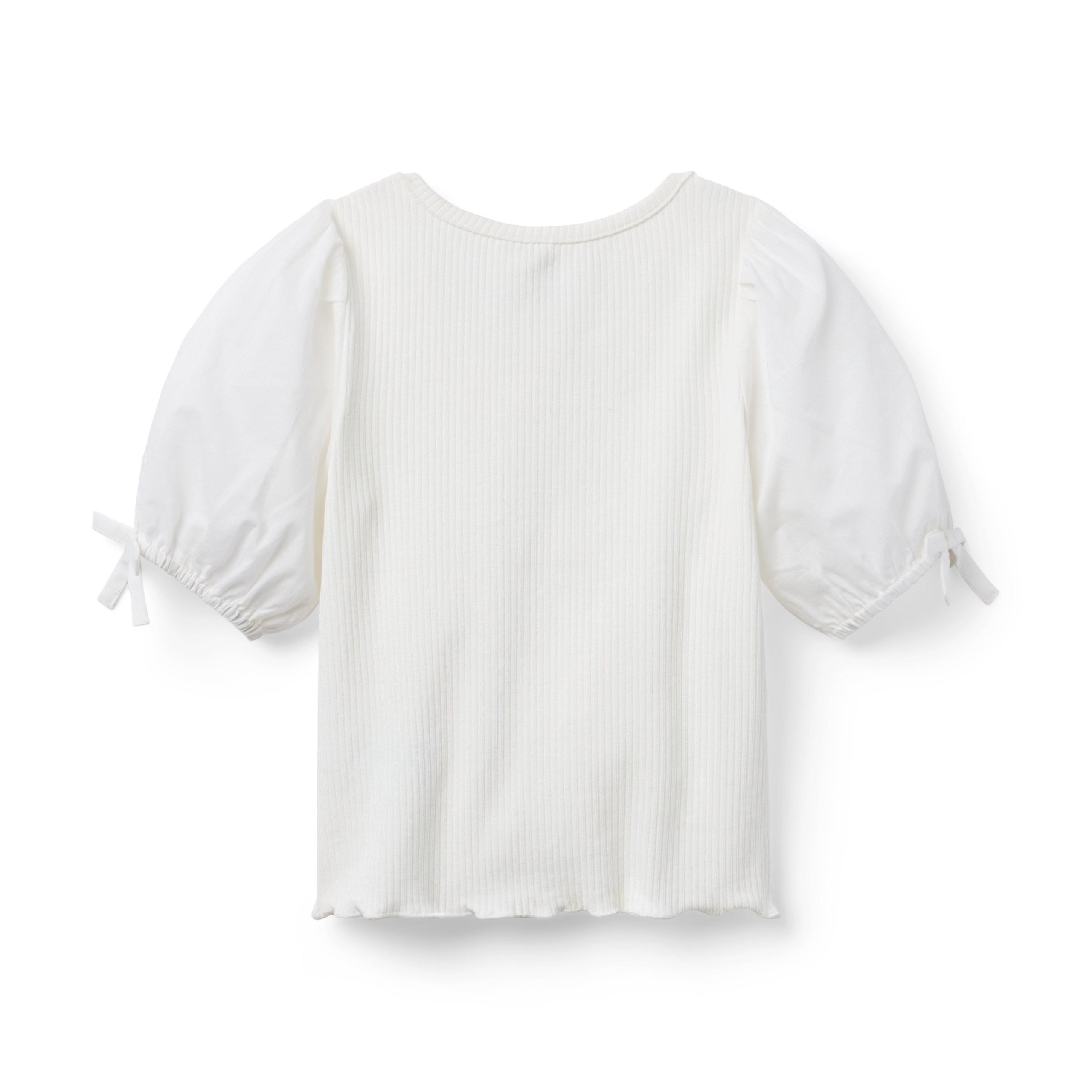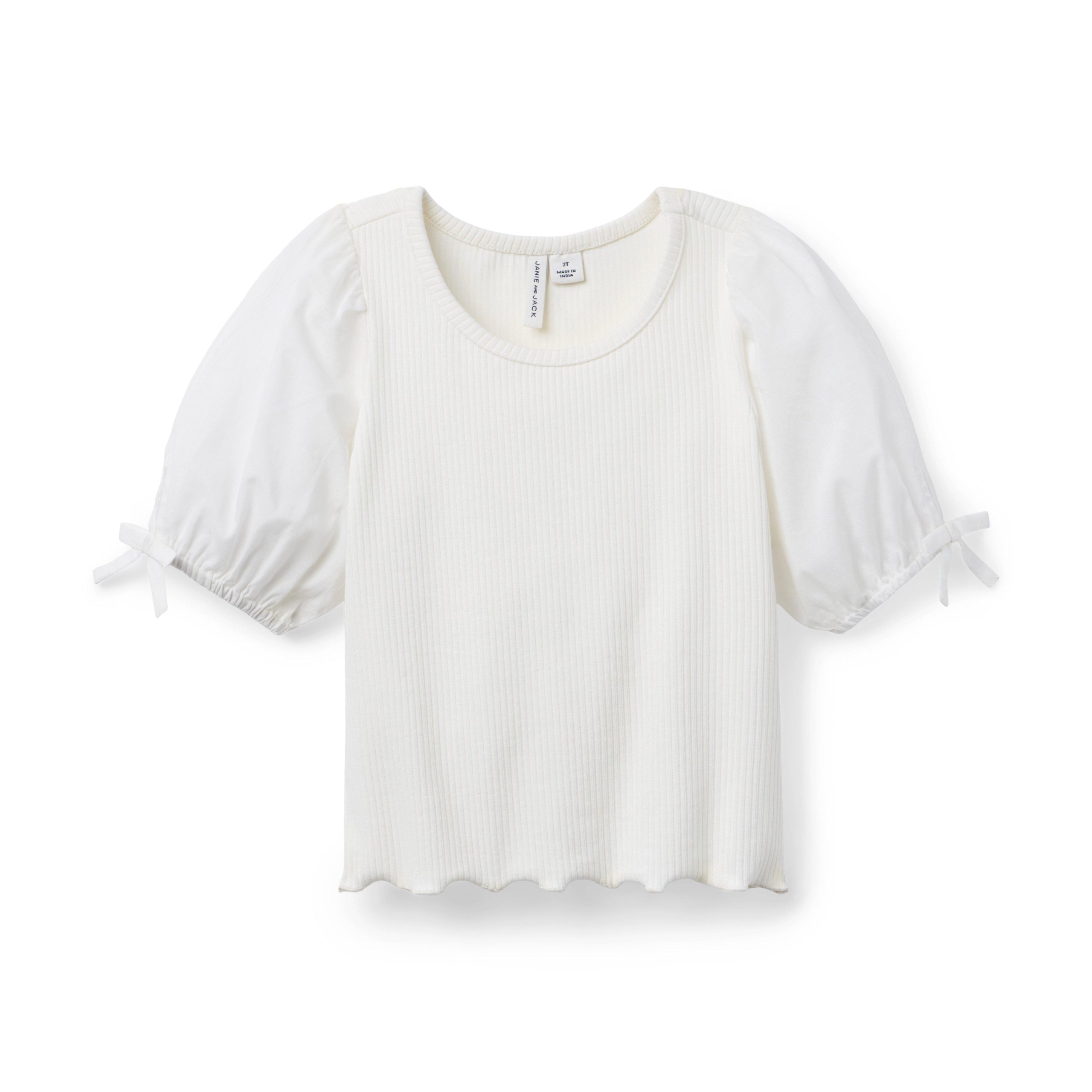 • Puff sleeves add something special to our ribbed top. Plus, bow details, a ruffle hem and a stylish scoop neck too.