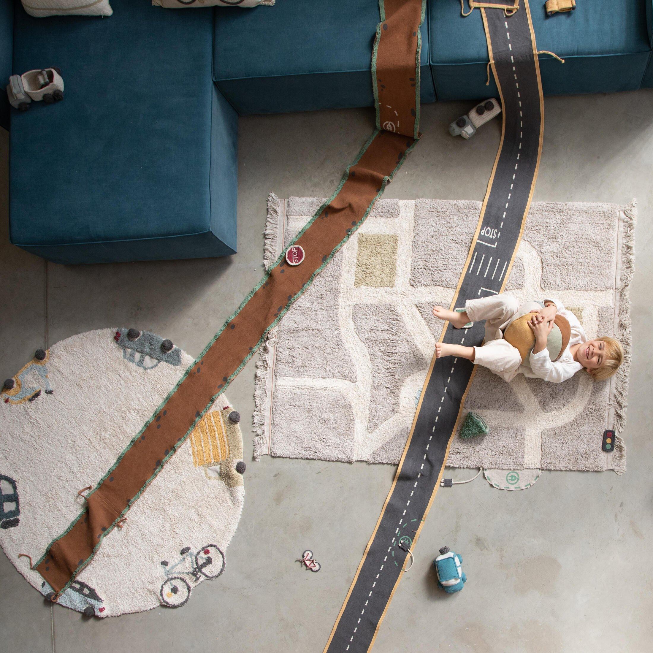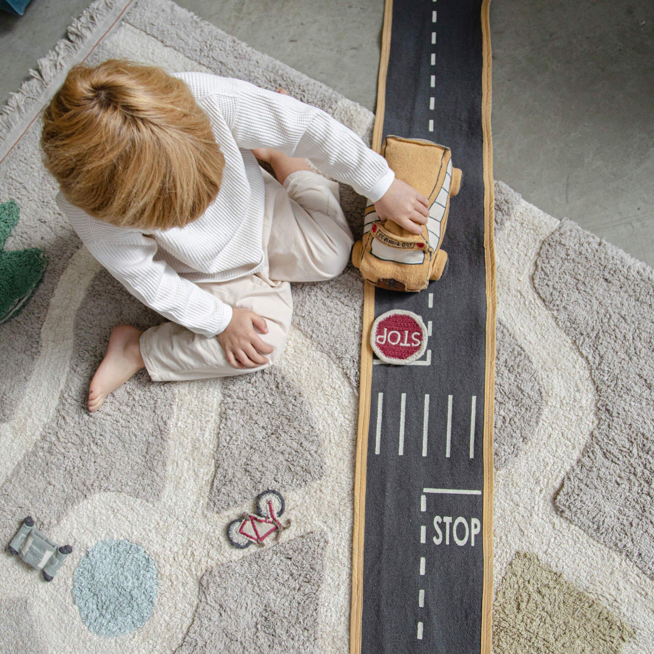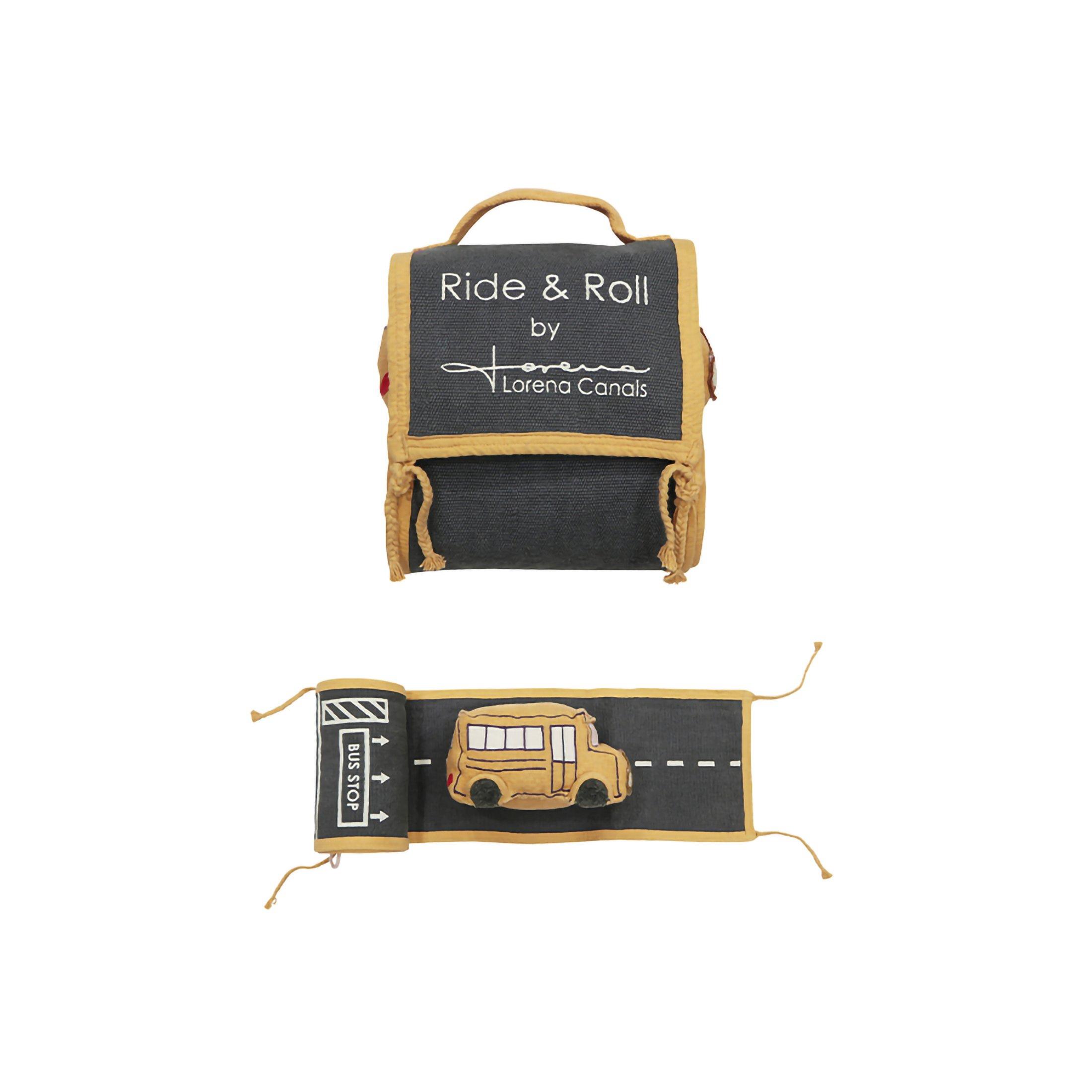 • The Ride & Roll School Bus consists of a soft toy bus made in honey cotton canvas, with windows as patches and embroidered details and headlights. Dark grey cotton pom poms simulate the wheels, and a printed label serves as the license plate. The bus comes rolled up in a 4 mtr long canvas road in Dark grey color, with printed lanes, crosswalks, and a charging area, finished with cotton piping in contrast color at the edges.