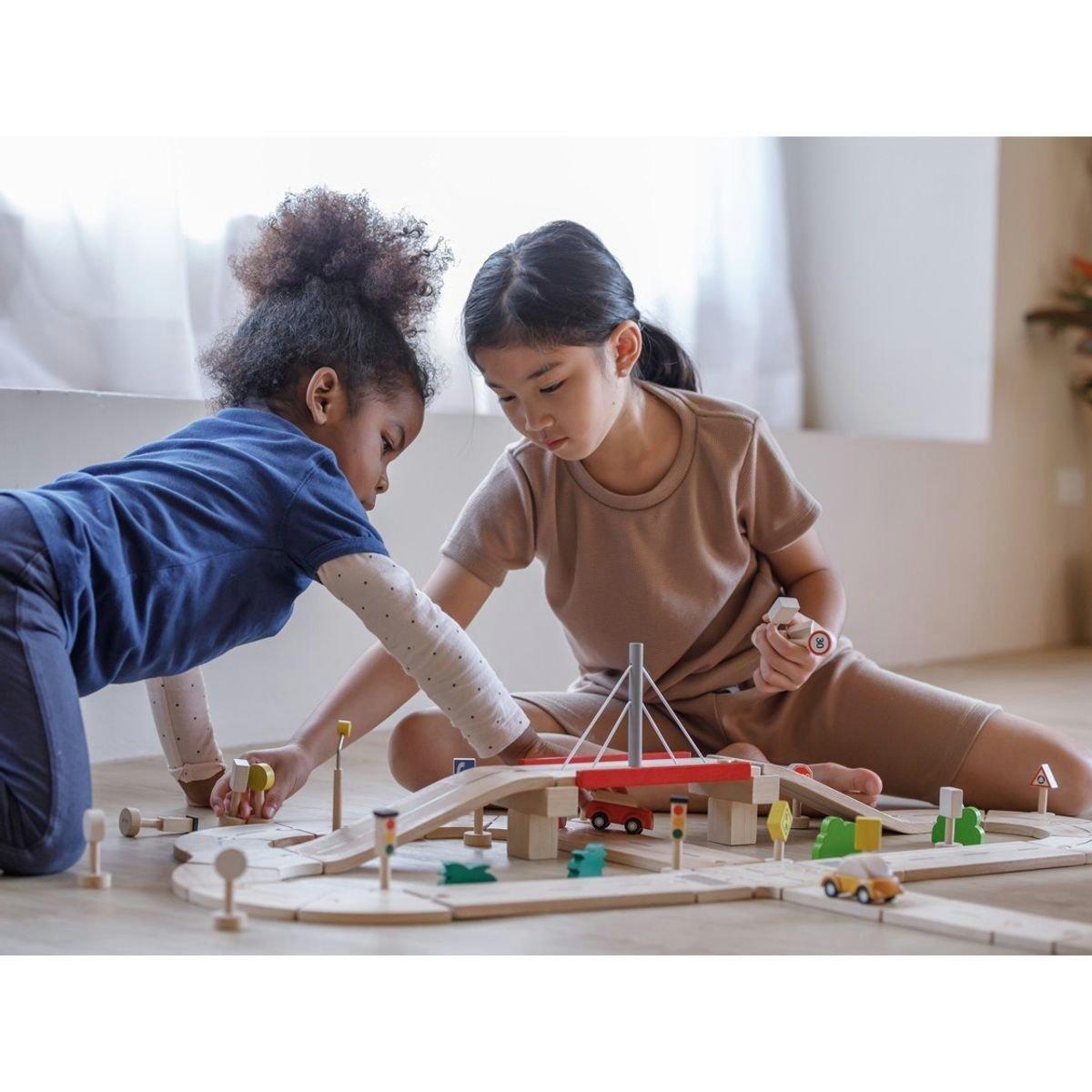 Enhance your pretend-play transportation system with the Road System set! Complete with 27 tracks, 1 bridge, 1 car, 1 lights, and 4 bushes (34 pieces in total), children have everything they need to bring their pretend city to life.