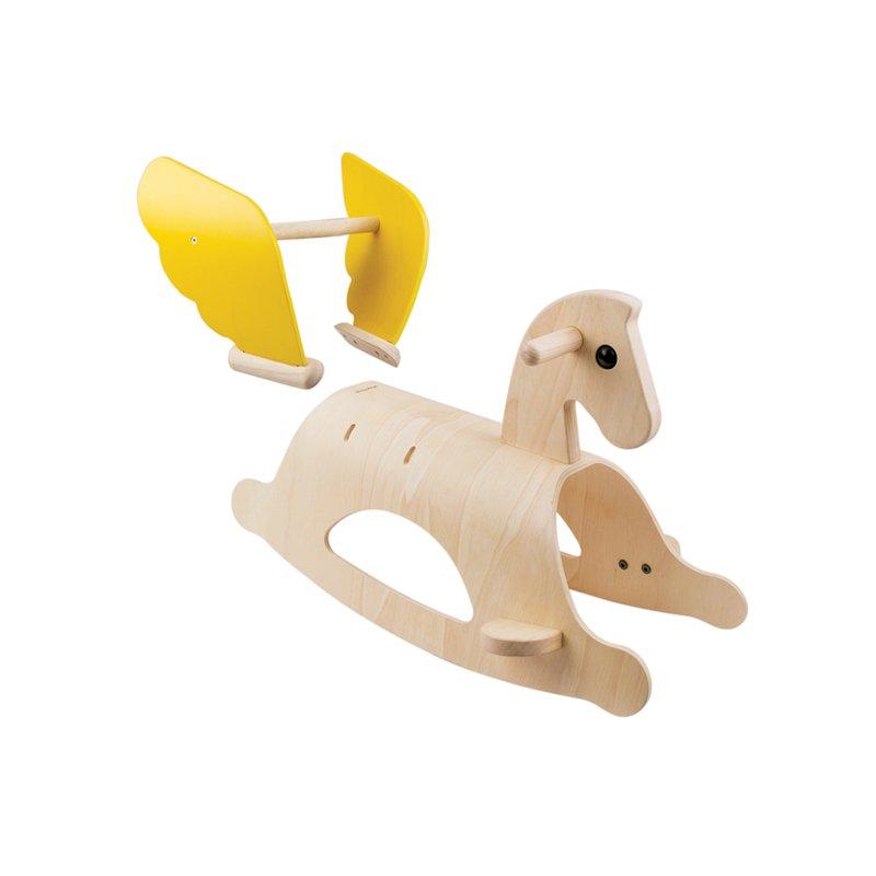 Let’s ride with the Rocking Pegasus! This rocking horse is equipped with brightly colored yellow wings and cup the saddle, footrests, and a comfortable wooden backrest. By simply rocking, children can benefit from the soothing effects of the toy or can find joy in the entertainment provided. The Rocking Pegasus has built-in safety stops on the parallel rocking rails to prevent children from rocking too far forward or back. Sustainably made in Thailand using chemical-free rubberwood, formaldehyde-free glue, organic pigments and water-based dyes..