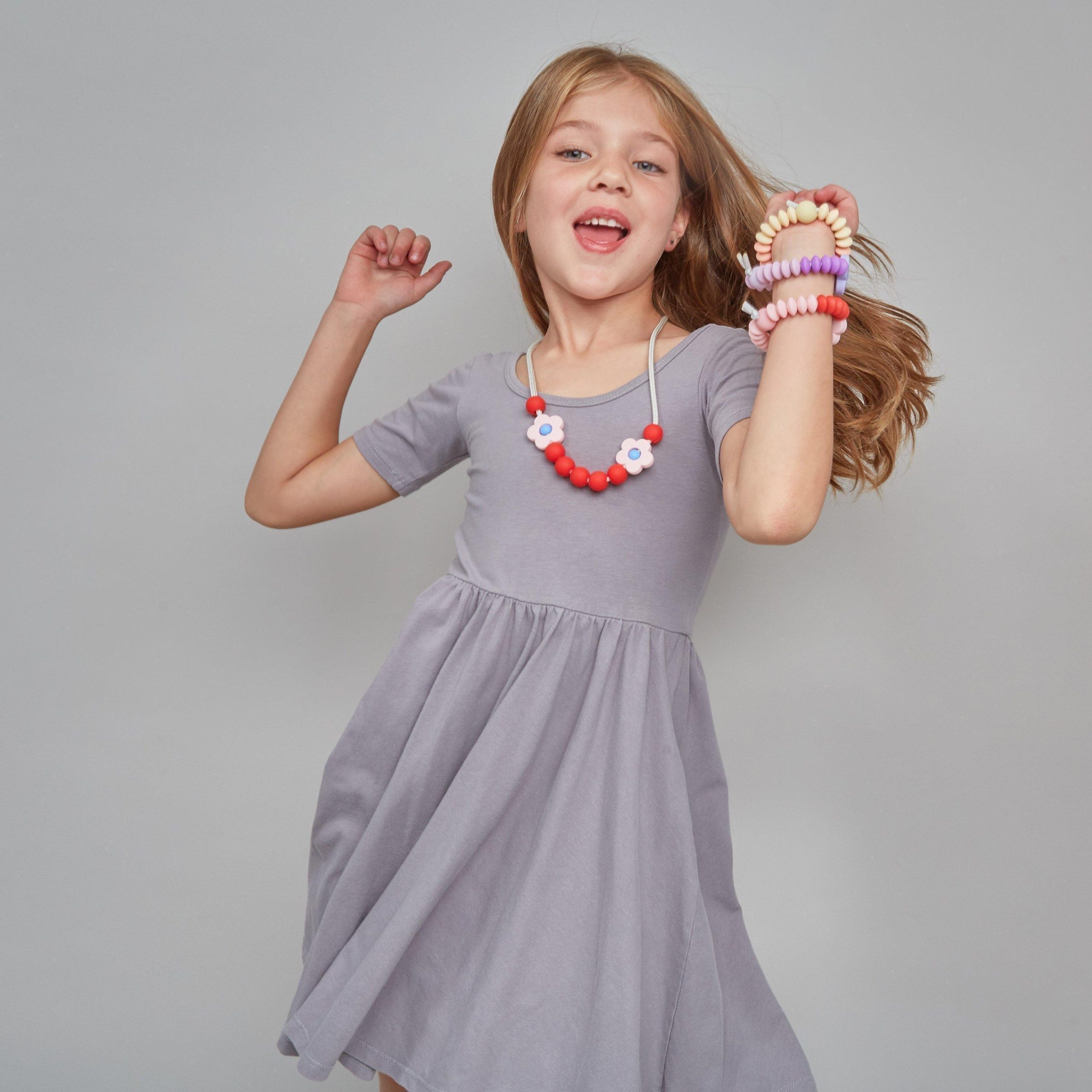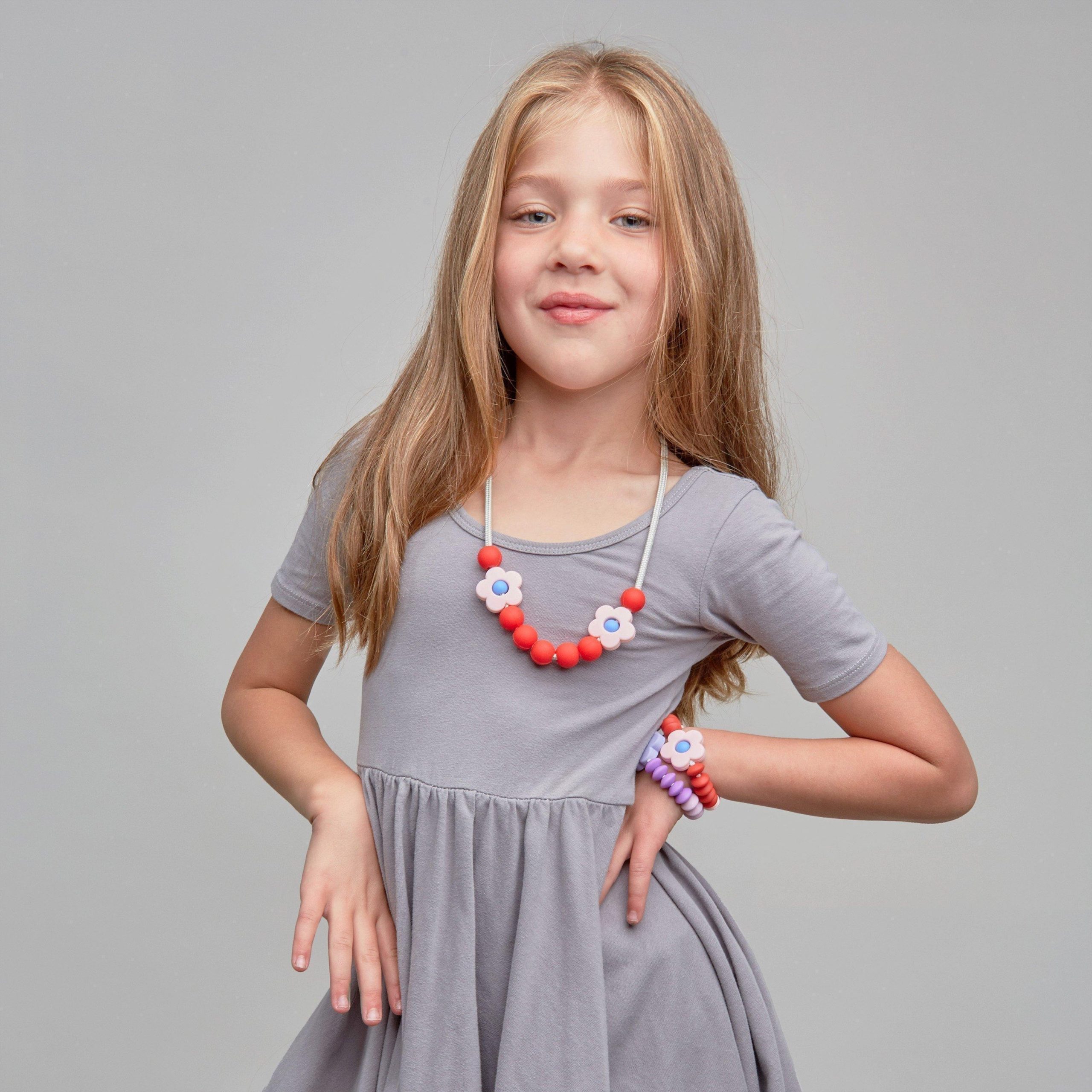 • The perfect pick for flower children and budding style icons, the Daisy Sensory necklace is fidgetable, fashionable, and super fun! Made with 100% non-toxic food grade silicone, Daisy offers dependable support to kiddos with sensory needs, anxiety, extra energy, and emerging molars. Put a little spring in your step and keep some sensory sweetness in your back pocket!