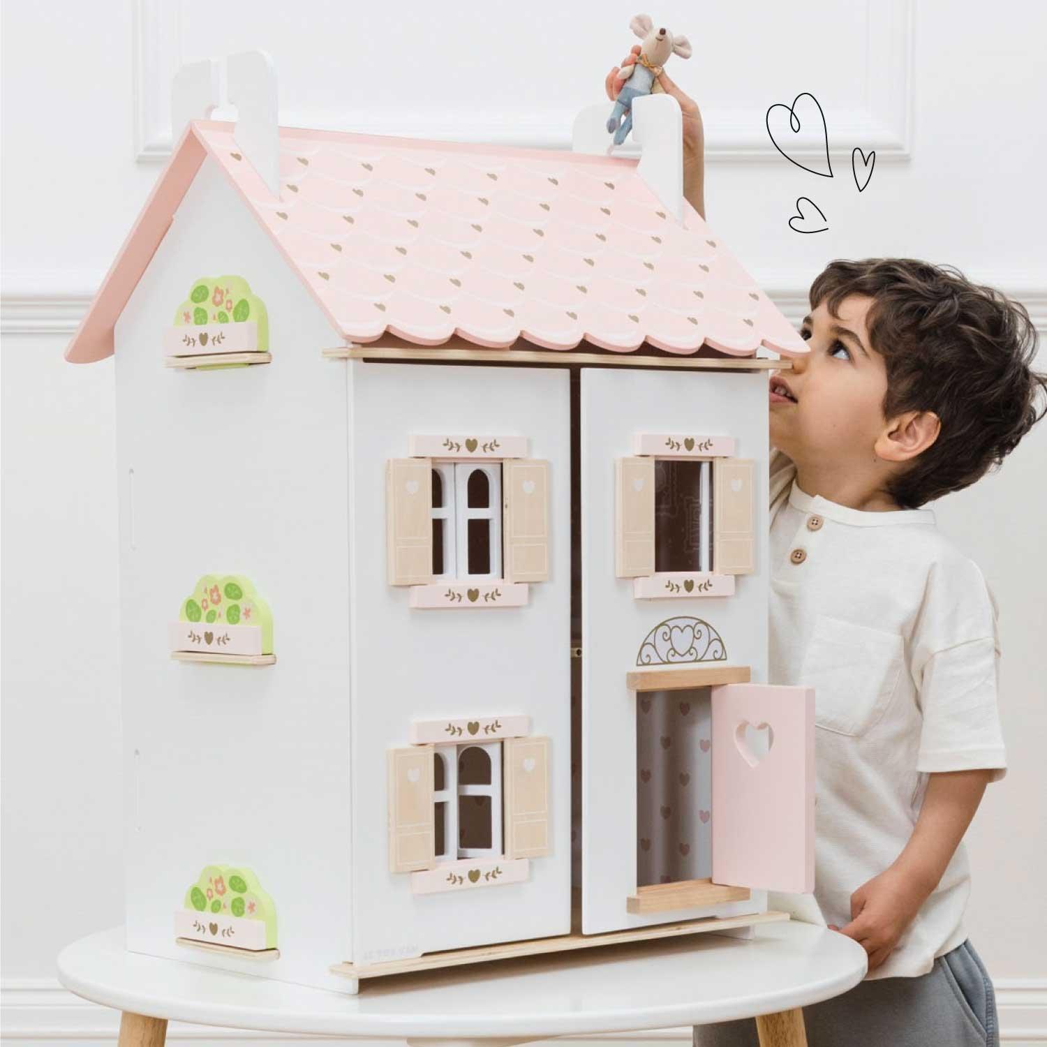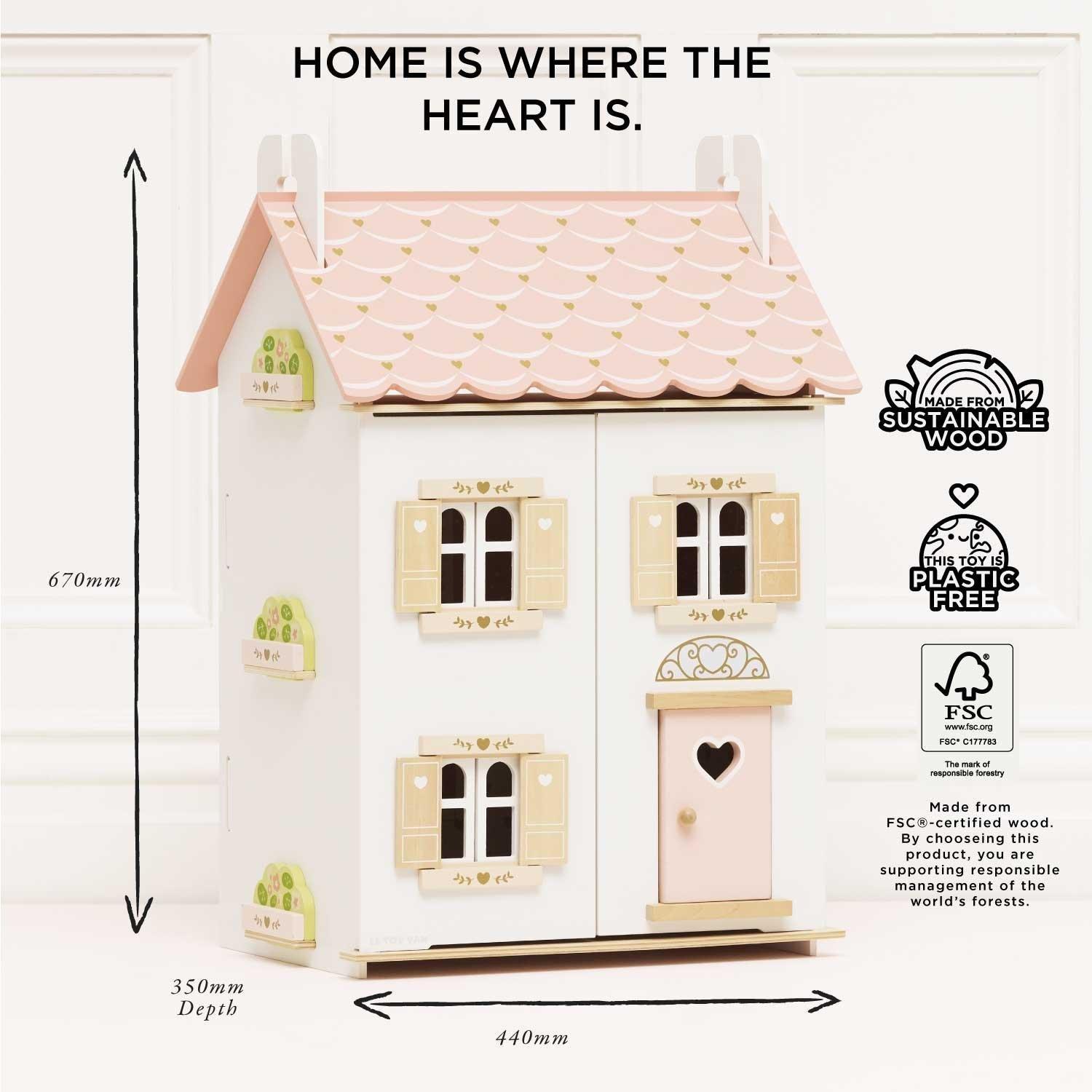• Welcome home. This delightful dolls house makes a stunning gift for a special little someone. Painted in fresh white with soft pink accents and gold heart motifs, it is ready to move right in to.
