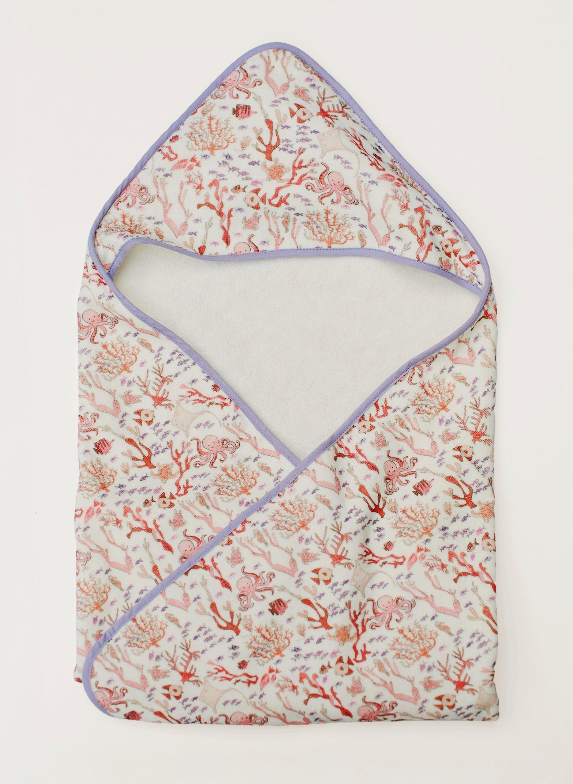 Velour terry finished with lavender binding.