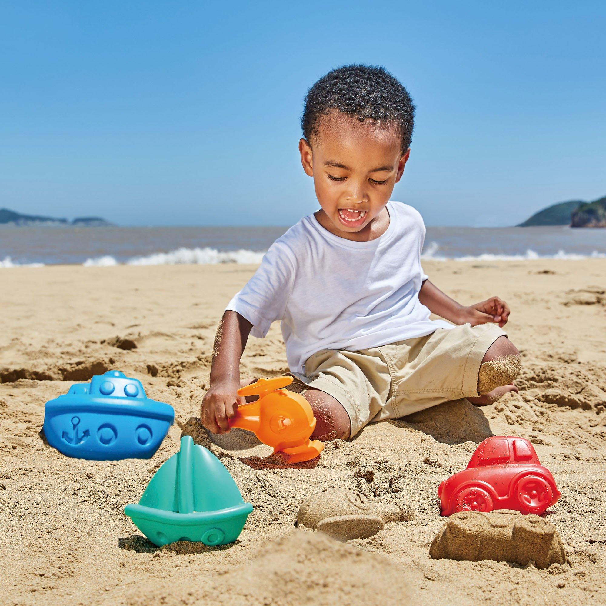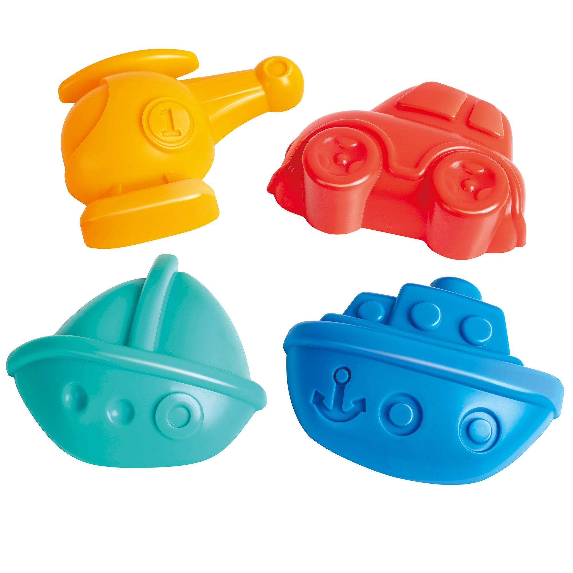 TRAVEL SAND MOLD SET – Fill with sand and press to create unique sand castles. Create tracks with the molds and follow them. Add molded shapes to larger sand castles. Share & exchange sand molds with others to create unusual beach designs. Hit the beach for some fun in the sun! The Hape Travel Sand Toys are perfect for kids who love to play in the sand and the ocean. Load up the car – or the chopper – and go for a ride! The Travel Set includes four pieces: a car, a tugboat, a sailboat, and a helicopter. They act as toys, sand molds, or cups for carrying water to your sand castle! Encourages creative play, healthy outdoor activity, and the development of fine motor skills. Durable child-safe paint finish and solid construction make this a set your child will love for years to come.