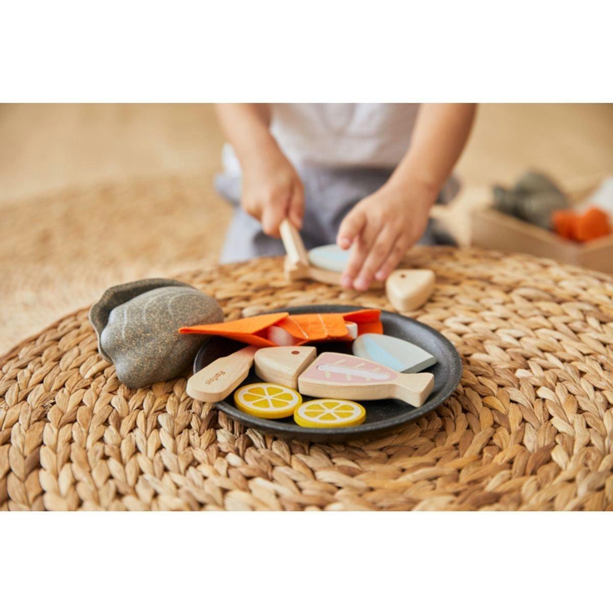Bring the taste of the sea to your young chef’s restaurant with the PlanToys Seafood Platter. The set includes a variety of seafood and utensils to teach children the importance of preparatory work in the kitchen. It features 1 oyster, 1 prawn with a peel-away shell, 1 sliceable fish, 2 lemons, 1 oyster knife, 1 fillet knife, and 1 plate. Combine this set with other PlanToys pretend foods and kitchenware for a five-star restaurant experience.