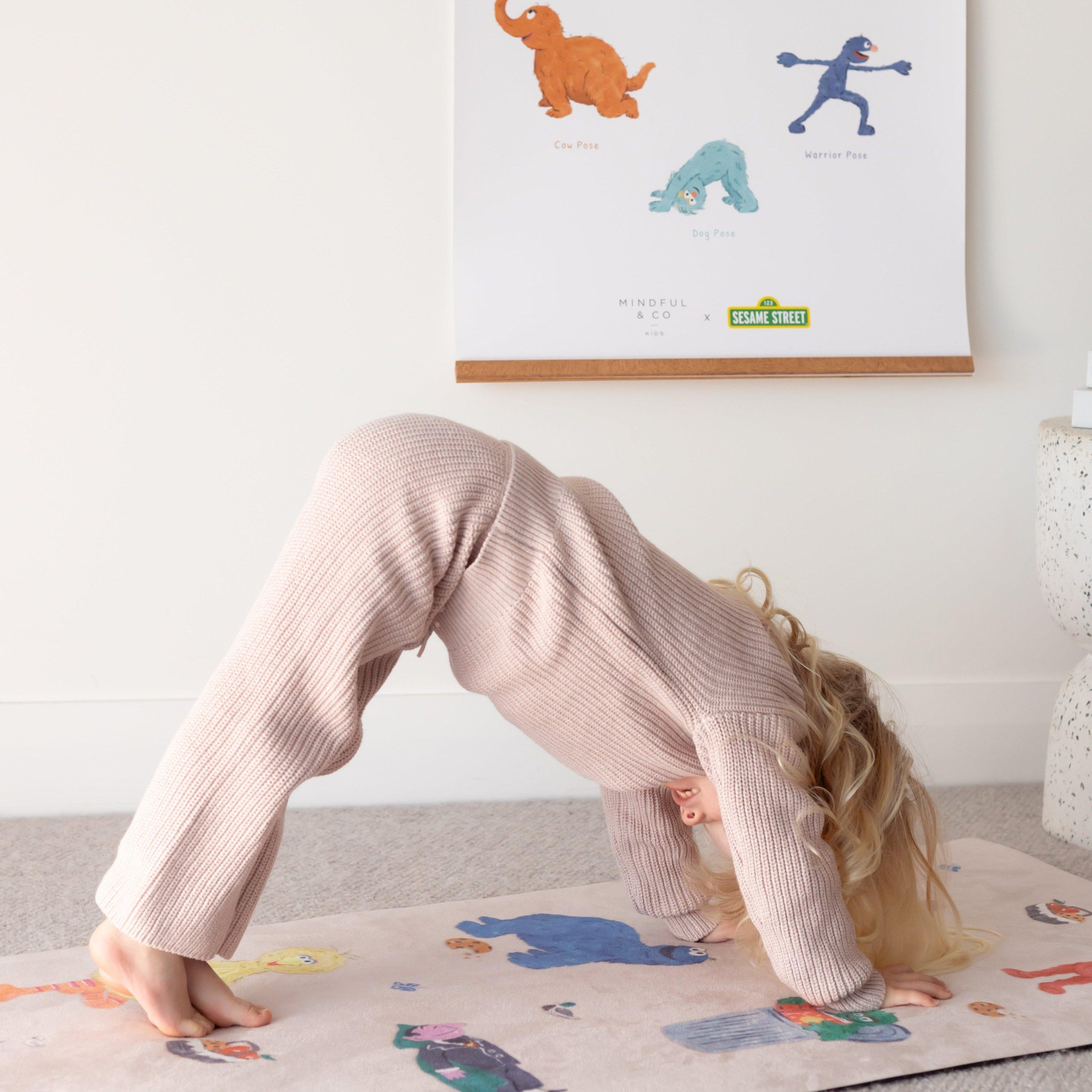 Transform your child’s daily routine with the joy and wisdom of Sesame Street yoga. The bundle includes the NEW Double-Sided Sesame Street Yoga Poses Print, Kids Yoga Mat in Sesame Street Print, and Wooden Print Hanger – the best way to display your print.
