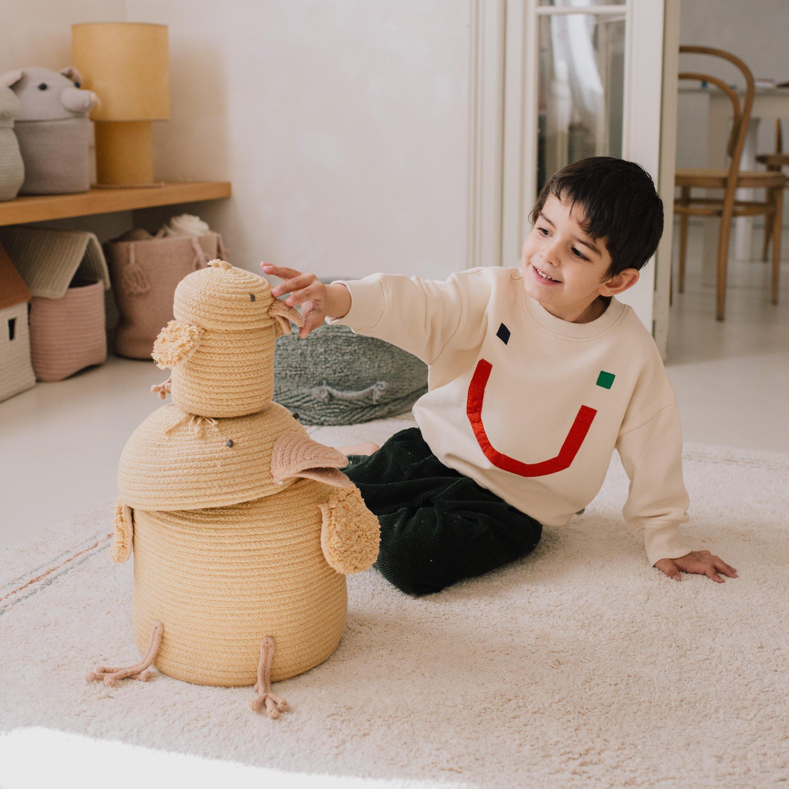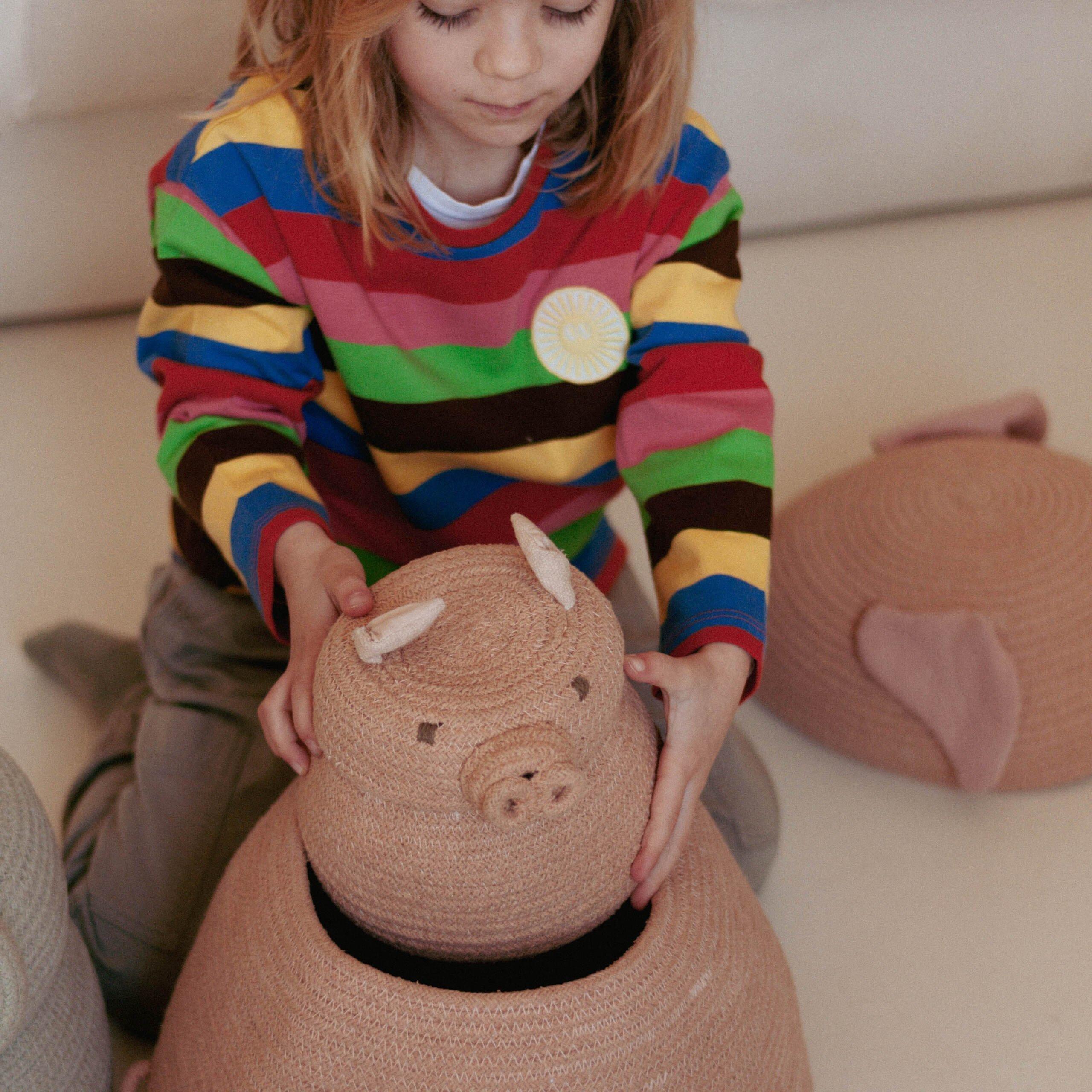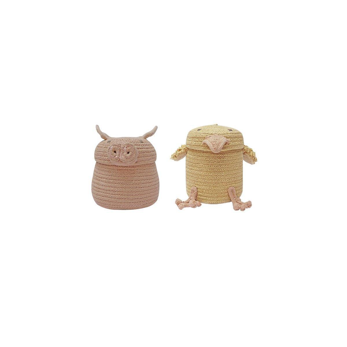 A set of two mini versions of our popular Charlie the Chicken basket and Peggy the Pig! The baskets are carefully handcrafted using a braided cotton ropes in Sandstone and Honey colors respectively, with added details in cotton canvas.