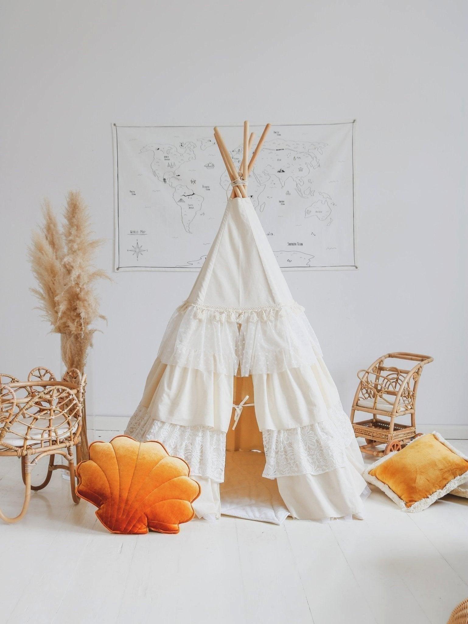 • Perfect for epic outdoor adventures or rainy-day indoor playdates, our adorable teepee tents give kids a peaceful place to hide out and let their imaginations run wild.Your little adventurer may spend long hours exploring the world and playing, but upon return he or she needs a place to rest, eat, and make plans for further adventures. A teepee literally means a dwelling, and is a word used by the Sioux, the indigenous people of the Great Plains. It is a space for all kinds of fun. When the play is finished, you can pack the teepee back in the cover and put it away, for example, in the corner of the room. It does not take much space when folded, and the cover enables you to easily take it outdoors. There is a pocket inside where children can hide their toys, books and other treasures. PART OF THE CIRCUS TIME! COLLECTION The teepee is part of our circus-themed vivid collection, specifically created to enliven any child’s room or bedroom. Our powder-coloured “Powder Frills” teepee, firmly sewn from thick cotton fabric, decorated with beautiful linen frills in beige, caramel and blue colours. Perfect for little royalty! Made of natural materials: 1% cotton, 1% linen fabrics and pine poles. Thanks to its five-wall structure, the tent is stable when it is put up, the poles are rounded and placed in tunnels sewn together at the bottom. The teepee is perfect to use at home, in the garden or at the beach. The set includes a play tent, poles and a cotton cover. Feel free to complement it with our beautiful decorations and accessories. Fabric: 1% cotton, 1% linen OEKO-TEX® certified. Fabric weight: 7.67 Washing temperature: up to 86°F. Pine poles: 7.9 in. Height when put up: 66.9 in. Base diameter: 47/52 in. <span style="font-weight: 4;" <span Your little adventurer may spend long hours exploring the world and playing, but upon return he or she needs a place to rest, eat, and make plans for further adventures. A teepee literally means a dwelling, and is a word used by the Sioux, the indigenous people of the Great Plains. It is a space for all kinds of fun. When the play is finished, you can pack the teepee back in the cover and put it away, for example, in the corner of the room. It does not take much space when folded, and the cover enables you to easily take it outdoors. There is a pocket inside where children can hide their toys, books and other treasures. PART OF THE BOHO STYLE COLLECTION This amazing “Shabby Chic” teepee with frills is firmly sewn from thick cotton fabric. Its delicate beige tones of cotton, tulle and lace are arranged in numerous frills. What an elegant decor for a little dreamer’s royal chamber! Made of natural materials: 1% cotton fabric and pine poles. Thanks to its five-wall structure, the tent is stable when it is put up, the poles are rounded and placed in tunnels sewn together at the bottom. The teepee is perfect to use at home, in the garden or at the beach. The set includes a play tent, poles and a cotton cover. Feel free to complement it with our beautiful decorations and accessories. Fabric: 1% OEKO-TEX® certified cotton. Fabric weight: 7.67 Washing temperature: up to 86°F. Pine poles: 7.9 in. Height when put up: 66.9 in. Base diameter: 47/52 in.