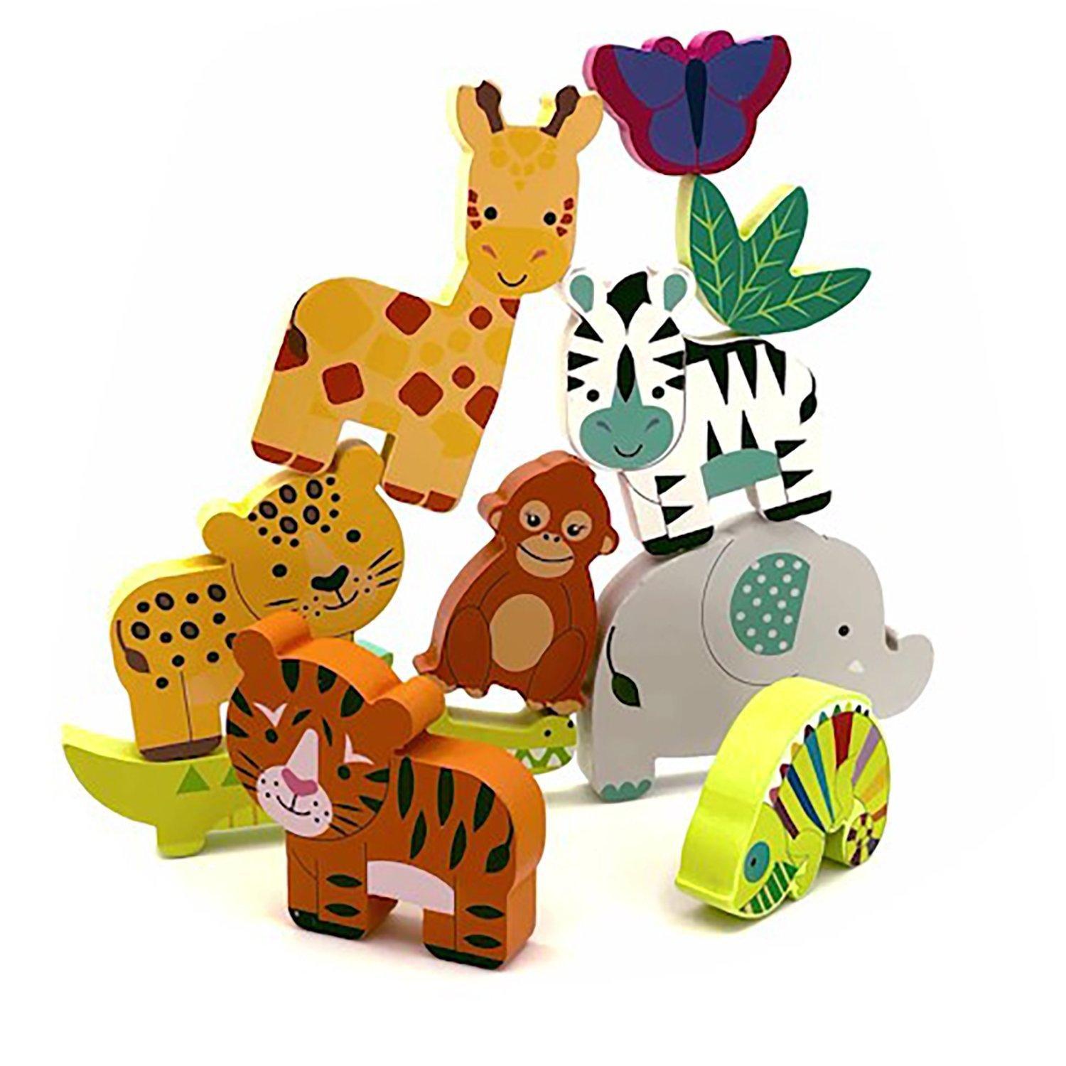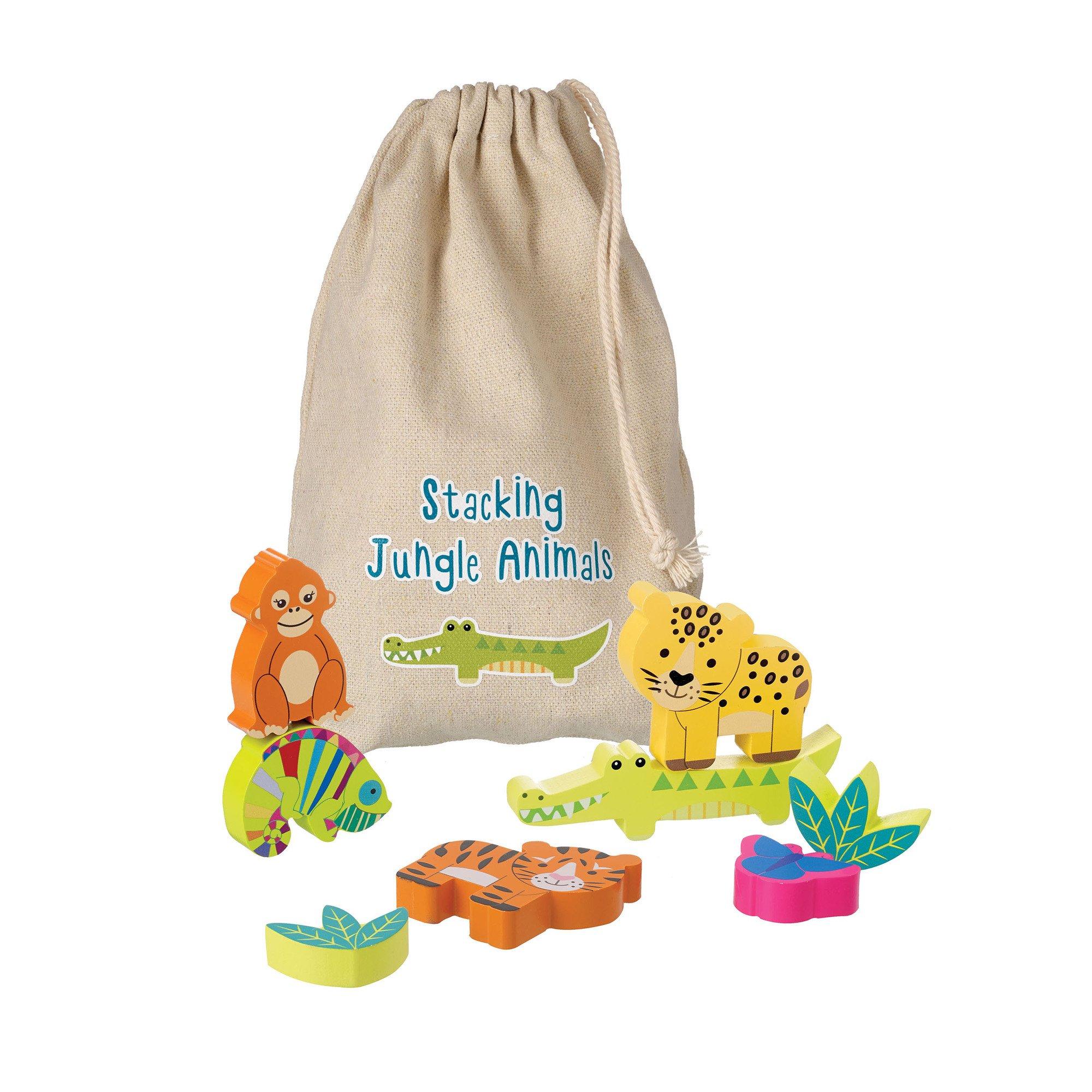 FUN STACKING BLOCKS: Stack up & knock back down! This set of 12 jungle blocks can be stacked in a wide variety of ways. Brightly colored and intricately designed to resemble popular jungle creatures Includes a storage drawstring bag for your pieces.