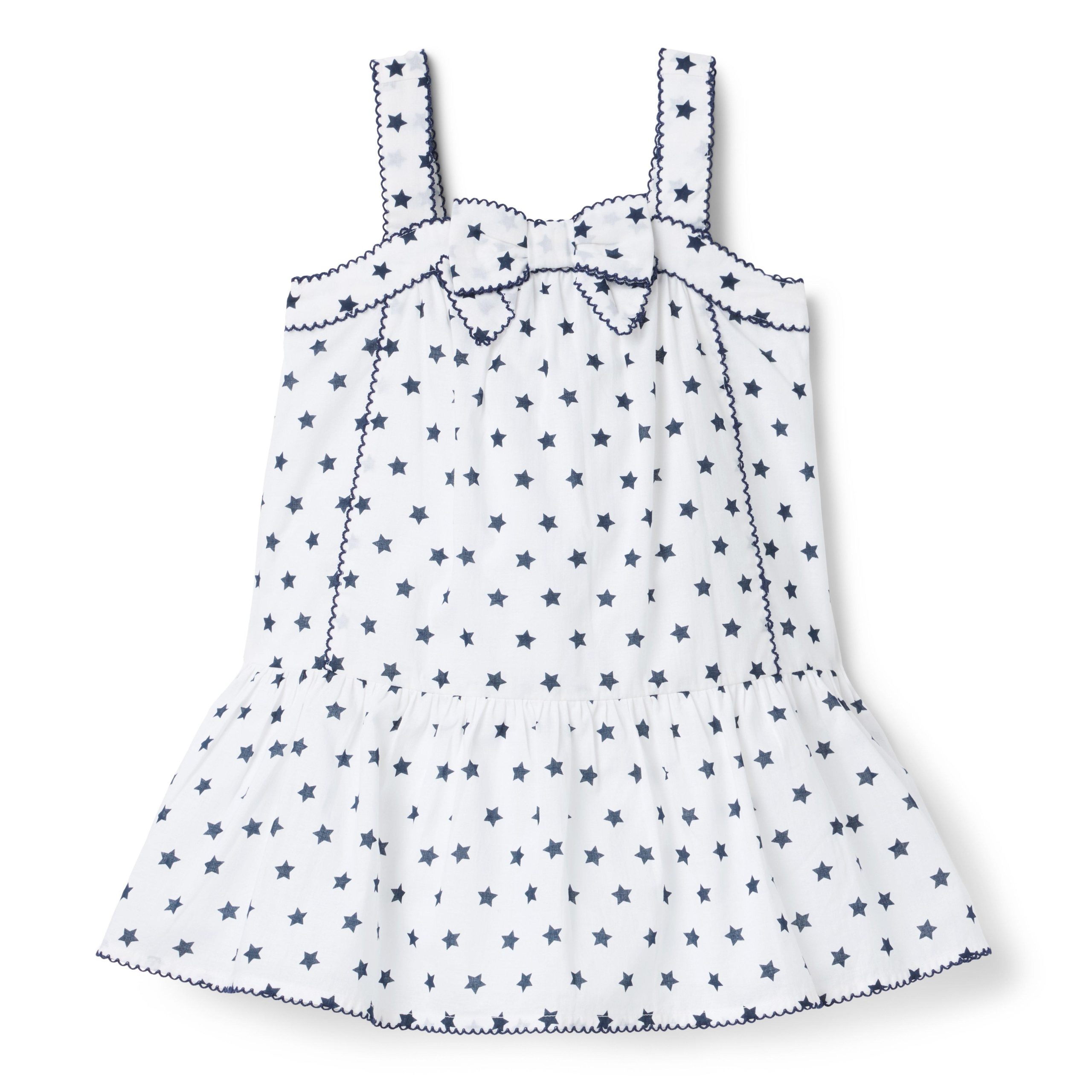 • Reach for the stars—and this dropwaist dress too. Designed in an allover star print with picot trim and a bow, of course.