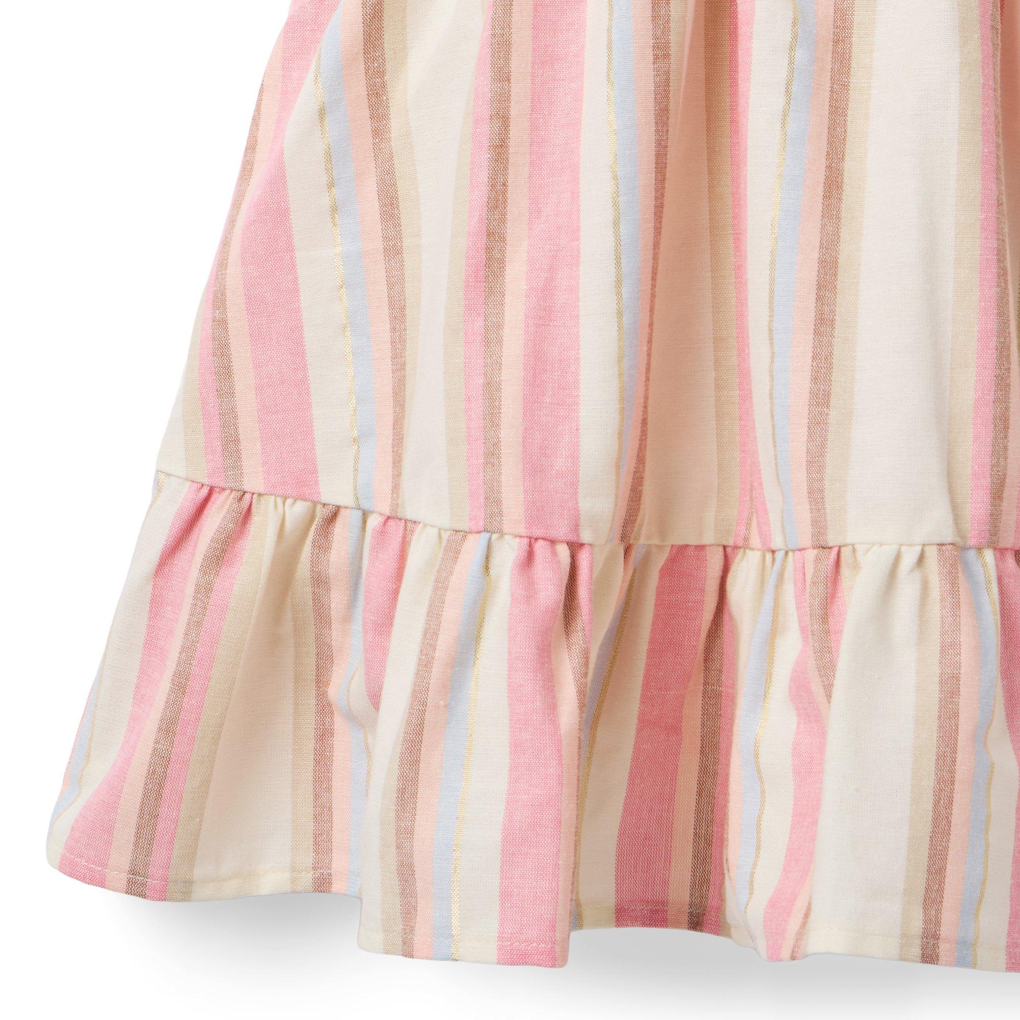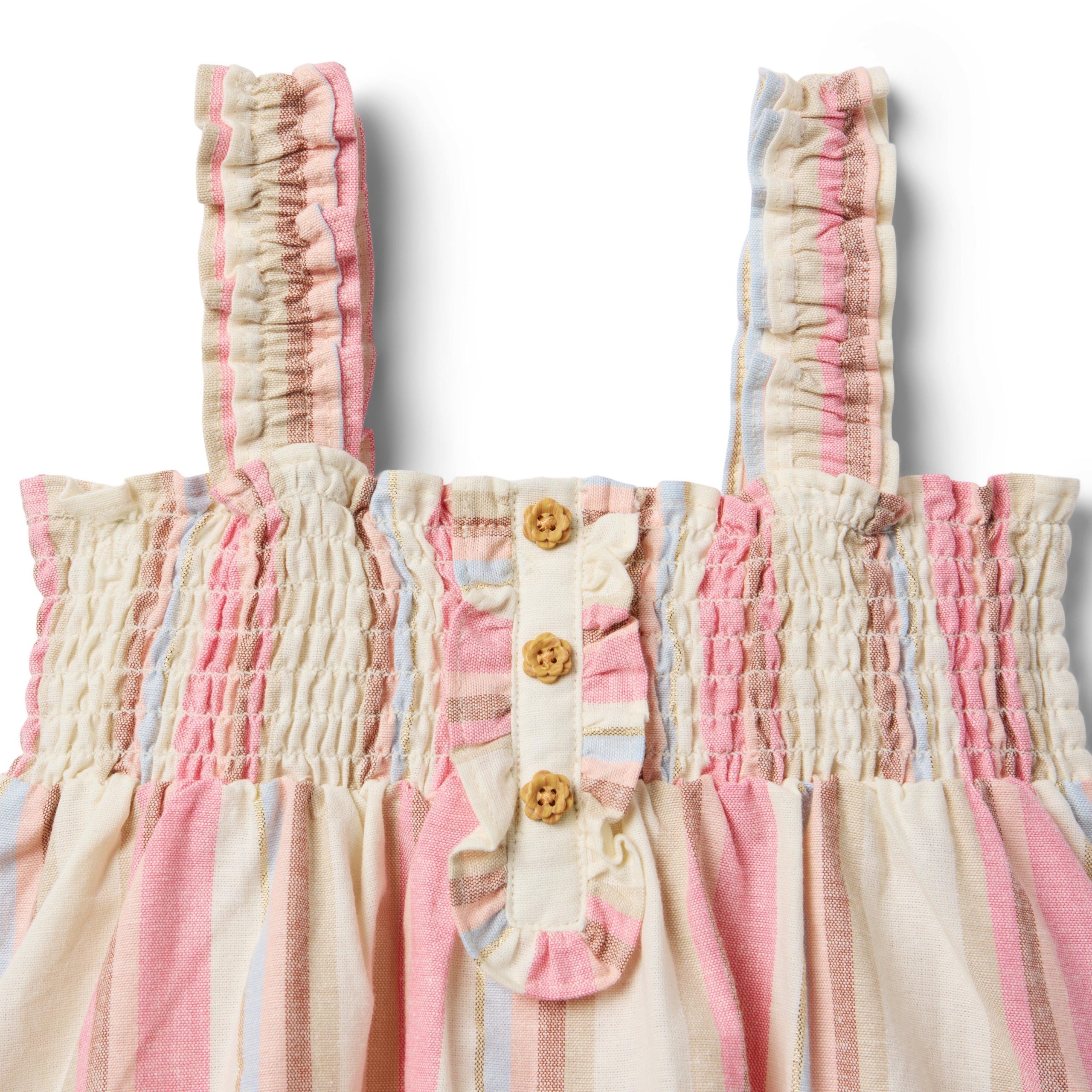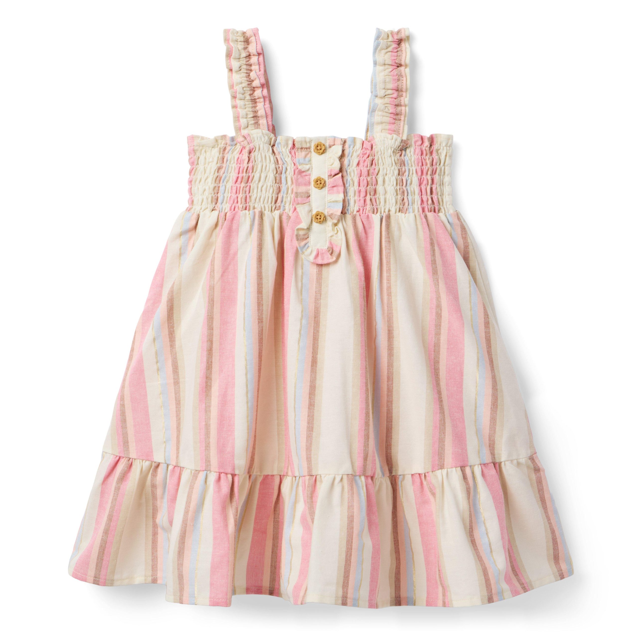 • Stripes, ruffles and a hint of shine? Our linen-cotton dress has it all. Plus, a smocked bodice and button details too.