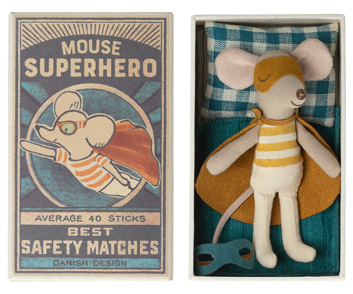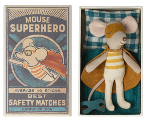 A classic Maileg item. This mouse is ready for hours of play and sleeps tight in a little matchbox. The clothes and bed linen come in unique prints and beautiful colors. Two face masks included – one for flying and one for sleeping.