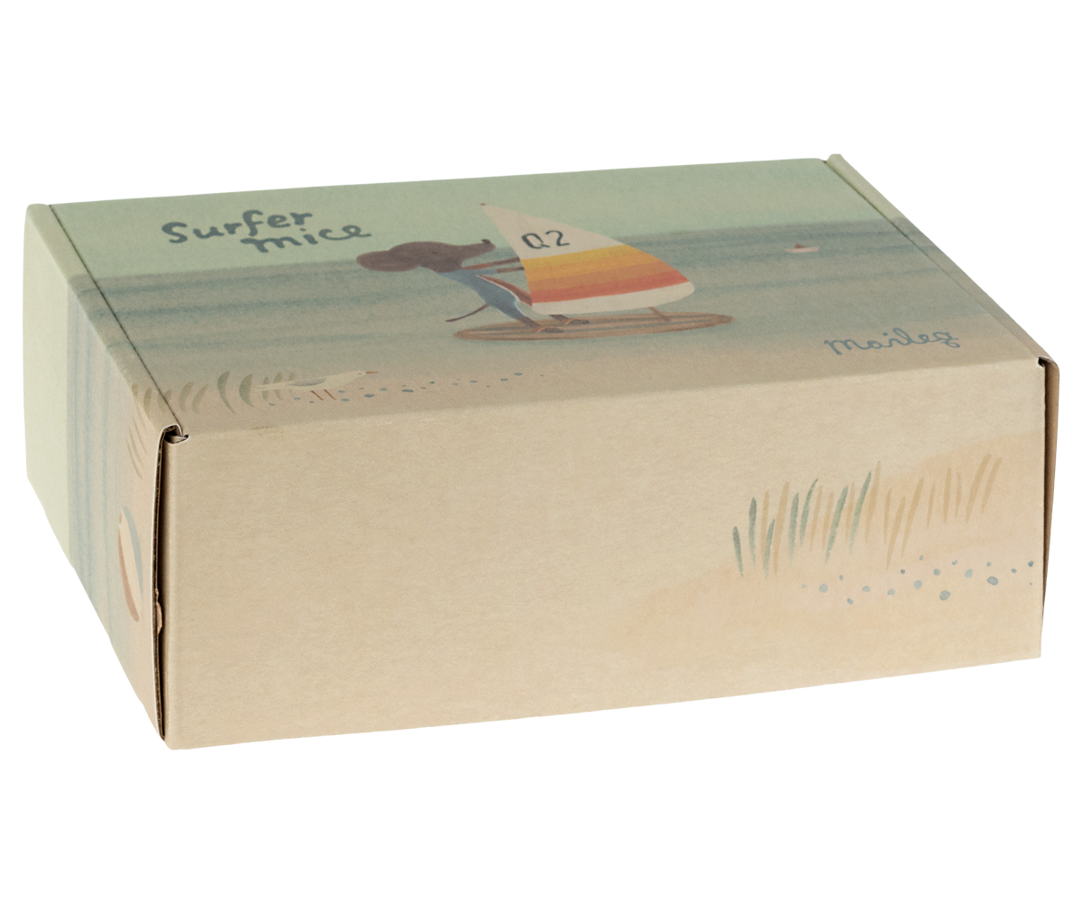 Surfer big brother is the instructor for his two pupils: little brother and sister surfer mice. He’s wearing an instructor wetsuit that is dusty red and aqua. The wetsuit keeps him safe and warm in the cool water and waves. He also has a speckled visor to keep the sun out of his eyes so he can see. His wooden surfboard has mint blue and white stripes with a colorful ‘Q2’ sail. The board includes two elastic straps at the bottom so he can keep his feet in place. Big brother surfer also has magnetic hands, so he can steer his sail wherever he wants to go!