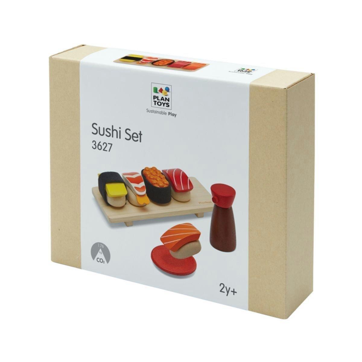 • Pretend play as a sushi chef with the PlanToys Sushi Set! While developing creative thinking and fine motor skills, hand-eye coordination and more, children can serve up sushi dinner for the whole family. Complete with salmon roe made from PlanWood, tamago, shrimp with a rubber tail, tuna and salmon – 2 sheets of seaweed can be wrapped around the included pieces of rice for a realistic feature! A sushi tray, shoyu bottle and sauce dish add even more dynamic.