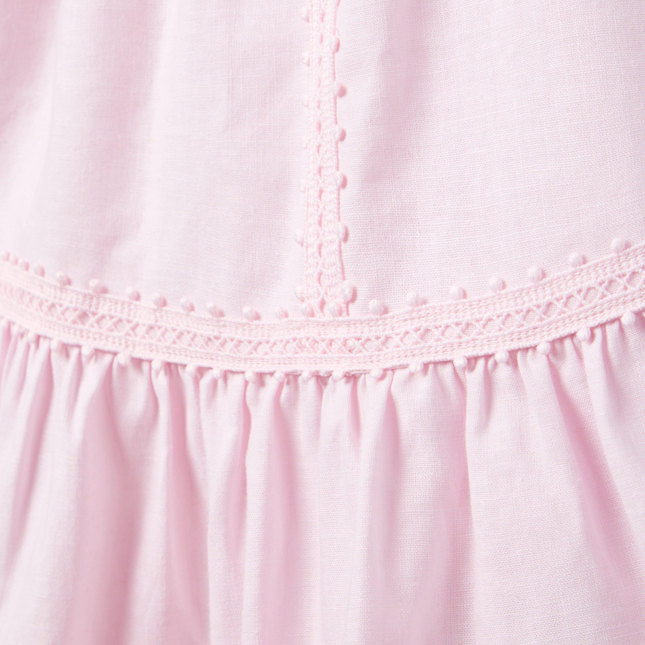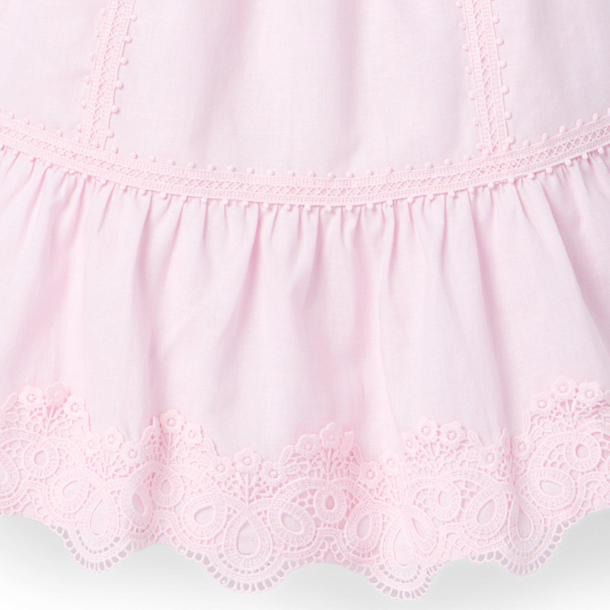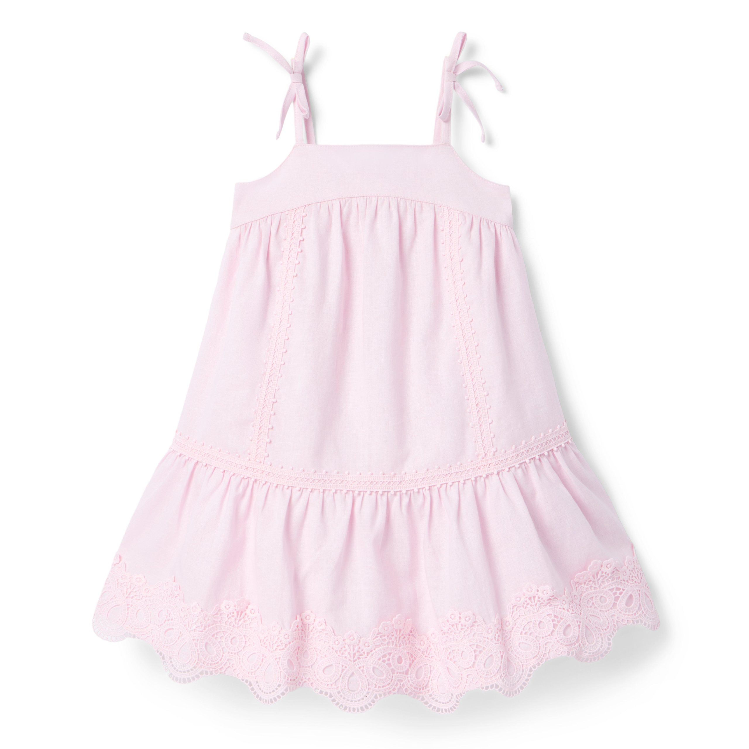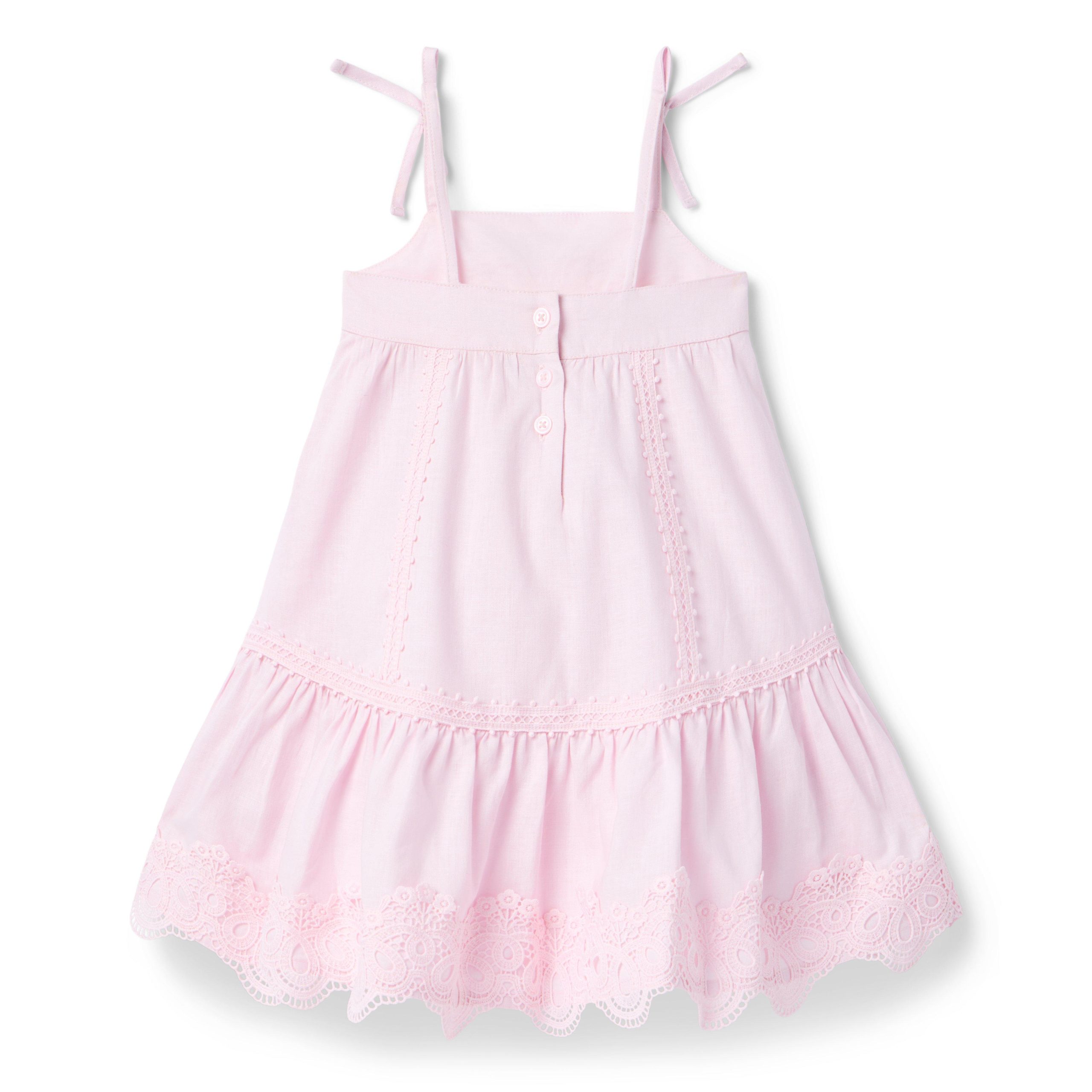 • The dress for any destination, from vacations to staycations and everything in between. Designed in breezy linen-cotton with all the details to love, like floral lace hem, dot trim and bow straps too.