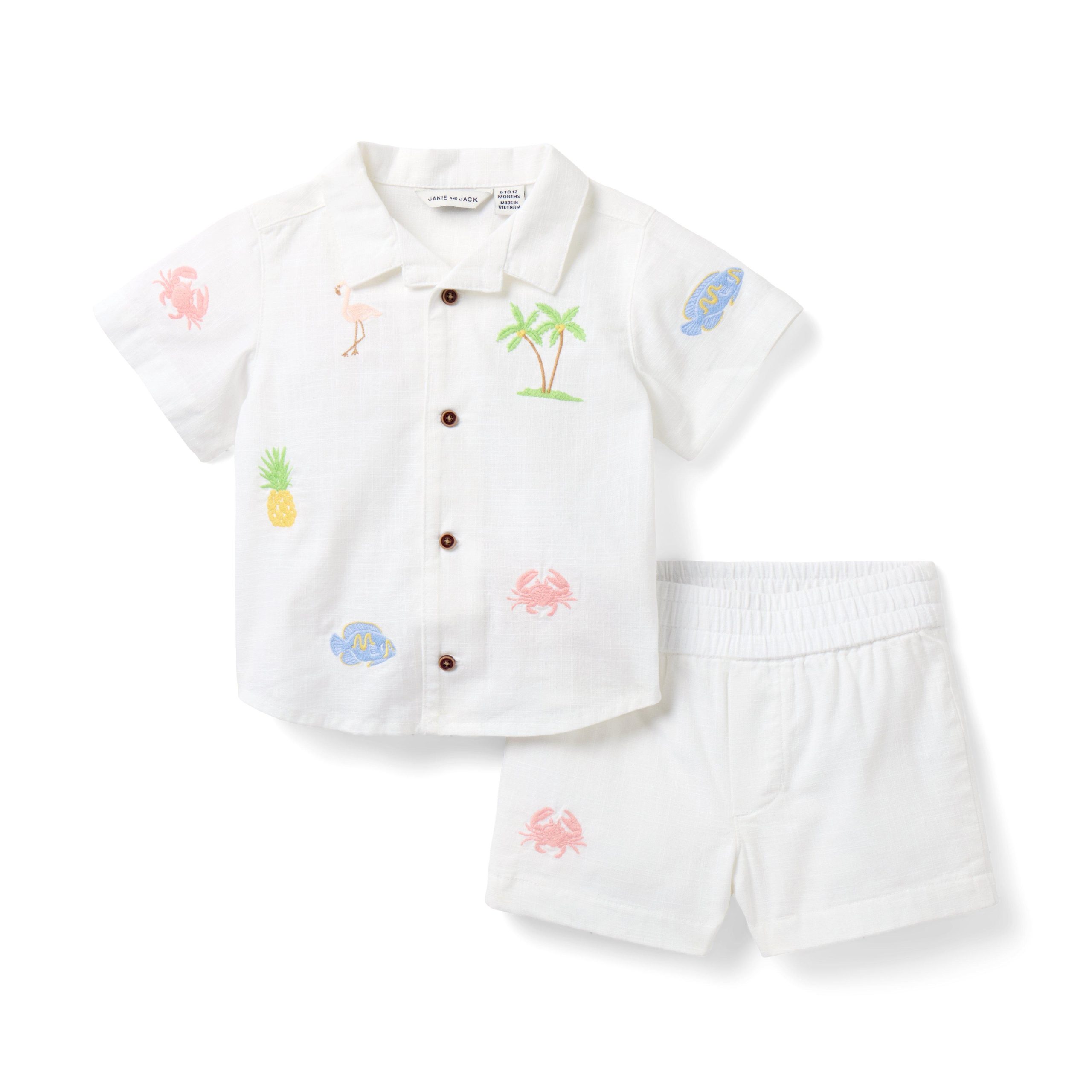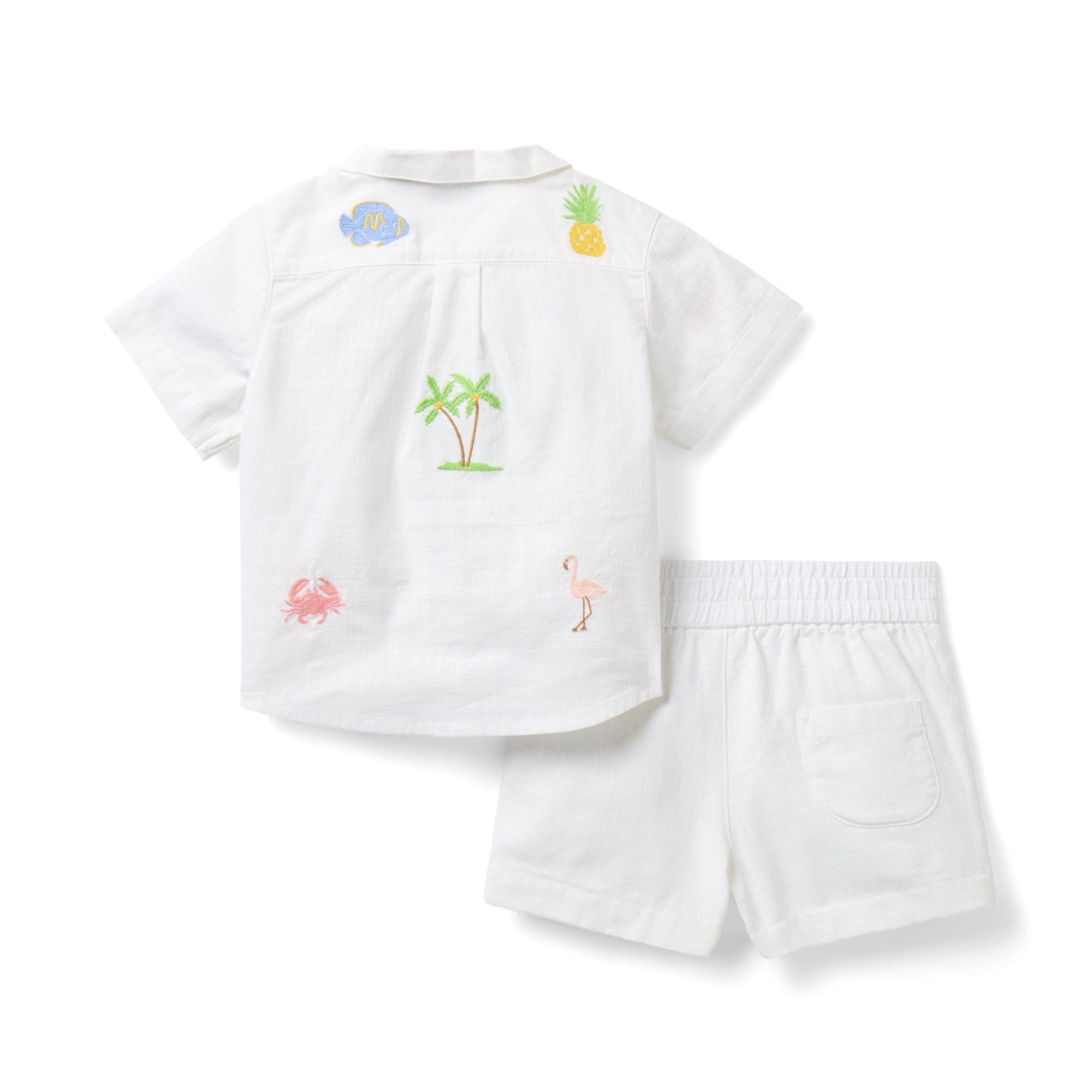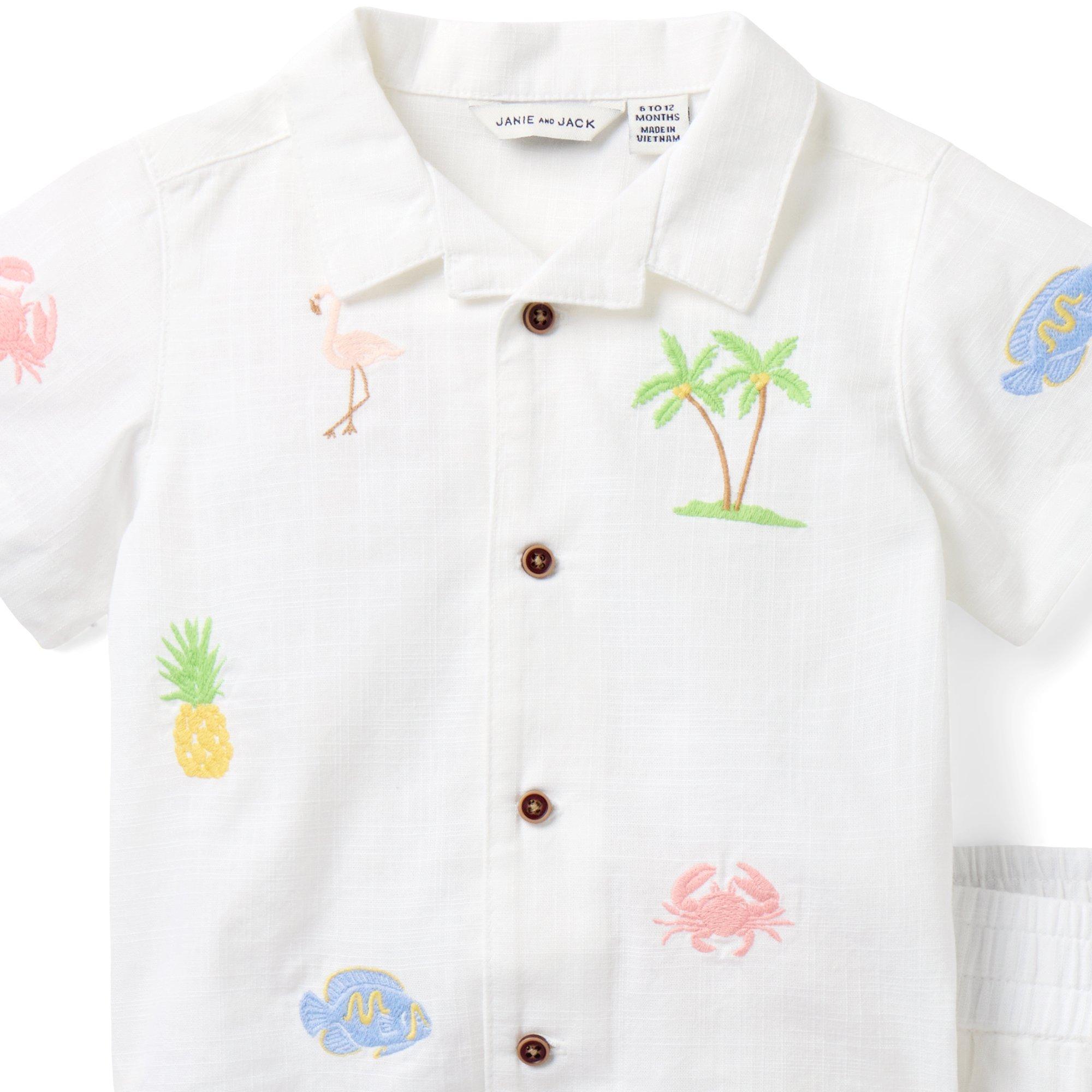 • Embroidered tropical friends make the perfect match for baby’s first sunny days. Designed in soft linen-cotton with a little back pocket, just because.